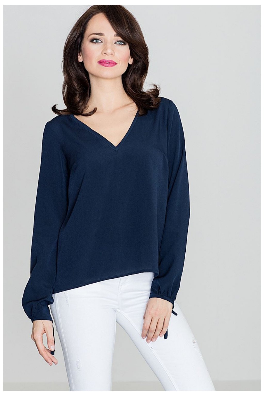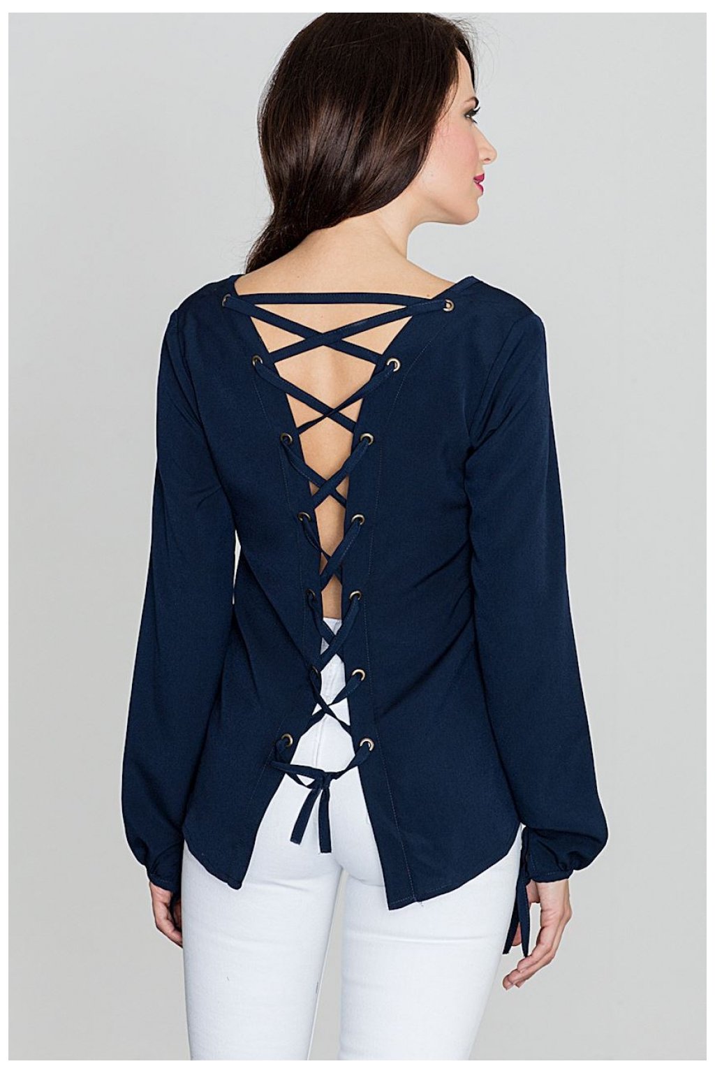 Dámská halenka s dlouhými vázanými rukávy, malým výstřihem a nápadným zavazováním na zádech.