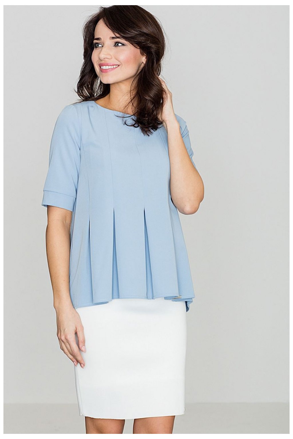 Mírně nadměrný tvar umožňuje zakrýt nedokonalosti těla. Linie s jemně prodlouženým zadním dílem, krátké rukávy zakončené manžetou. Kulatý výstřih, přiléhající ke krku, zapínání na zádech na krytý zip. Kontrastní záhyby na přední straně.