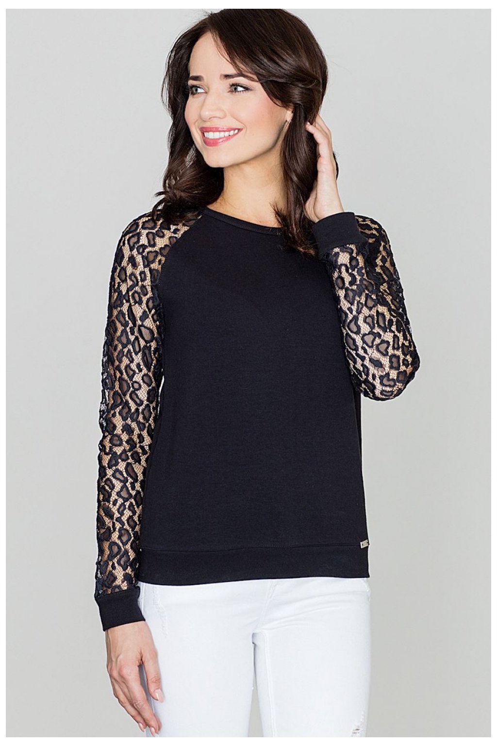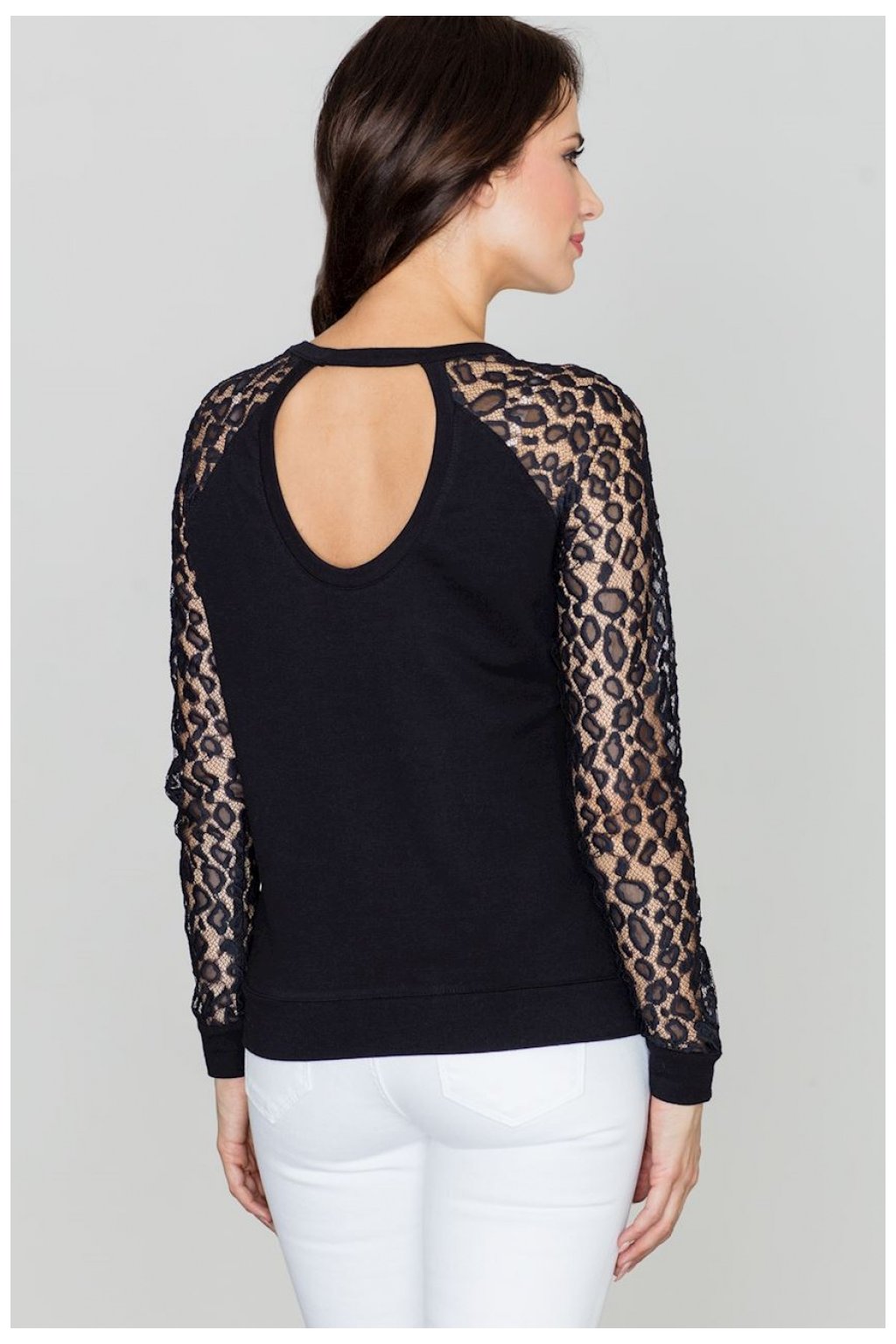 Rukávy z krajky s leopardím potiskem. Díky nim bude halenka vhodná i pro náročnější příležitosti. Spodní část a rukávy zakončené manžetou, nošené přes hlavu s výřezem ve tvaru slzy na zádech. Halenka věnovaná módním nadšencům.
