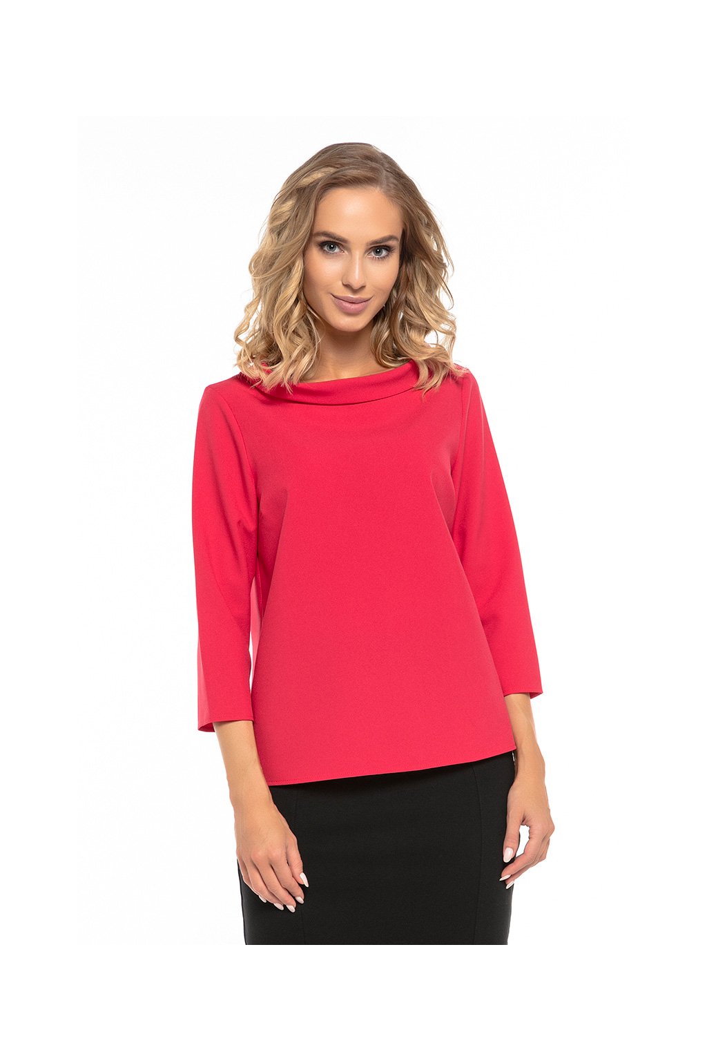 Elegantní tkaná halenka s límečkem ve stylu Jackie Kennedy. Jemný poloviční golf u výstřihu, límeček na zádech. V zadní části mírně vykrojené. Halenka s 3/4 rukávy, ideální k sukni i ke kalhotám.