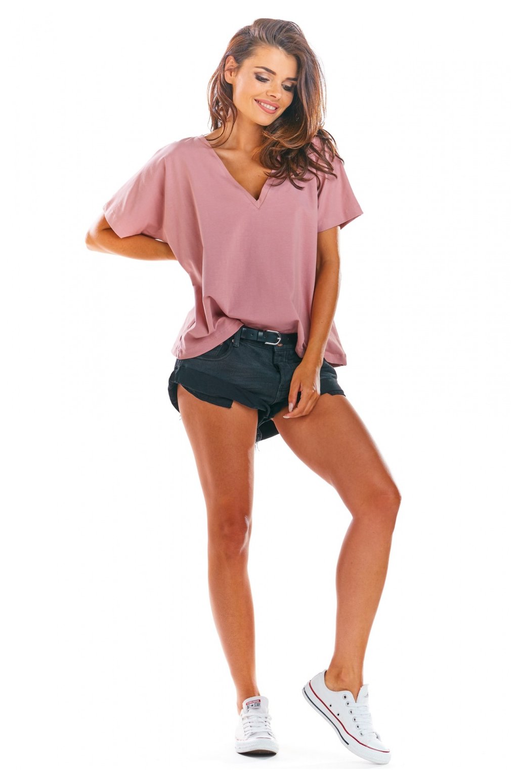 Volné tričko s hlubokým výstřihem. Ideální pro každodenní styling. Výstřih ve tvaru V, který lze nosit vpředu i vzadu. Podle toho, zda chcete zdůraznit prsa nebo záda. Výrobek vyrobený v Polsku.
