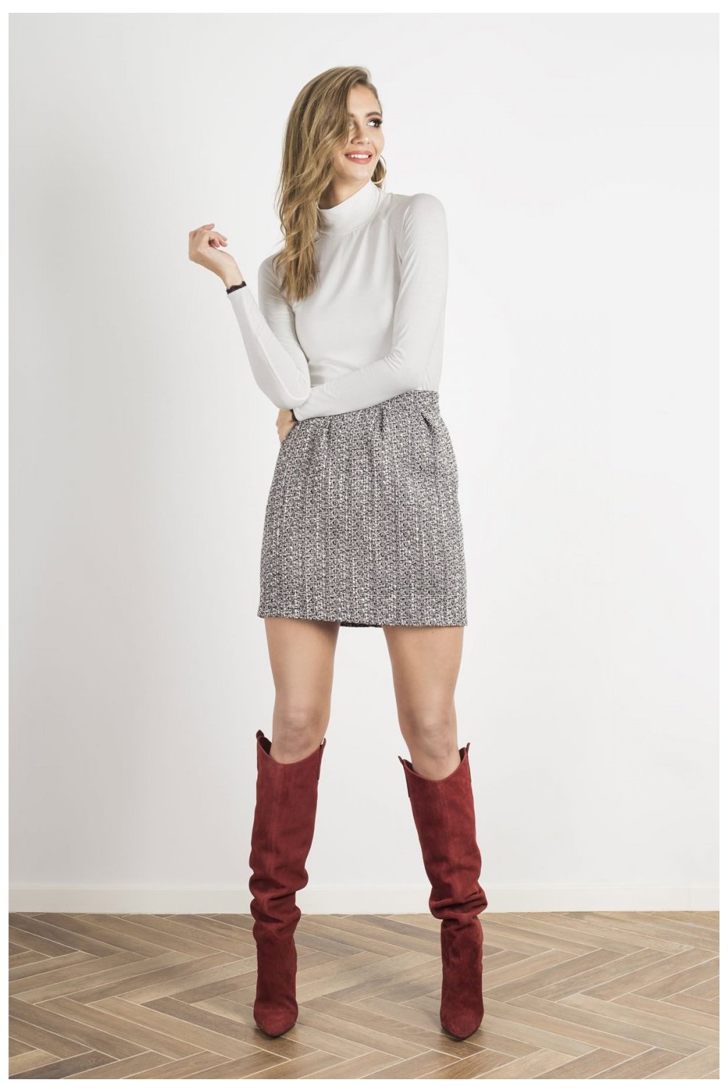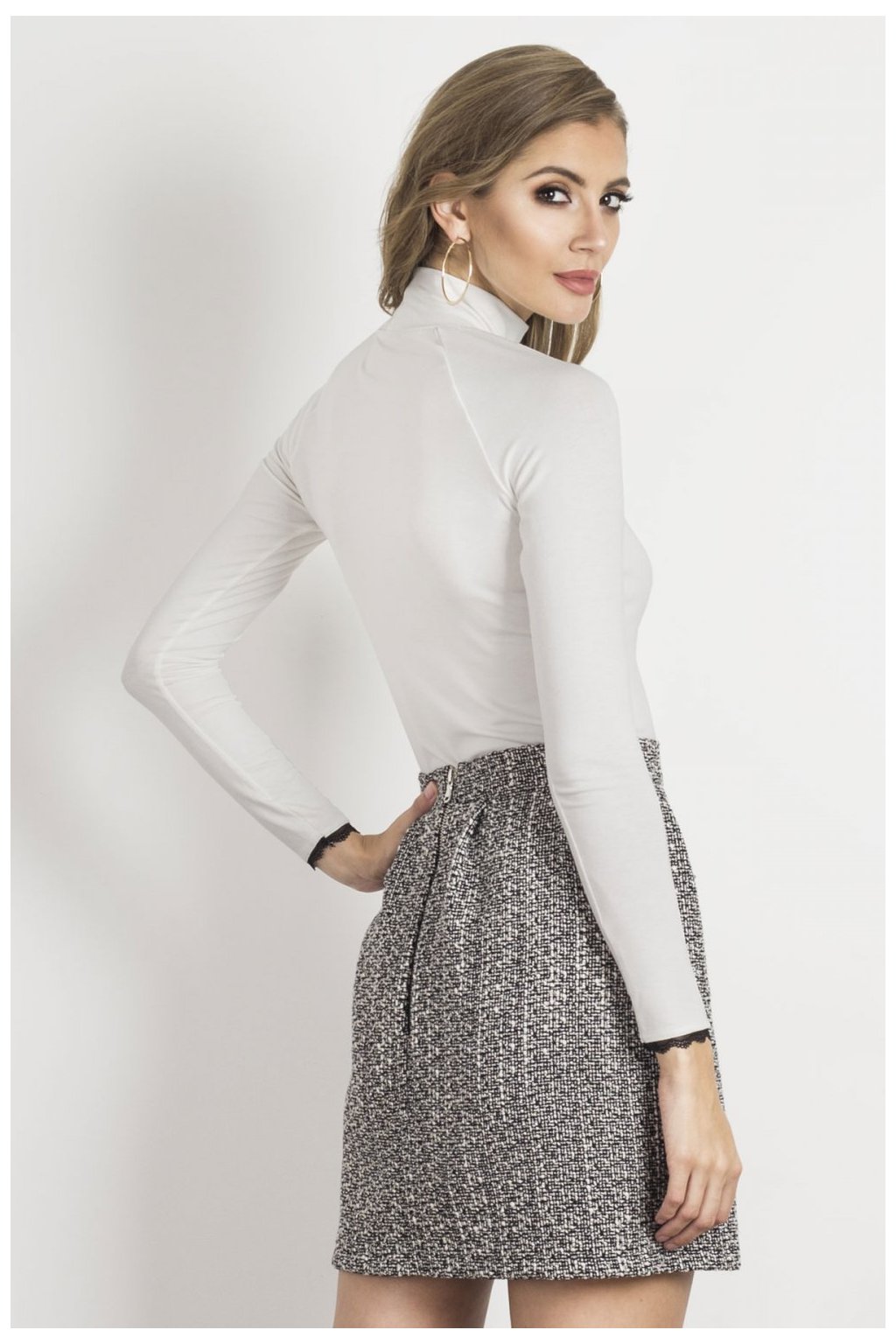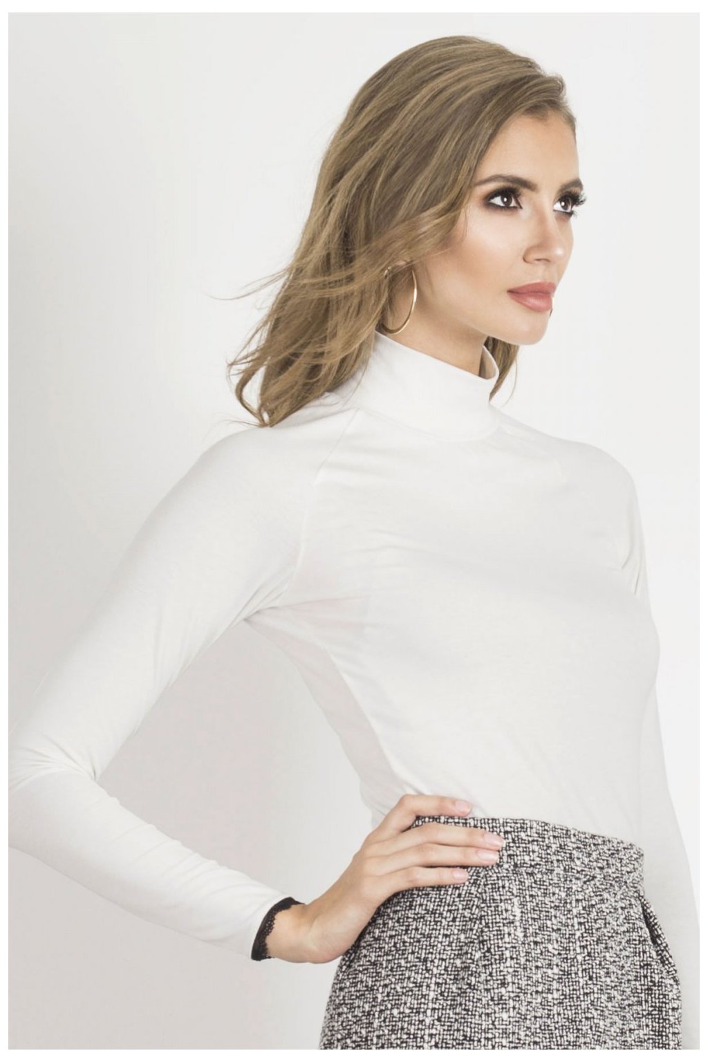 Halenka s rolákem ze základní kolekce, střih na míru. Halenka z hladkého, na dotek příjemného úpletu. Dlouhý rukáv zakončený ozdobnou krajkou, která dodává eleganci.