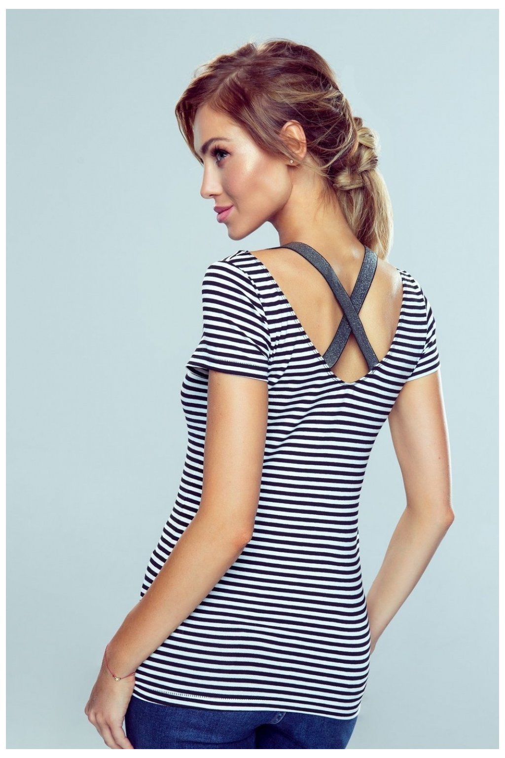 Stylová halenka zdobená stříbrnými gumovými pásky v podobě ozdobných třpytivých ramínek. Skvěle se hodí k džínám, inspirovaným glam stylem. Měkká, pružná bavlna v jemném bílém a černém pruhu.