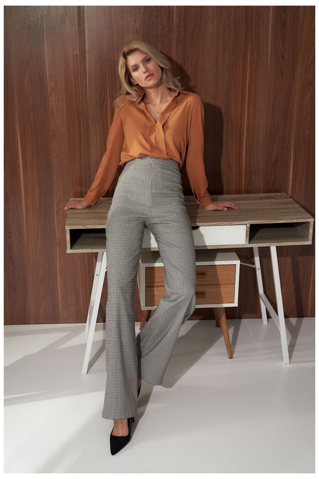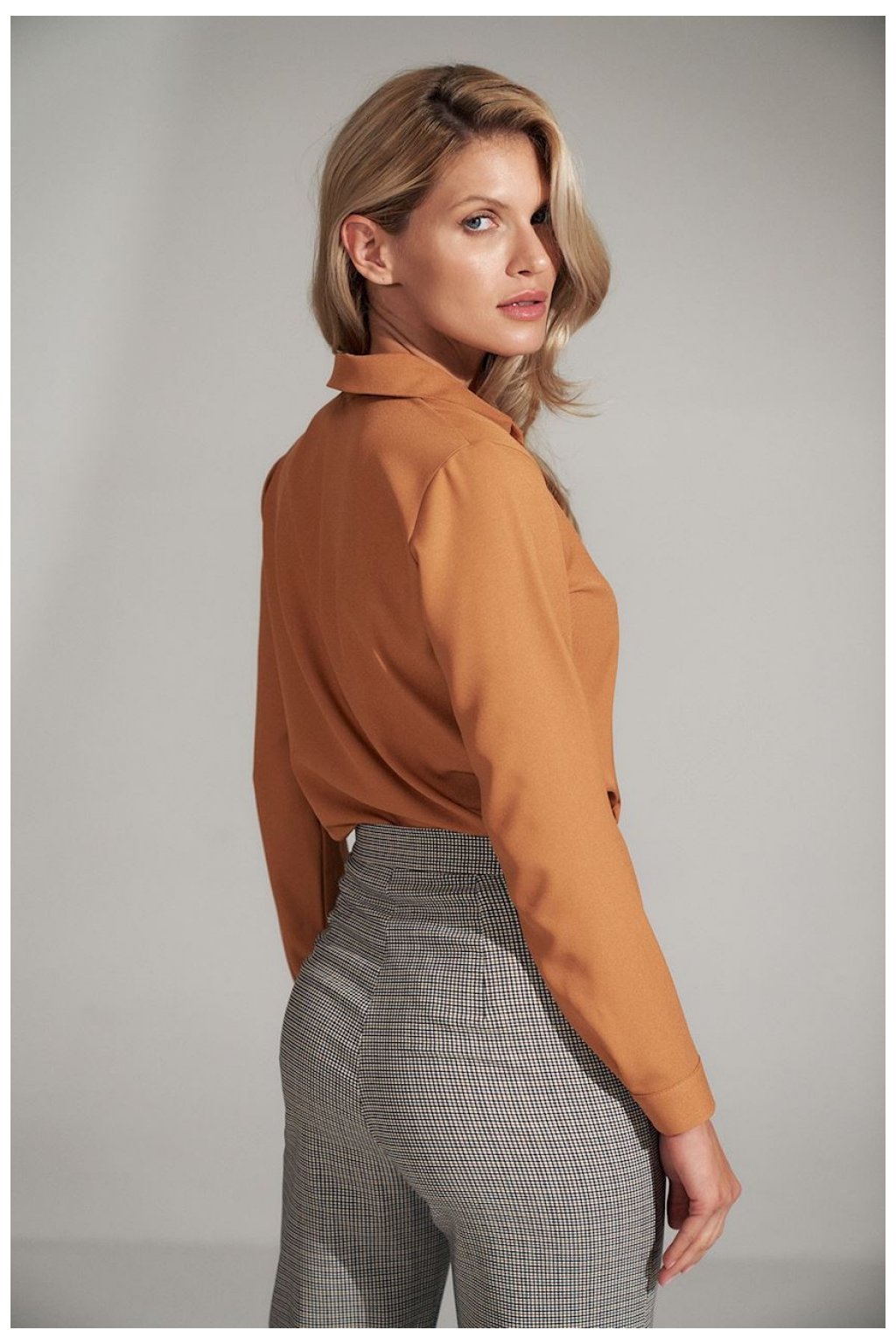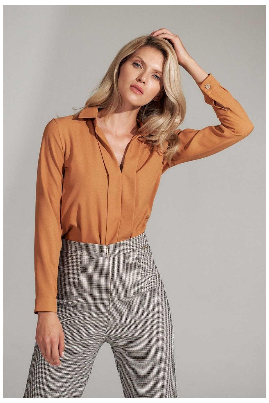 Hnědá halenka košilového střihu s límečkem se dvěma svislými záhyby. Žerzejový výstřih, dlouhé rukávy s manžetou na knoflíky.
