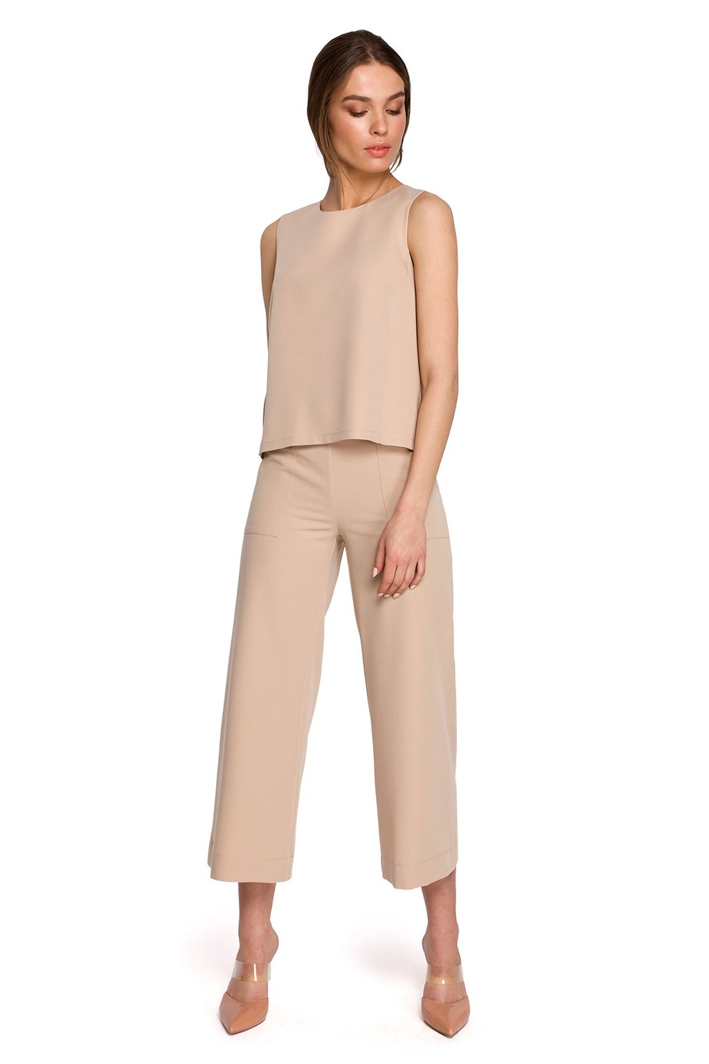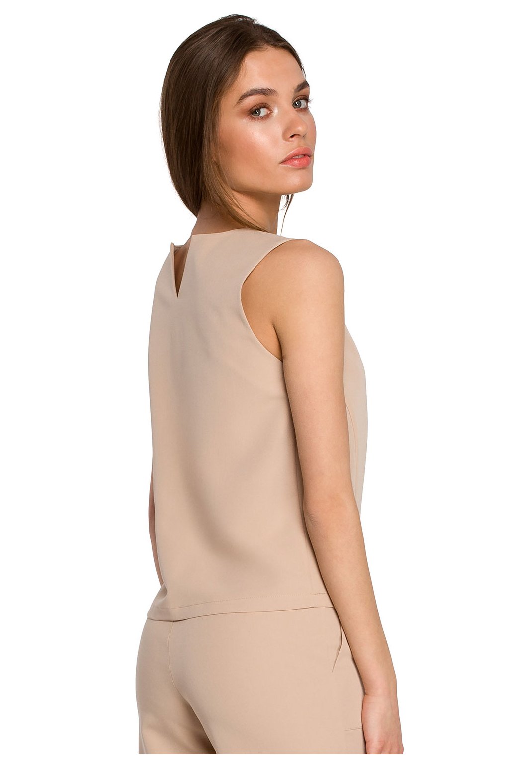 Krátká halenka bez rukávů v trapézovém střihu s jemným výstřihem na zádech. Návrh pro milovníky klasické elegance i náročnější hledače módních oděvů. Halenka se zapíná na krytý zip.