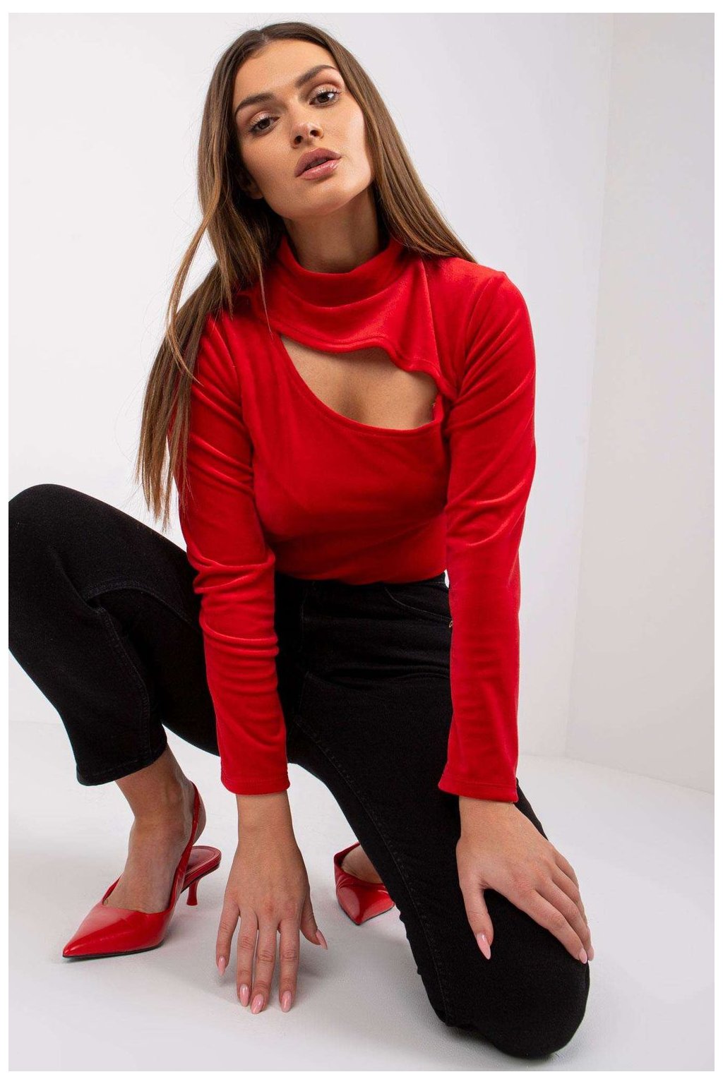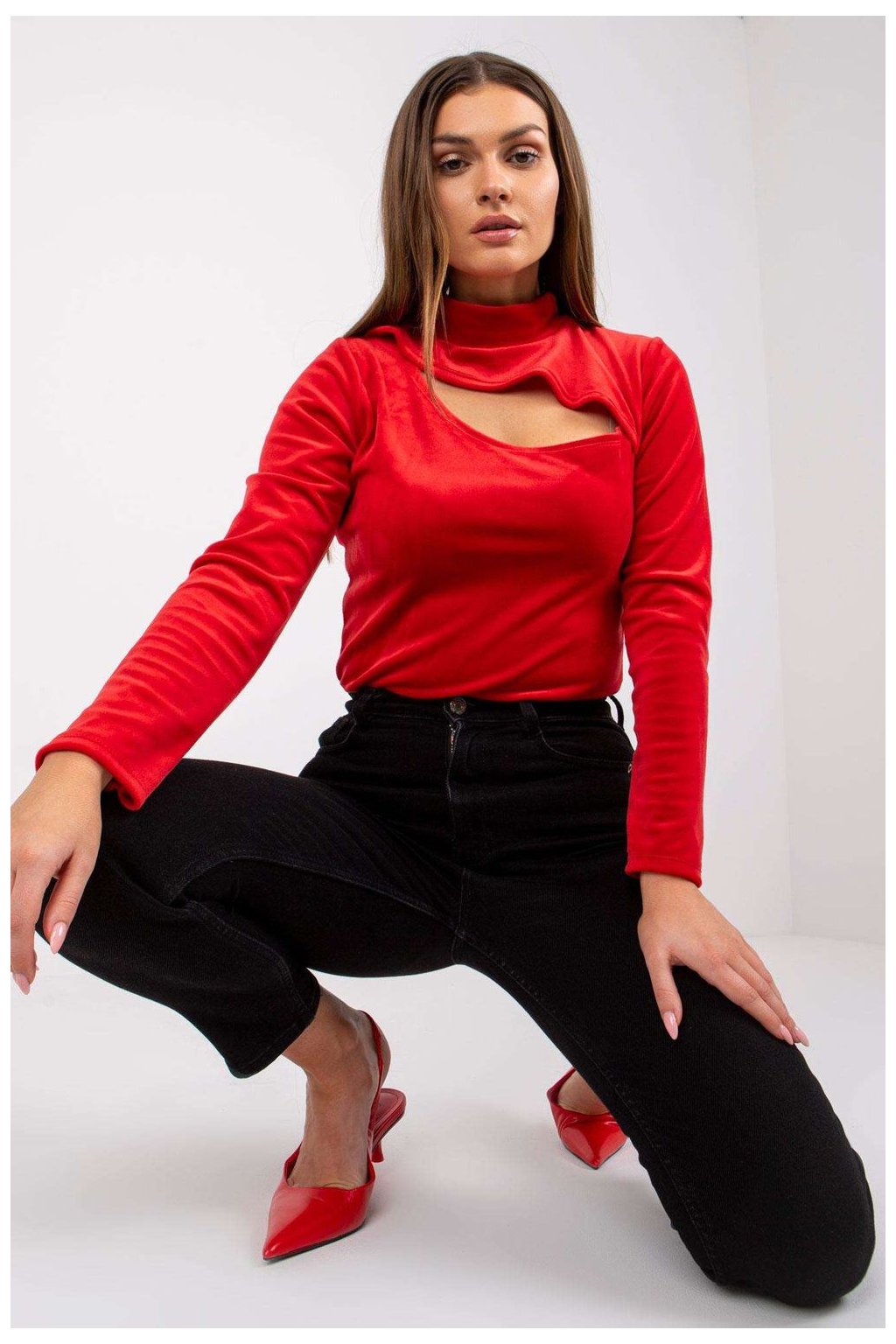 Velurová halenka s dlouhými rukávy a stojáčkem. Zajímavý výřez v přední části.