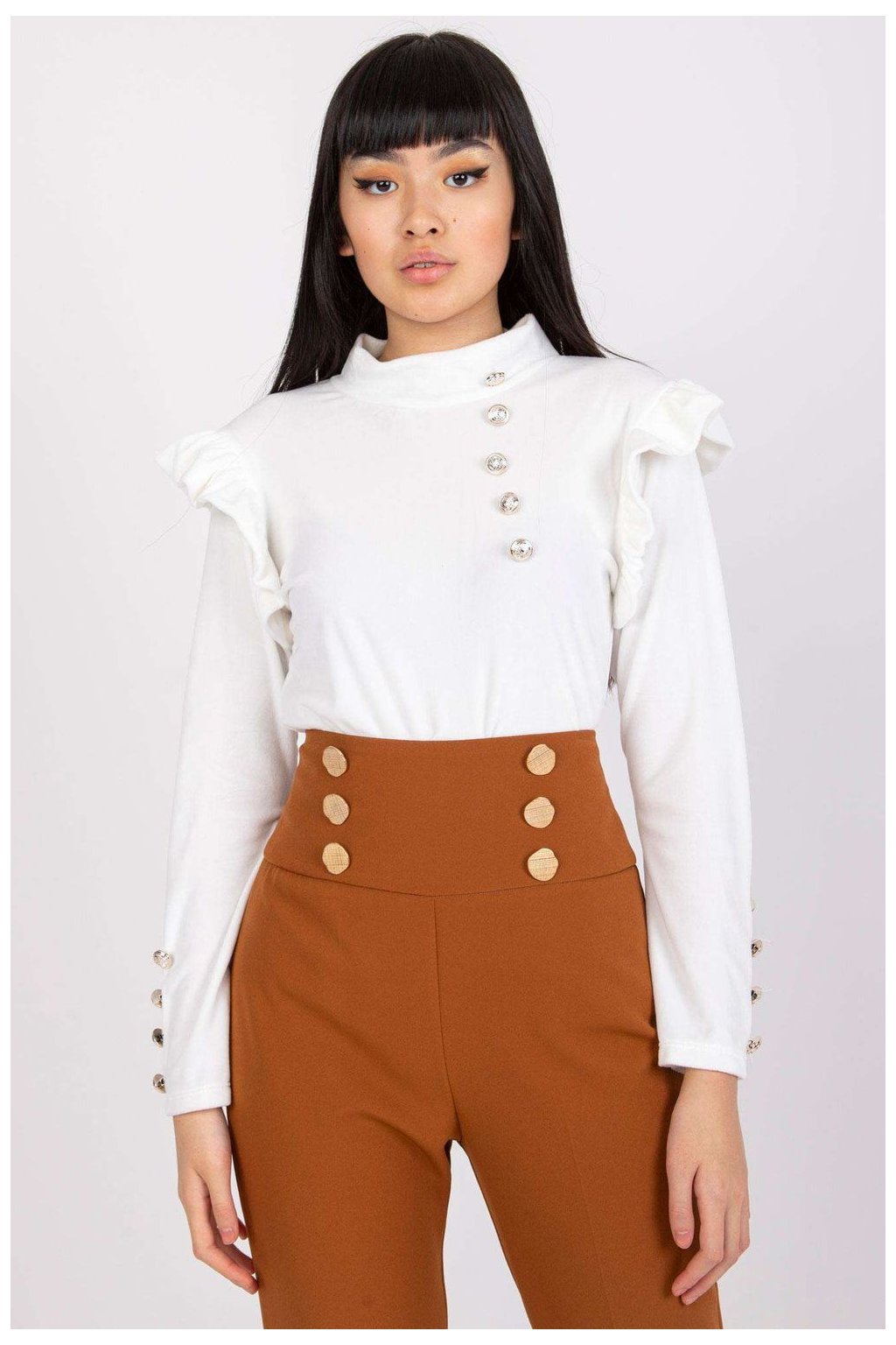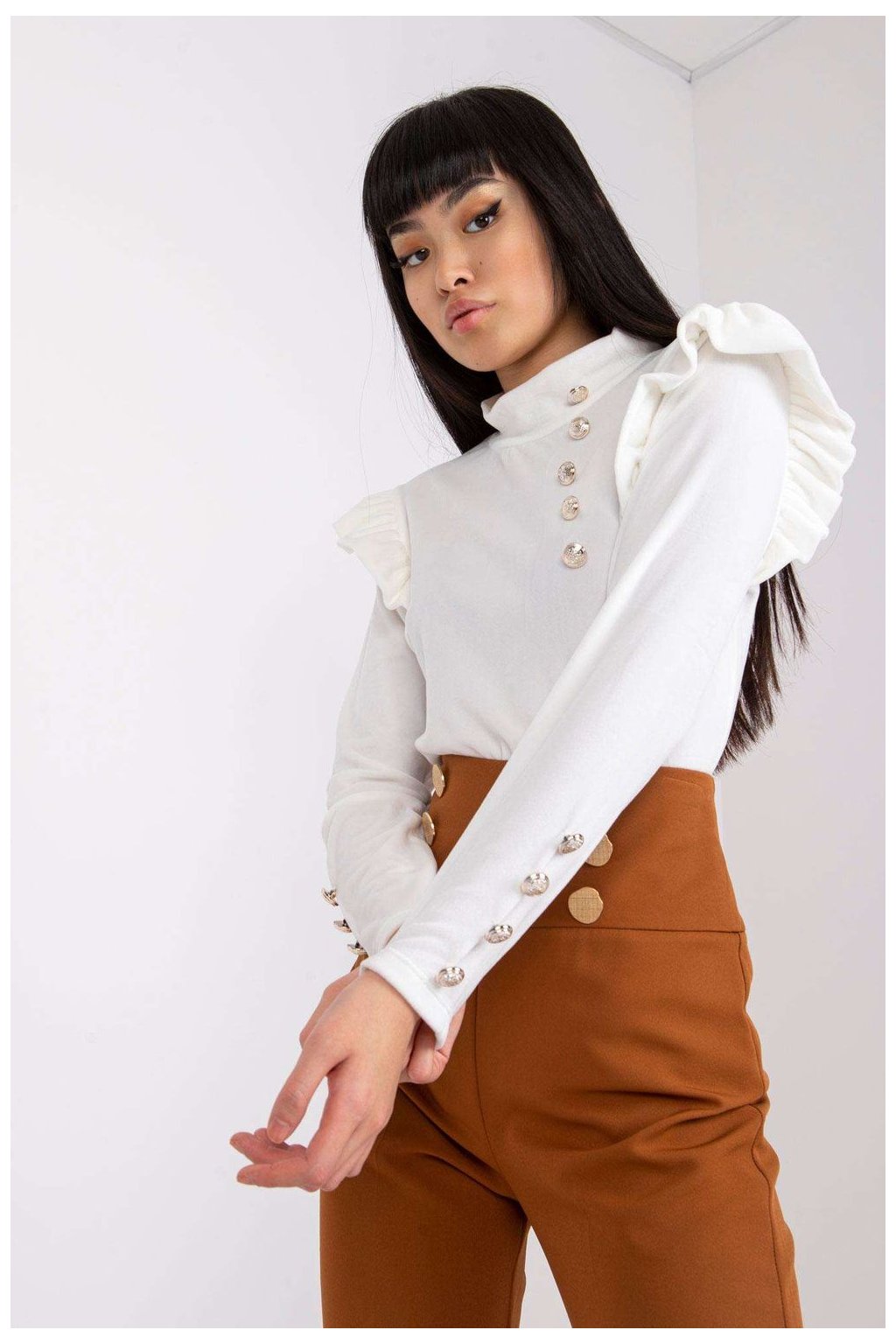 Velurová halenka rovného střihu s dlouhými rukávy. Ozdobné volánky na ramenou. Ozdobné knoflíky vpředu a na rukávech.