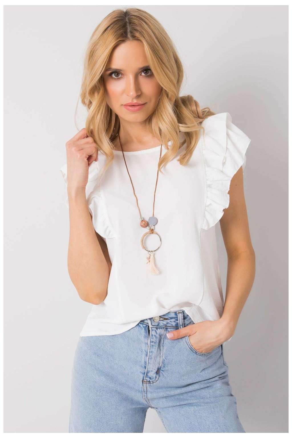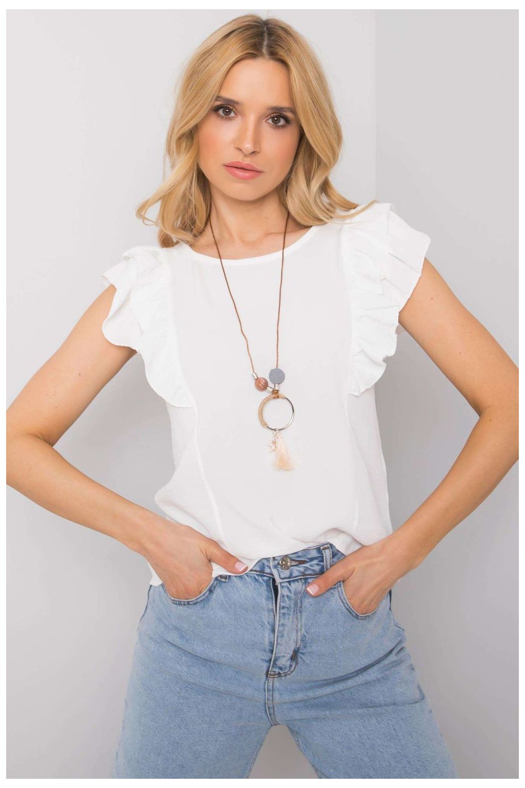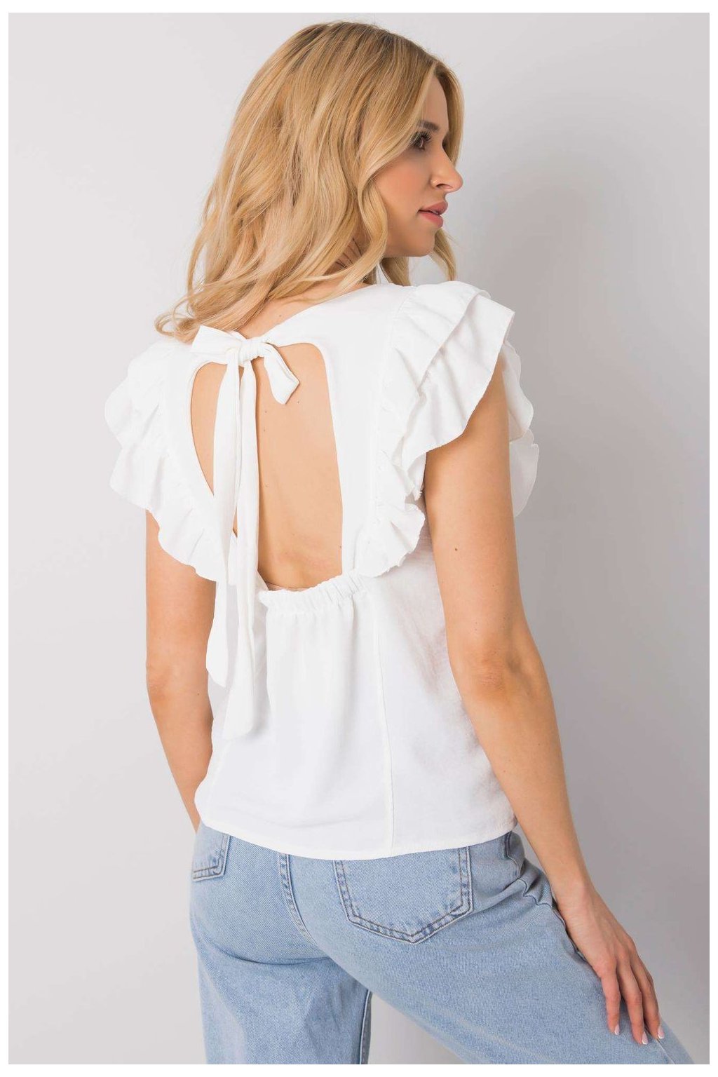 Halenka s krátkými rukávy v podobě volánku. Kulatý výstřih, výstřih na zádech se zavazováním.