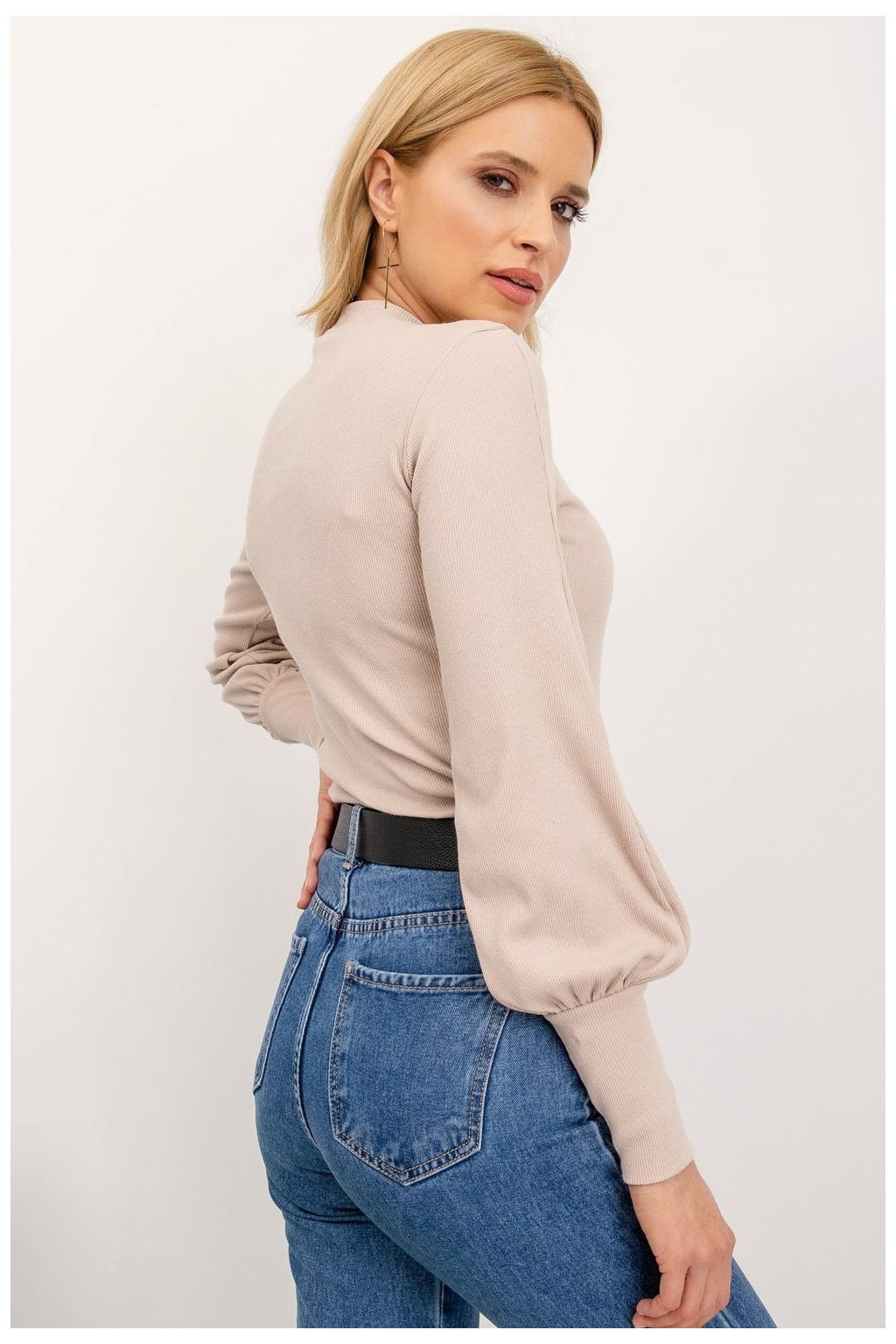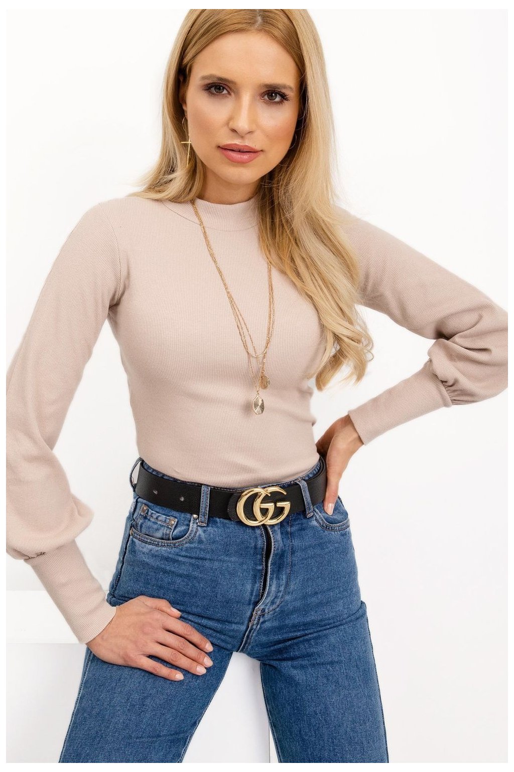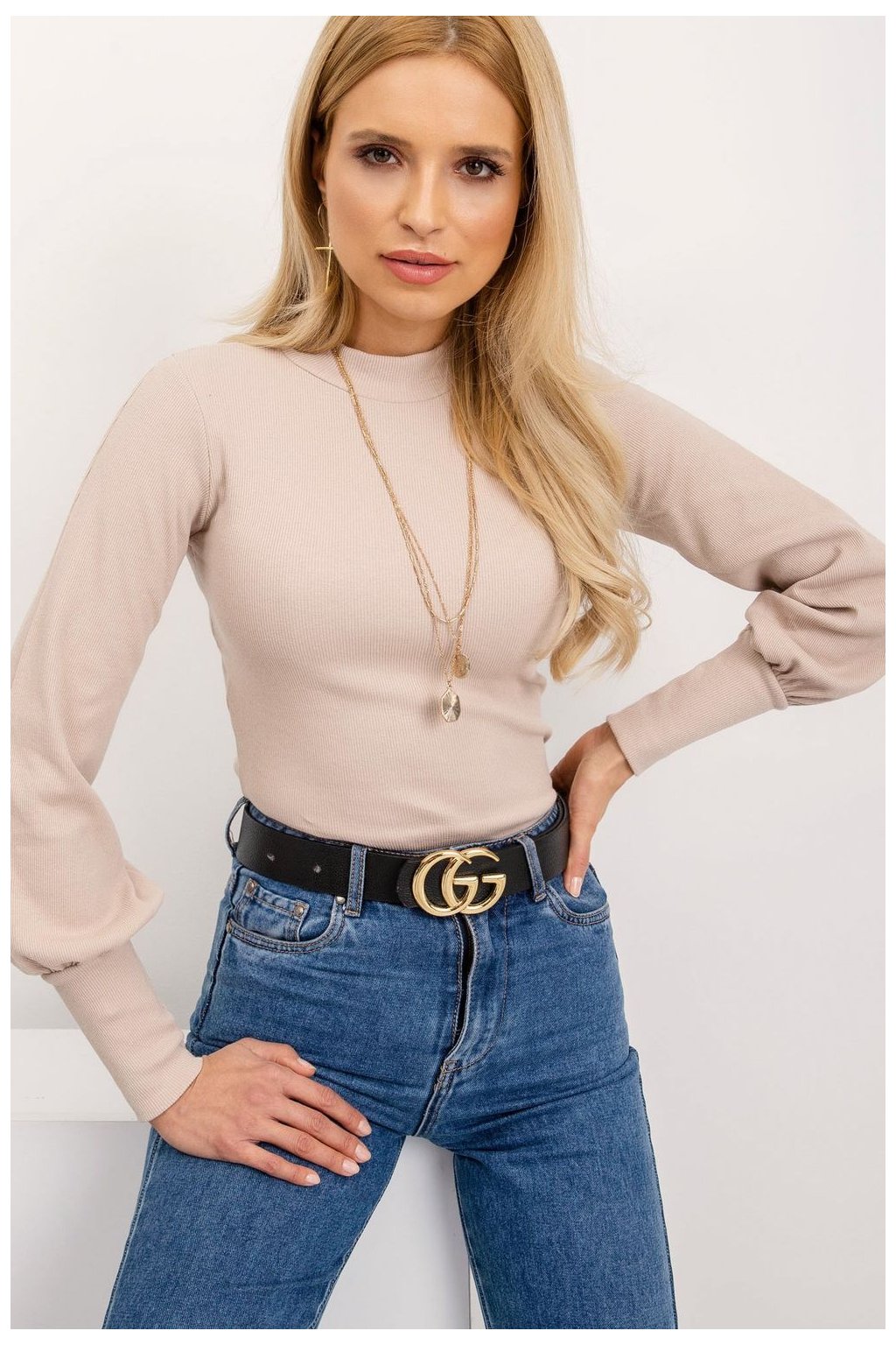 Halenka s dlouhými rukávy z žebrované tkaniny. Rukávy jsou zakončené širokými žebrovanými manžetami.