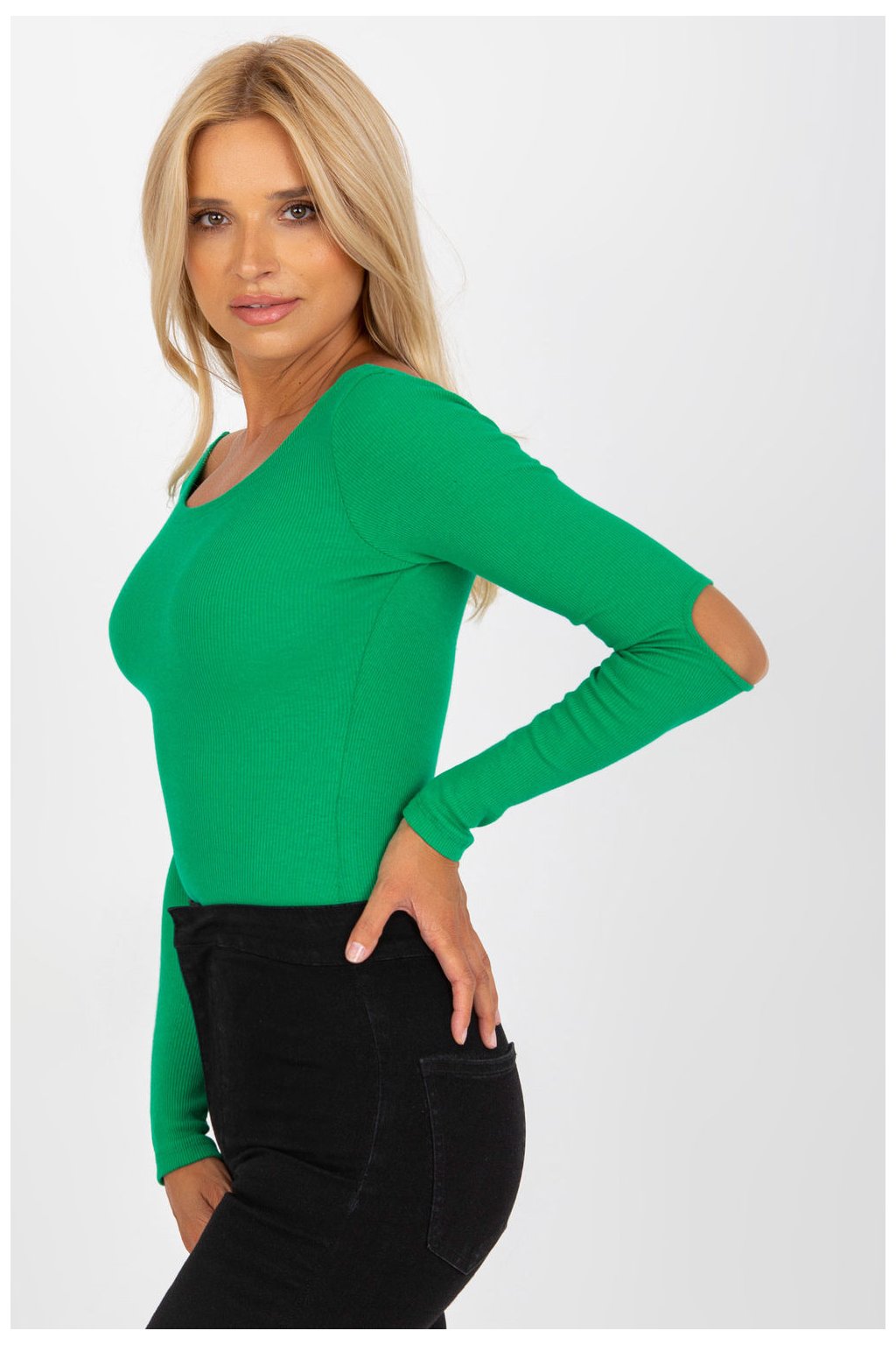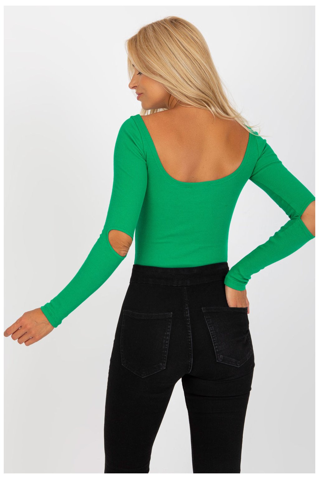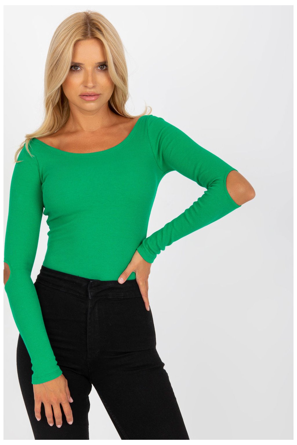 Halenka s dlouhými rukávy a lodičkovým výstřihem. Ozdobné rozparky na loktech. Hluboký výřez na zádech.