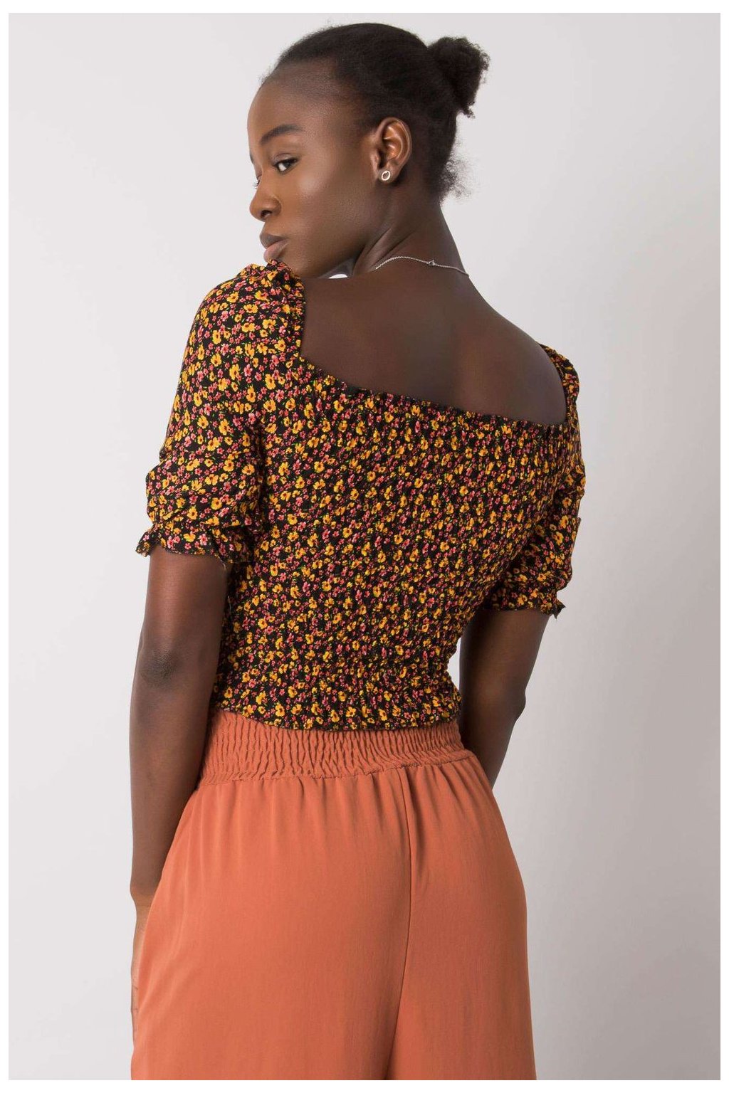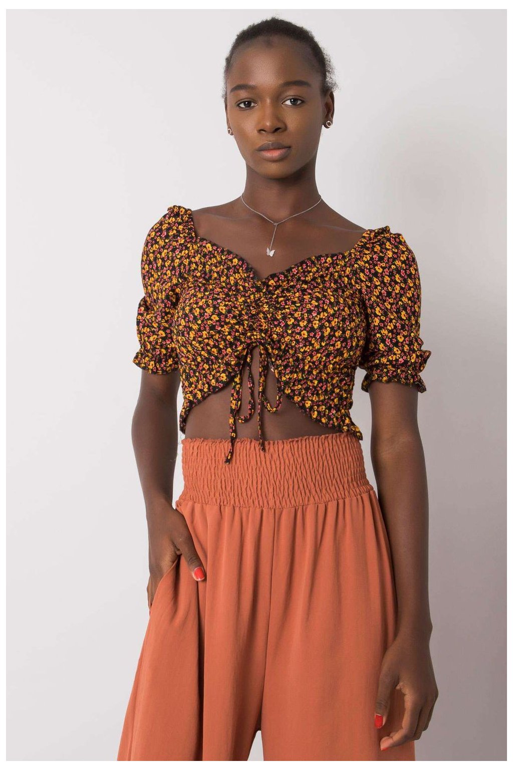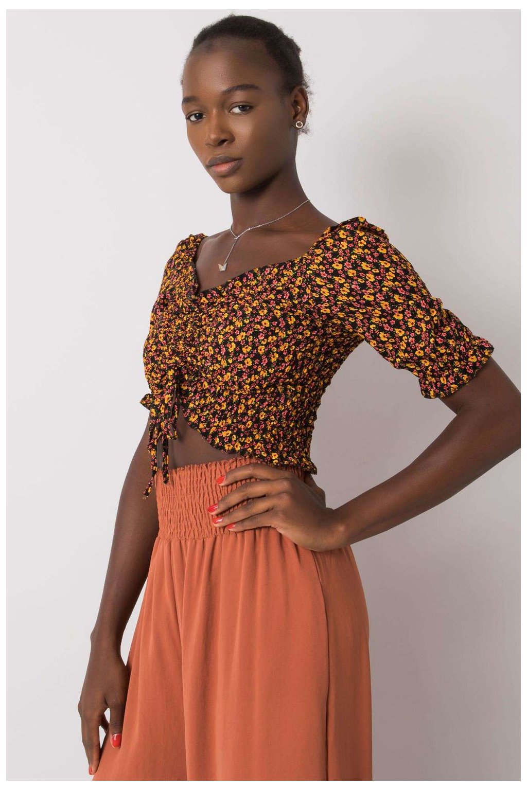 Krátká halenka vypasovaného střihu s krátkými rukávy. Halenka s véčkovým výstřihem, záhyby a vázáním na přední straně.