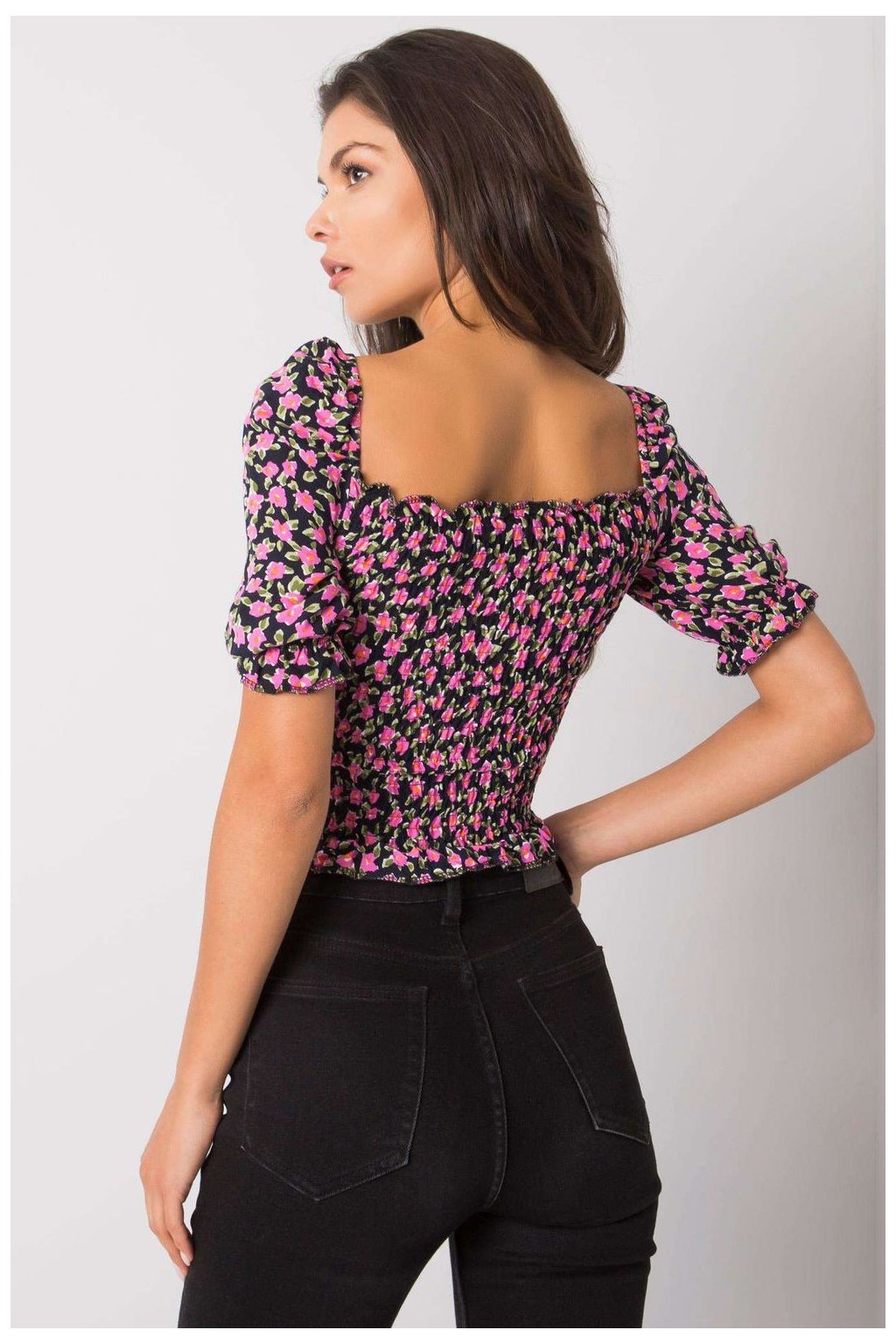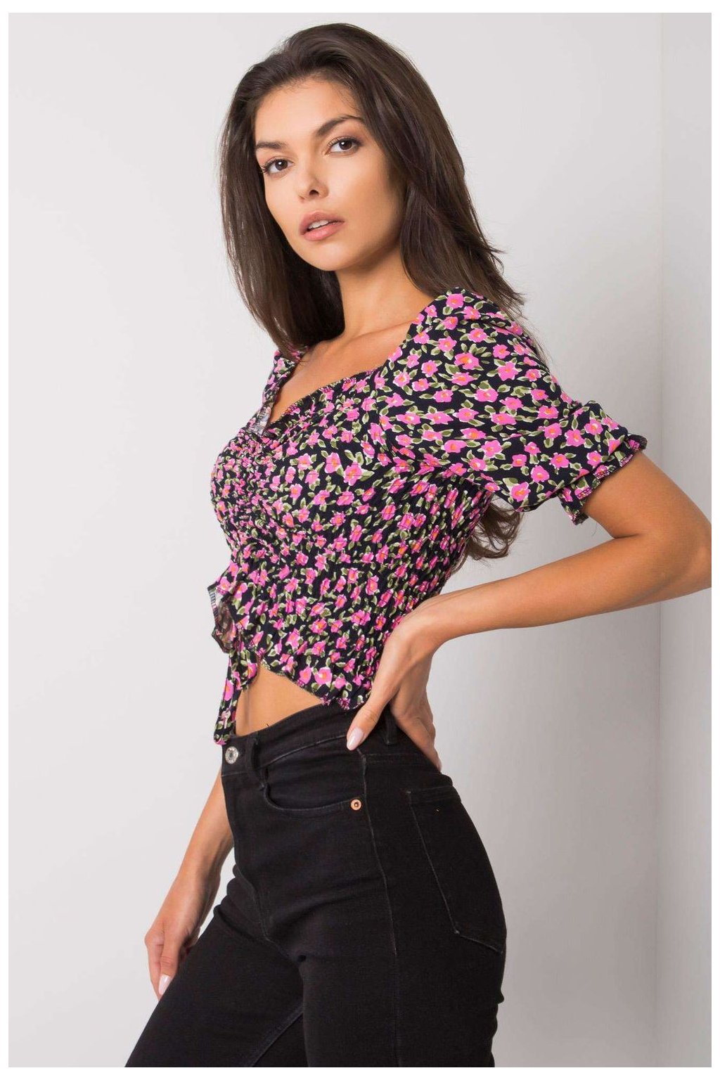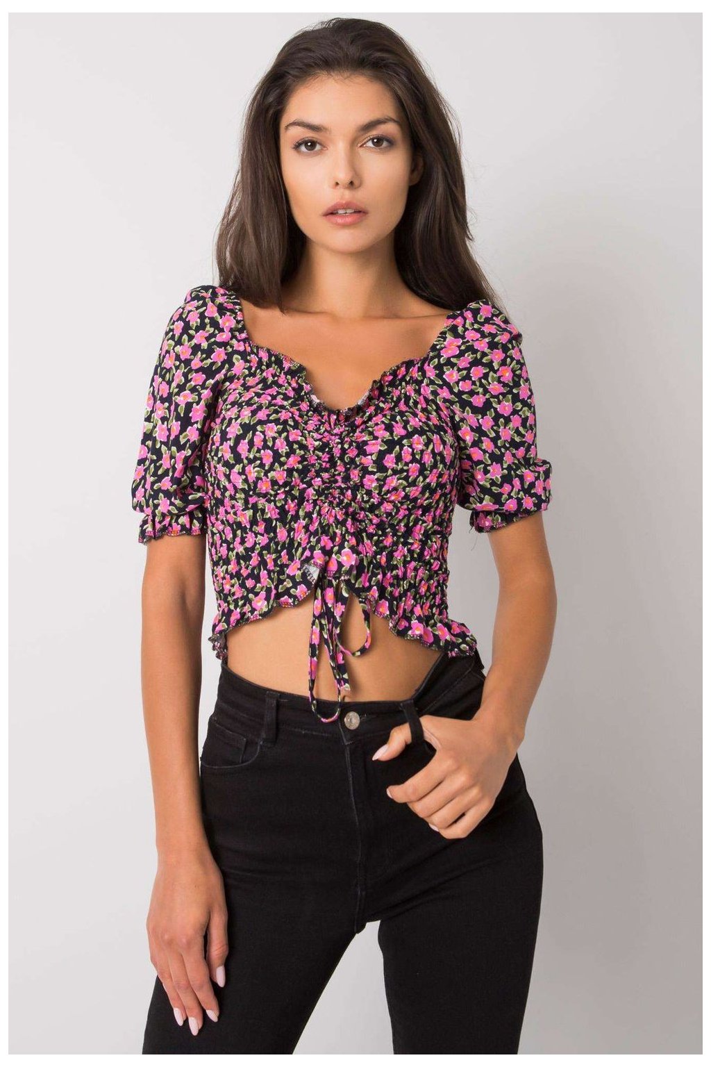 Krátká halenka vypasovaného střihu s krátkými rukávy. Halenka s véčkovým výstřihem, záhyby a vázáním na přední straně.