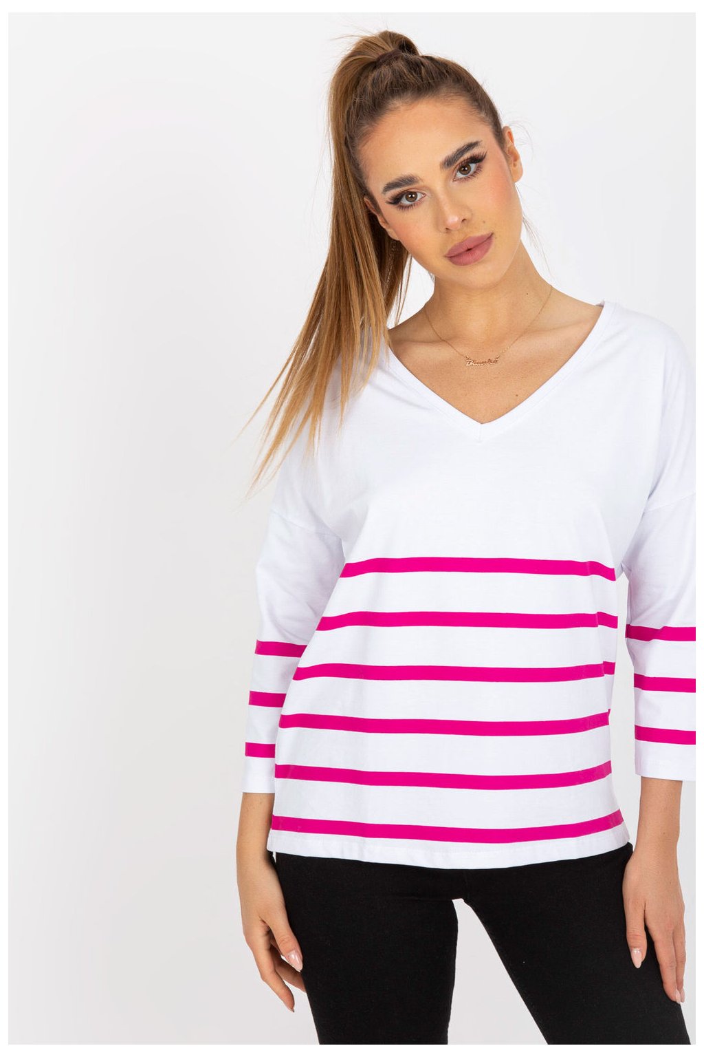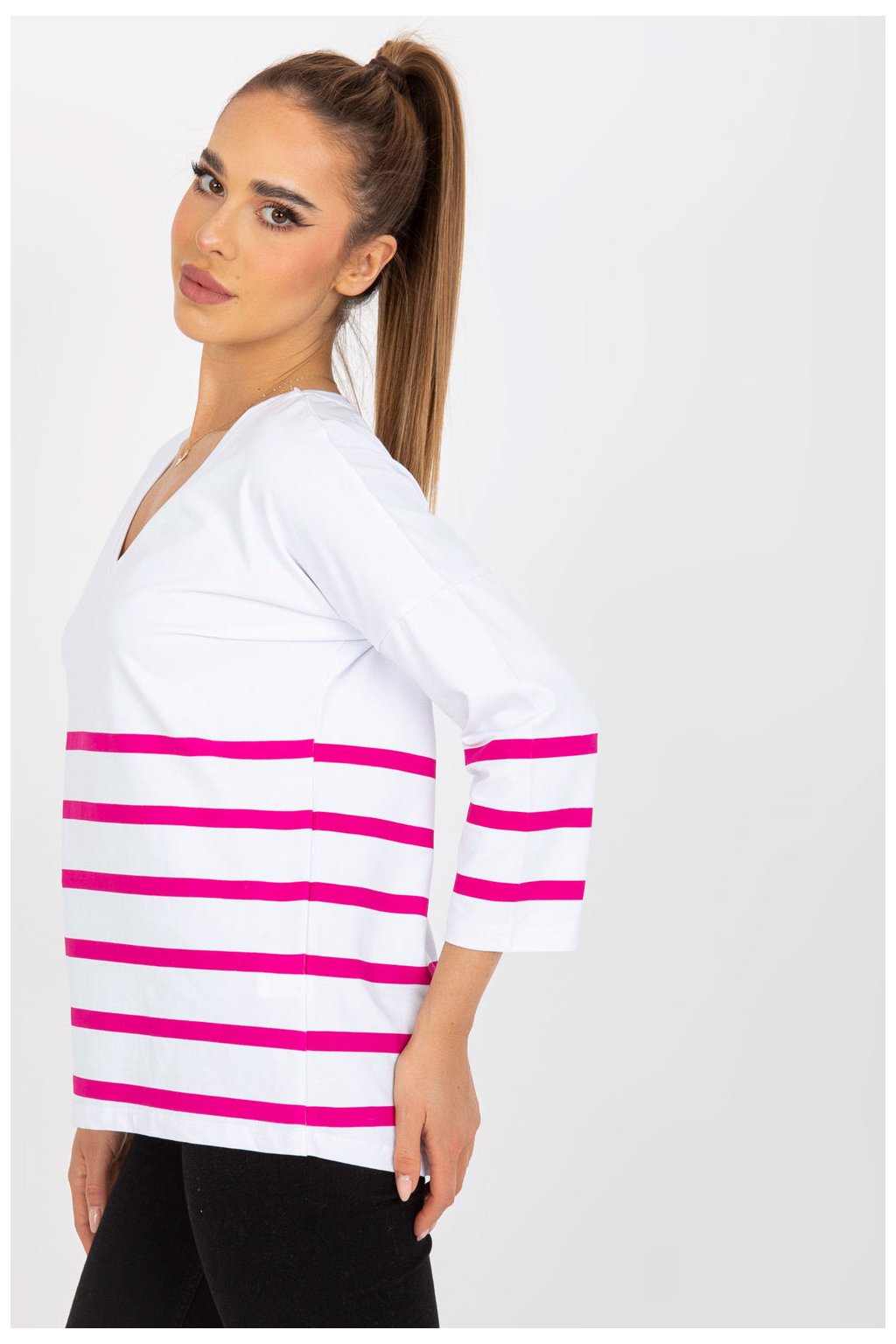 Halenka s 3/4 rukávy a výstřihem do V. Halenka zdobená barevnými pruhy.