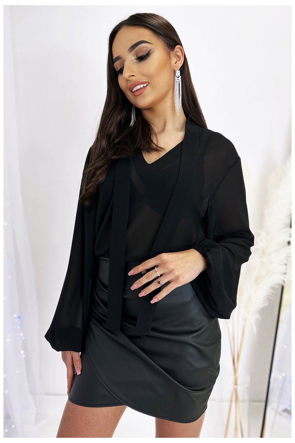 Elegantní šifonová halenka. Volné, splývavé rukávy zakončené gumičkou působí neobvykle lehce. Výstřih je členěn zeštíhlujícím výstřihem do V. Výstřih zdobí poutavá kravata, kterou lze nosit několika způsoby: jako škrtidlo, s uzlem či mašlí nebo volně. Zaručujeme vám, že si toto tričko zamilujete hned při prvním nošení! Vytvoří dokonalý komplet s naší černou koženou minisukní Marisha! Halenka navržená a ušitá v Polsku.