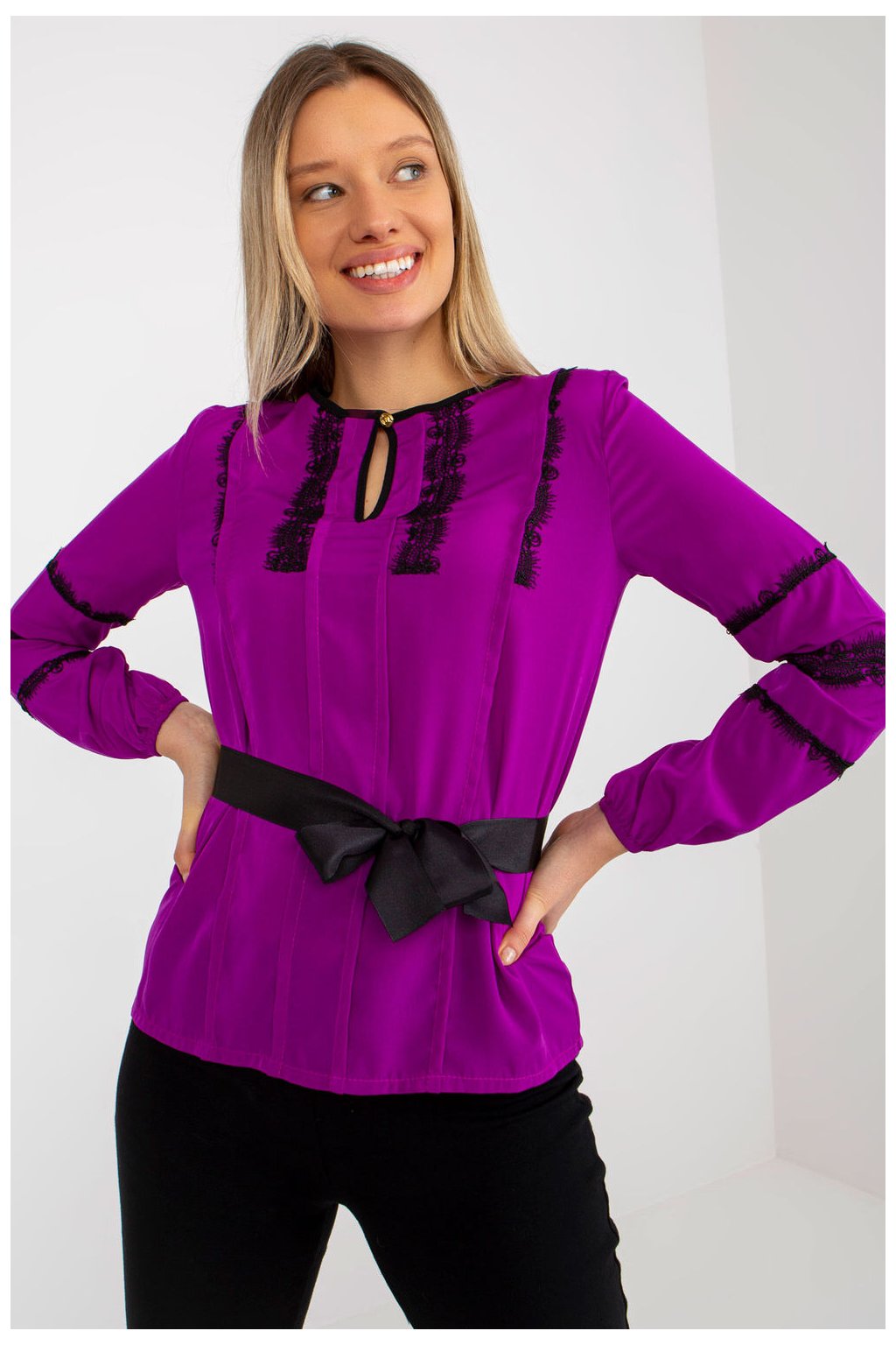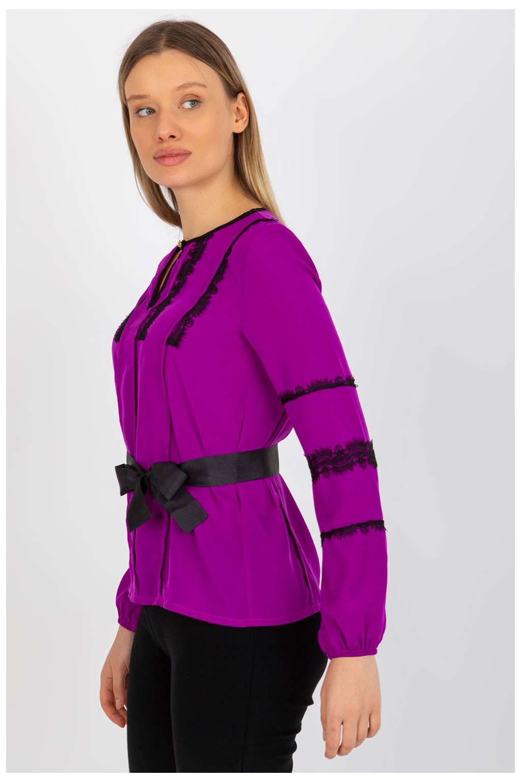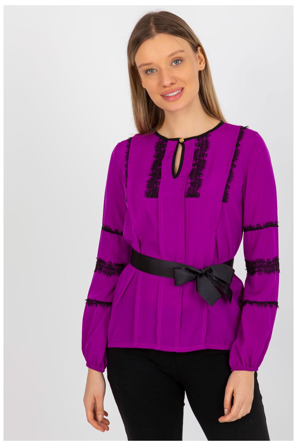 Společenská halenka s dlouhými rukávy a kulatým výstřihem. Halenka s našitou krajkou a páskem na zavázání.