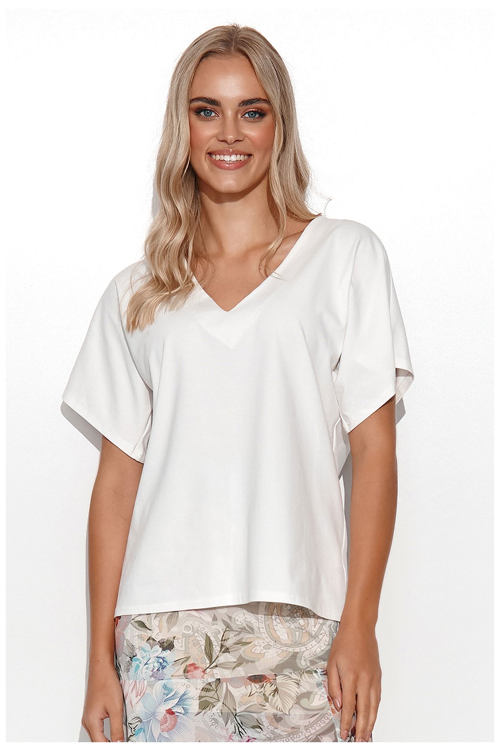 Jednoduchá a ležérní dámská halenka. Je mimořádně univerzálním základem pro mnoho jarně-letních stylizací. Halenka má výstřih do V, který opticky prodlužuje krk. Poskytuje výjimečné pohodlí, nepřečnívá přes břicho ani záda. Má volné, krátké rukávy. Můžete ji nosit s dlouhou elegantní sukní nebo ji perverzně kombinovat s krátkými šortkami. Sportovní nebo elegantní, stylizujte tuto halenku, jak se vám líbí. Prostor pro kreativní možnosti rozšiřuje dostupnost mnoha barevných variant. Vyberte si svou oblíbenou. Vyjádřete se prostřednictvím módy.