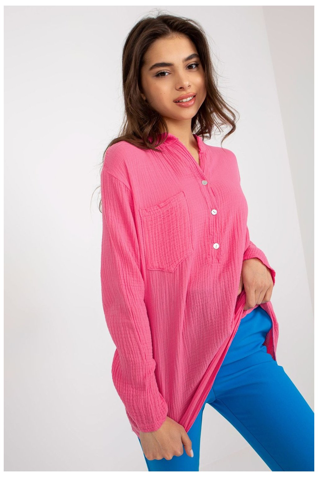 Mušelínová halenka volnějšího střihu s dlouhými rukávy a výstřihem do V. Má kapsu na přední straně a zapínání na knoflíky.