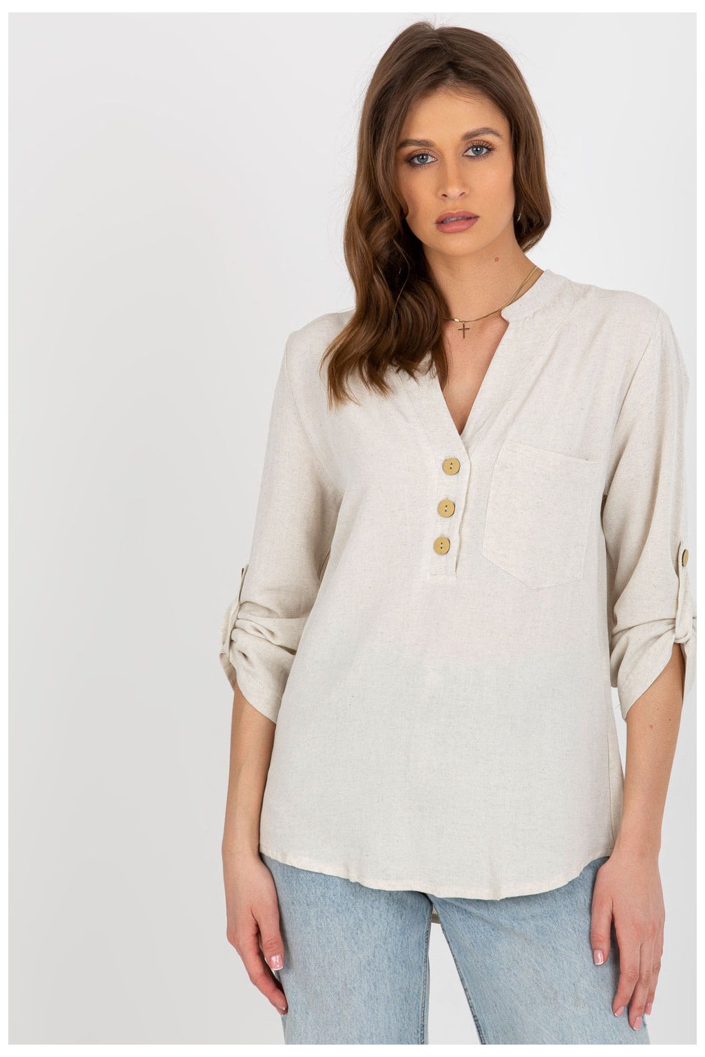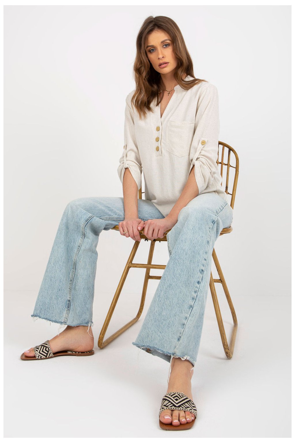 Halenka košilového střihu s dlouhými rukávy a výstřihem. Ozdobné zapínání a kapsa na přední straně. Rukávy lze ohrnout. Ideální pro mnoho příležitostí.