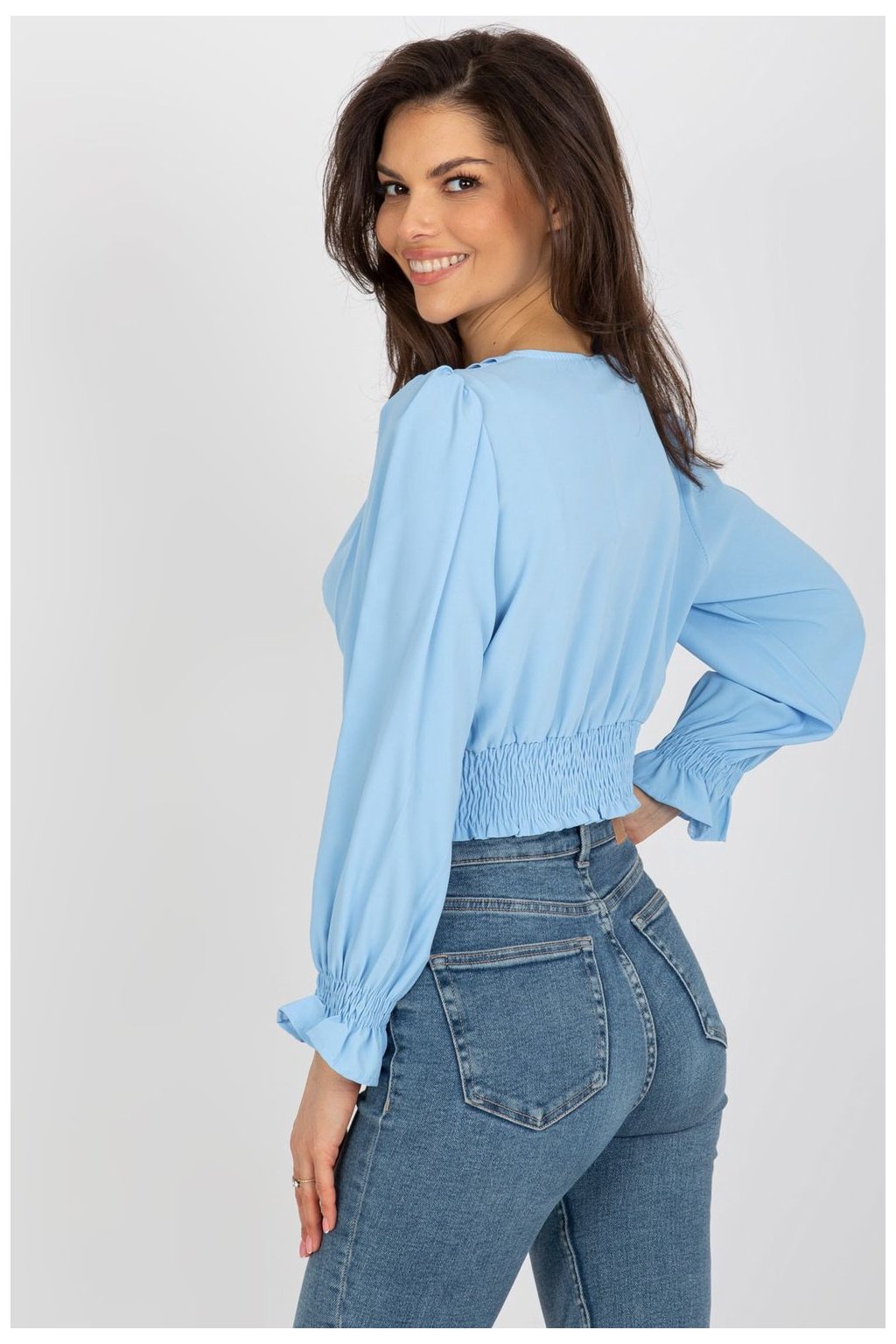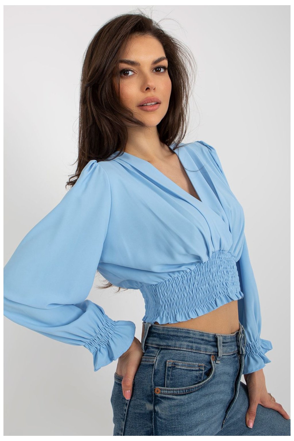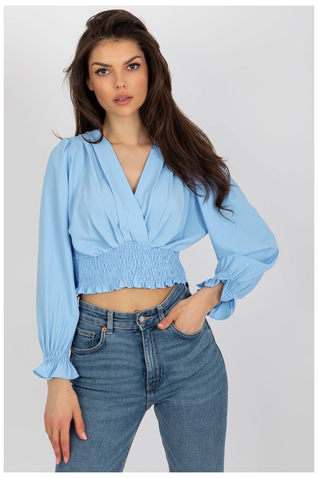 Halenka s obálkovým výstřihem a dlouhými rukávy. Široká podpůrná guma ve spodní části halenky.