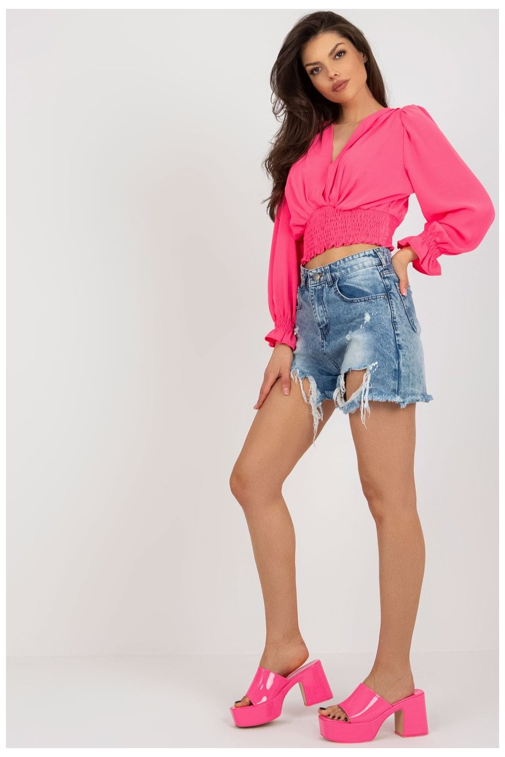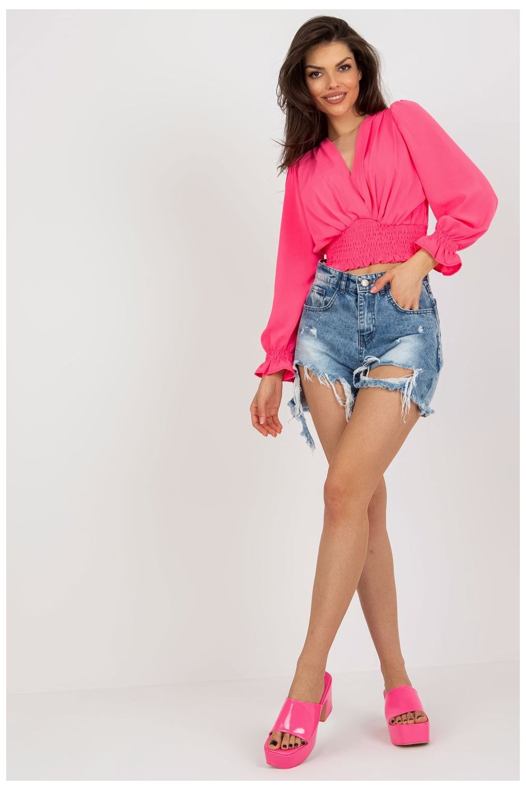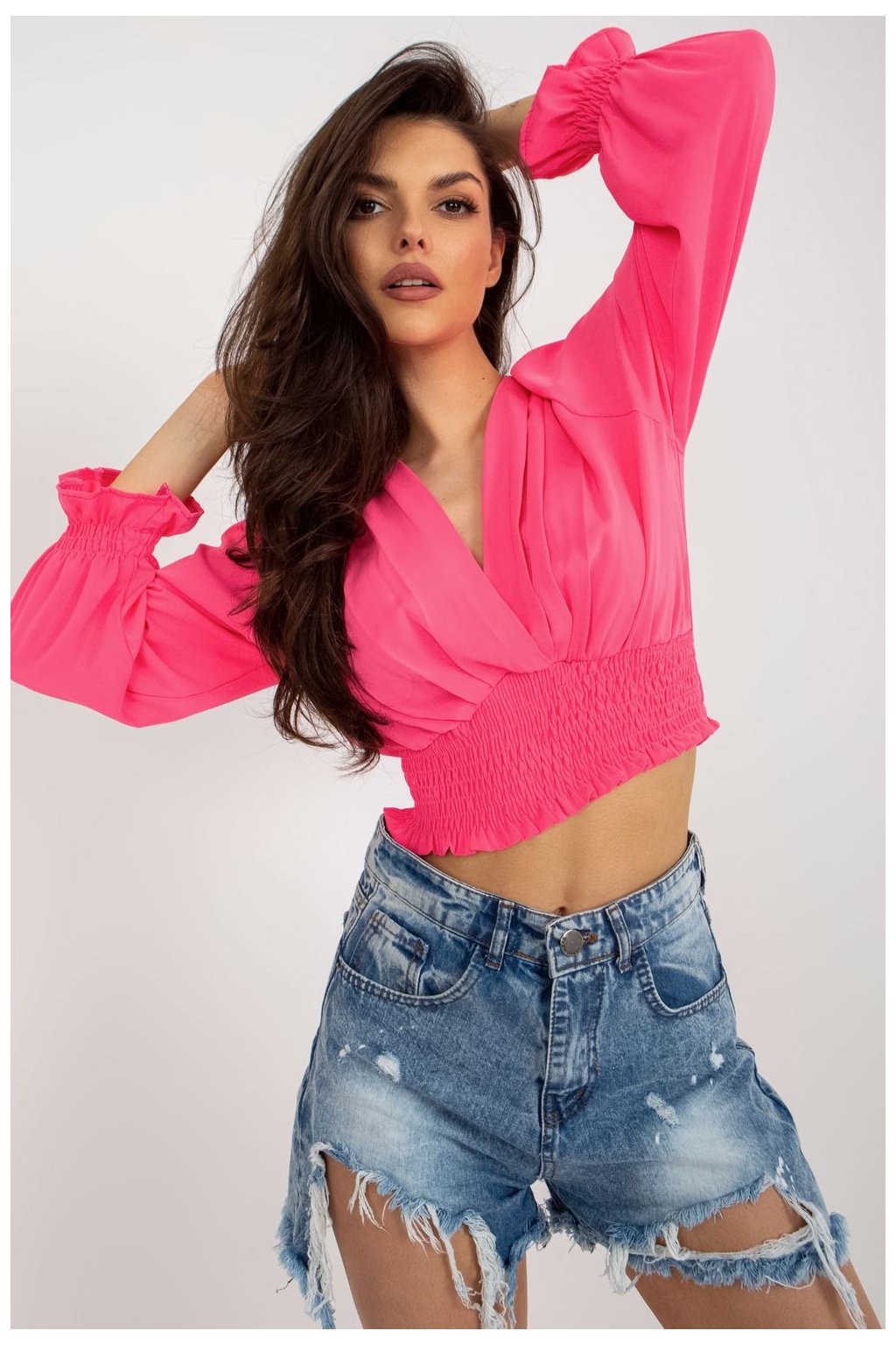 Halenka s obálkovým výstřihem a dlouhými rukávy. Široká podpůrná guma ve spodní části halenky.