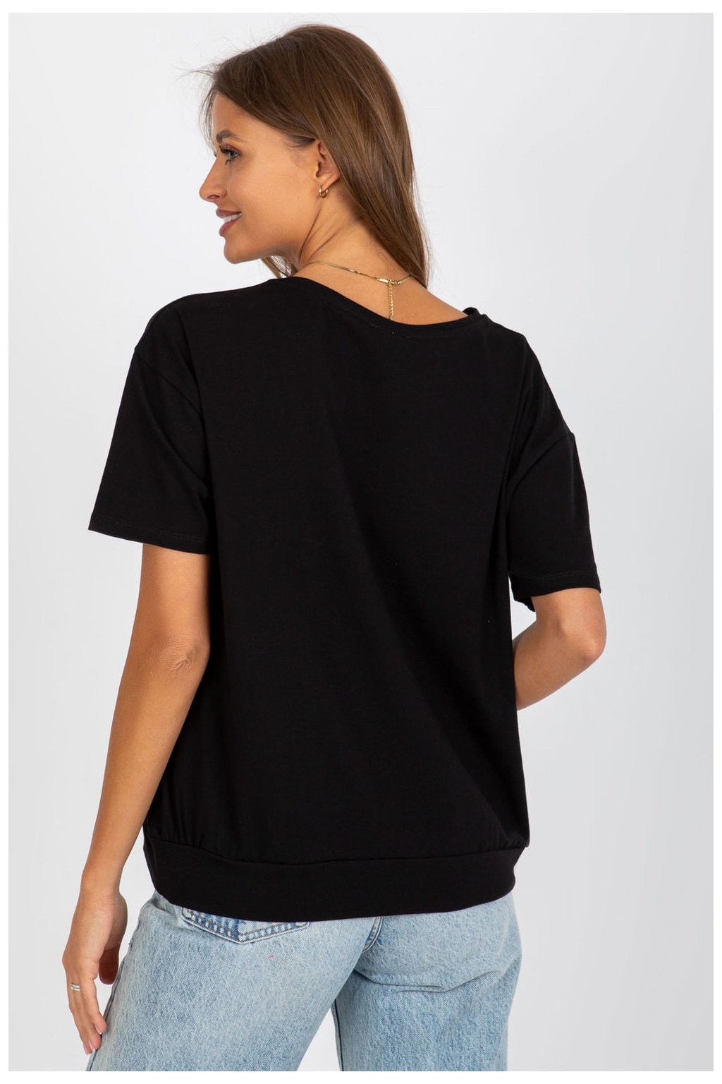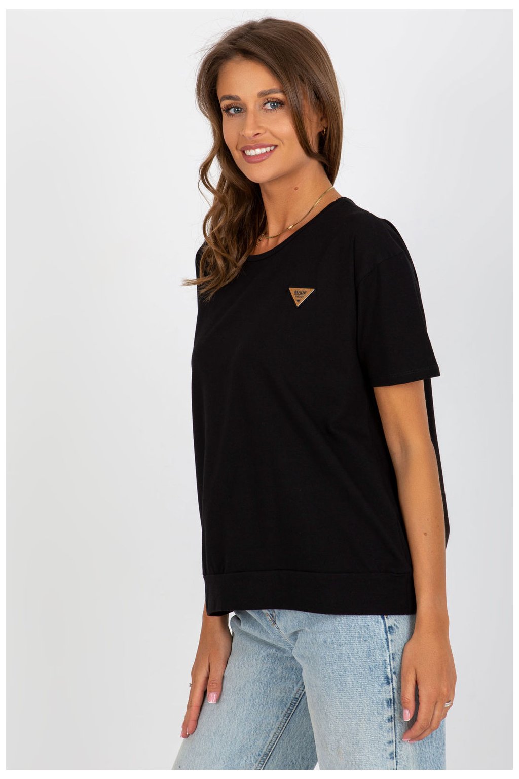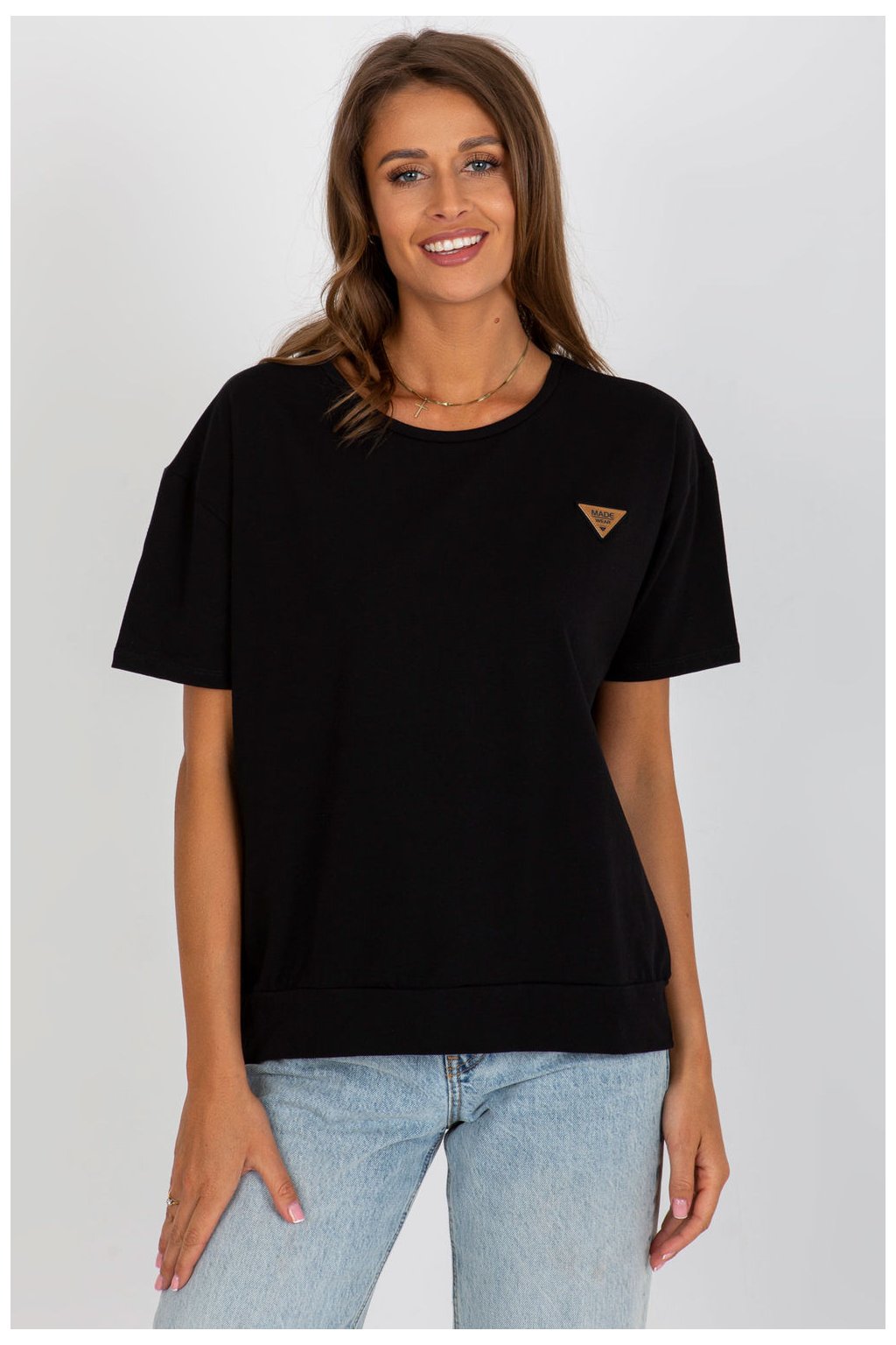 Dámská halenka s krátkými rukávy a kulatým výstřihem. Halenka je vyrobena z pevného materiálu s ozdobnou nášivkou na přední straně.