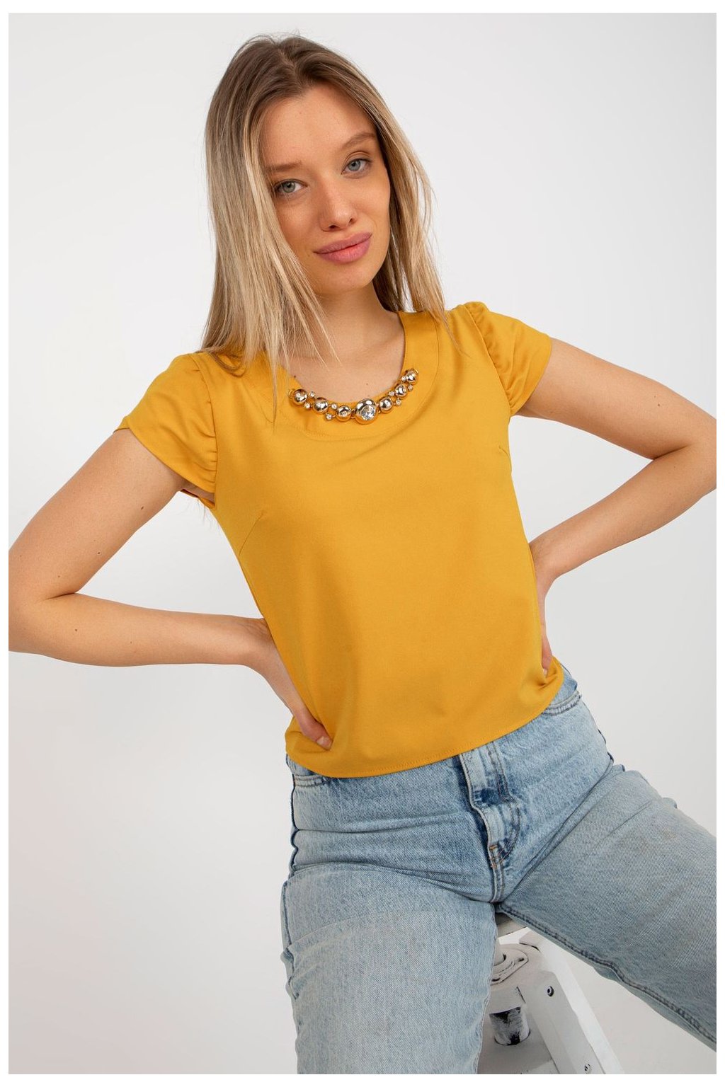 Halenka s krátkými rukávy ve tvaru bufetu a kulatým výstřihem. Na přední straně zdobená šperky.