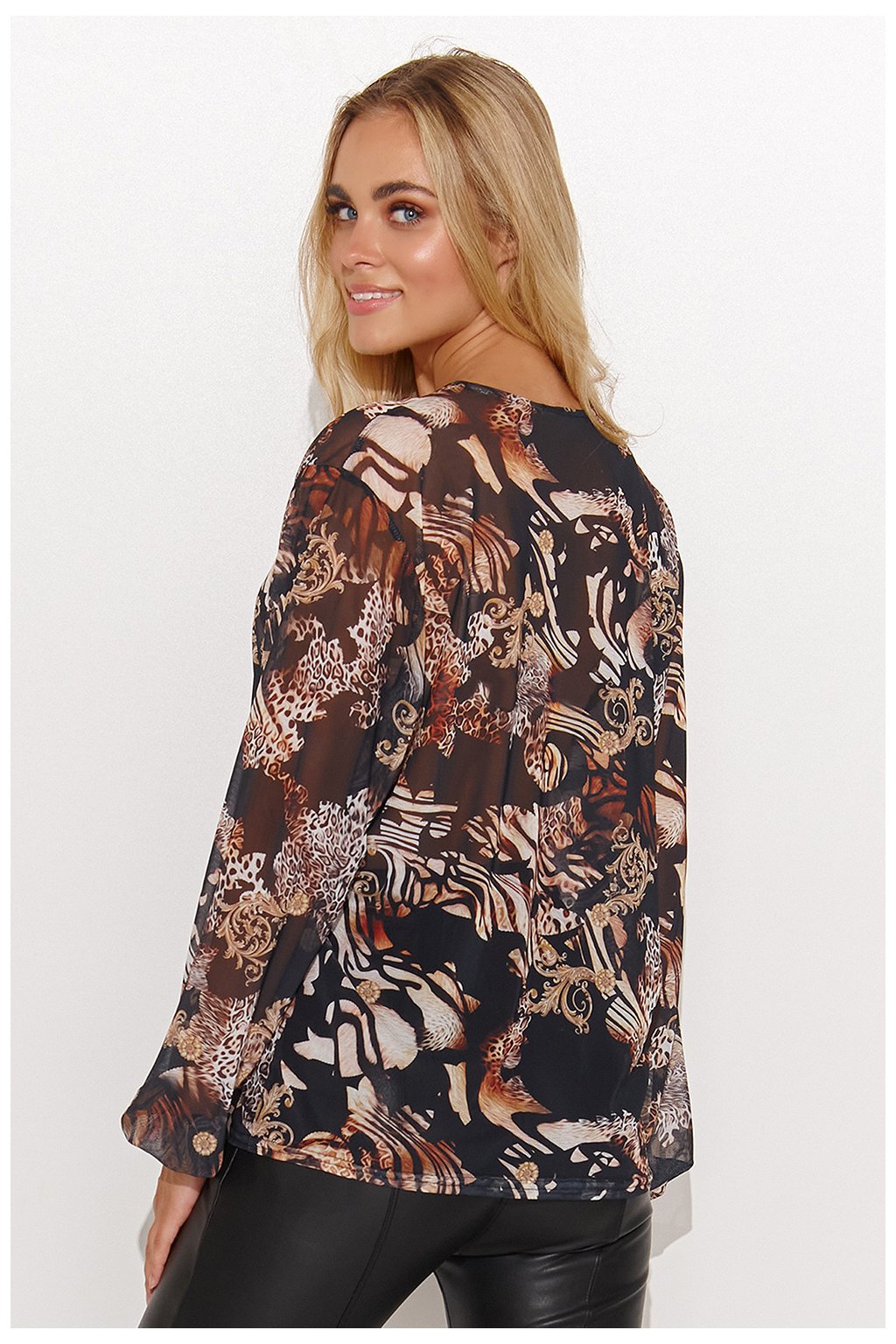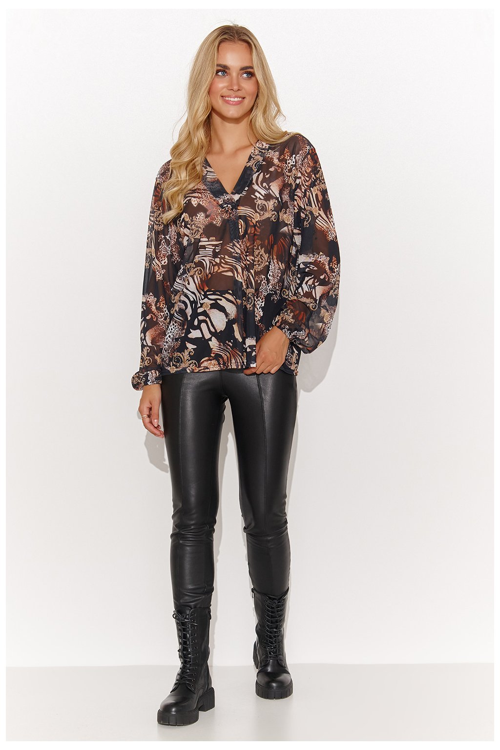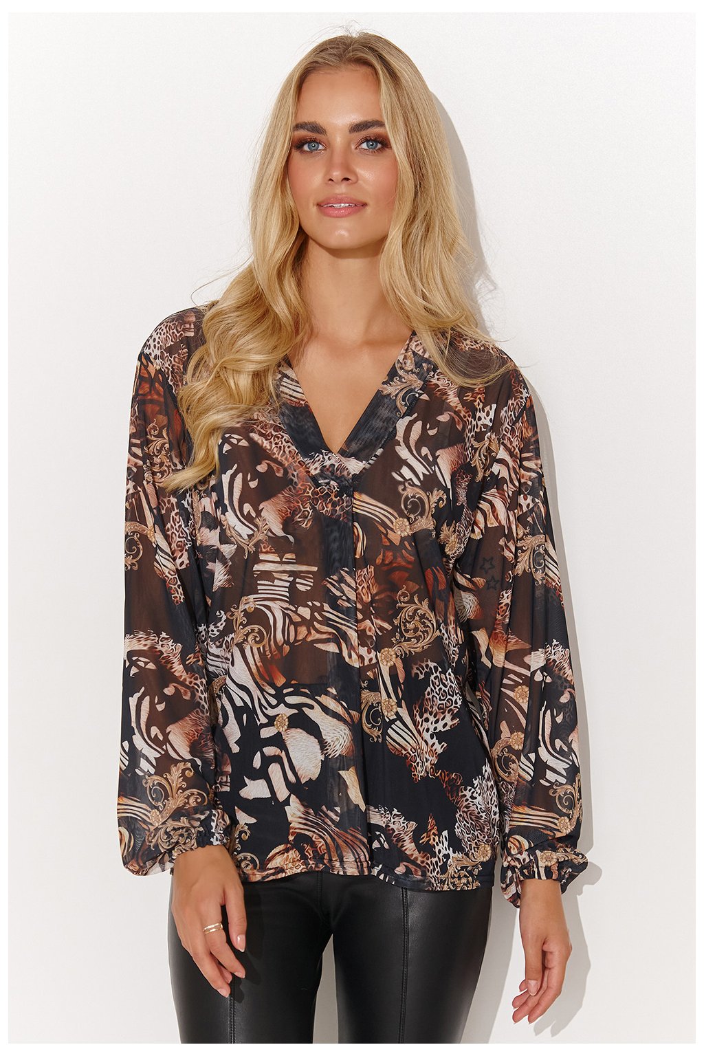 Dámská síťovaná halenka volného střihu, dostupná v 5 provedeních s různými motivy a zajímavými barvami. Má výstřih do V a ležérní dlouhé rukávy. Můžete ji nosit s džínami pro ležérní vzhled nebo s elegantními kalhotami či sukní a jehlovými podpatky pro zvláštní příležitost! Podtrhne vaši eleganci a dokonale se zkombinuje s vaším stylem. Spojte pohodlí s rafinovaností a užijte si módu jako nikdy předtím.
