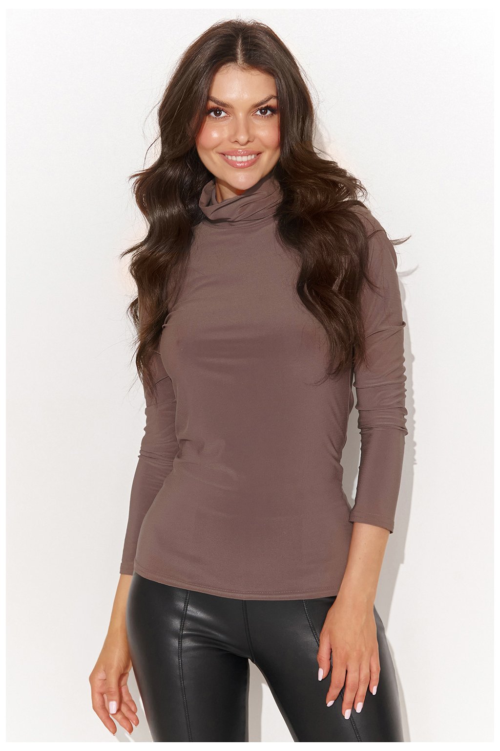 Funkční dámská halenka z elastické neprůhledné tkaniny je klasikou mezi halenkami. Výstřih v podobě praktického roláku v kombinaci s dlouhými rukávy vás zahalí v chladnějších dnech. Pozlacená destička v horní části zad mezitím dodává jemnou eleganci. Díky svému jednoduchému tvaru je ideální pro ležérní stylizaci, kterou můžete nosit jak do kanceláře, tak do města. Dámský rolák se skvěle hodí jak ke kalhotám na míru, tak ke kalhotám střihu mom fit. Tato halenka kombinuje funkčnost s elegancí a vytváří tak úspěšný recept na vzhled.