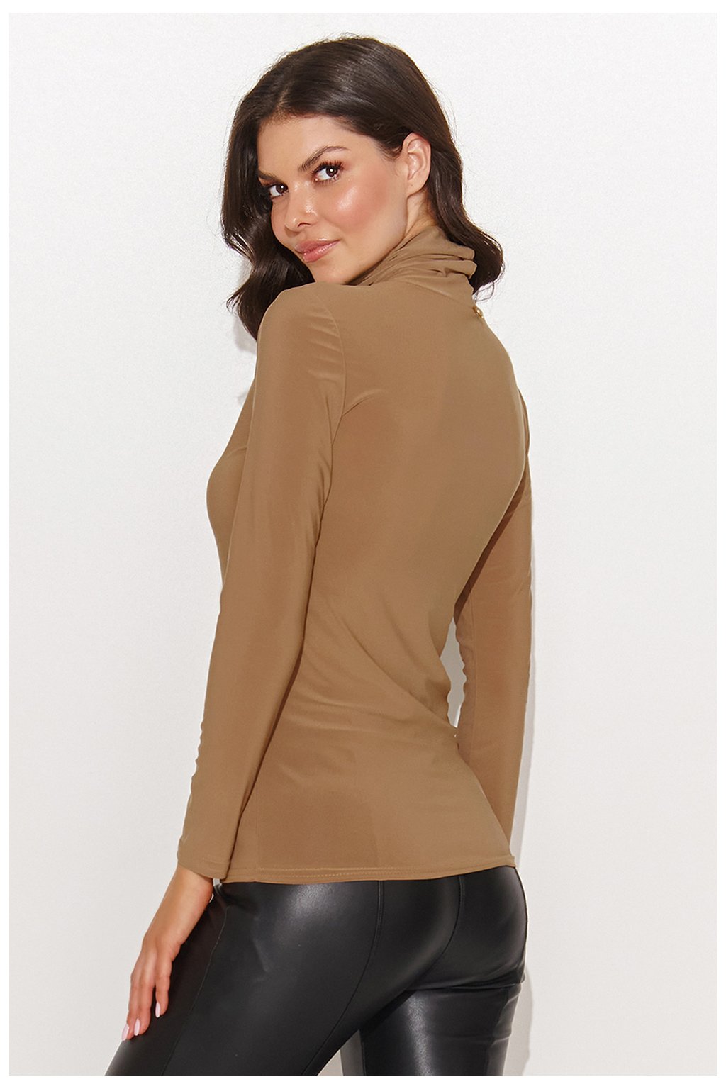 Funkční dámská halenka z elastické neprůhledné tkaniny je klasikou mezi halenkami. Výstřih v podobě praktického roláku v kombinaci s dlouhými rukávy vás zahalí v chladnějších dnech. Pozlacená destička v horní části zad mezitím dodává jemnou eleganci. Díky svému jednoduchému tvaru je ideální pro ležérní stylizaci, kterou můžete nosit jak do kanceláře, tak do města. Dámský rolák se skvěle hodí jak ke kalhotám na míru, tak ke kalhotám střihu mom fit. Tato halenka kombinuje funkčnost s elegancí a vytváří tak úspěšný recept na vzhled.