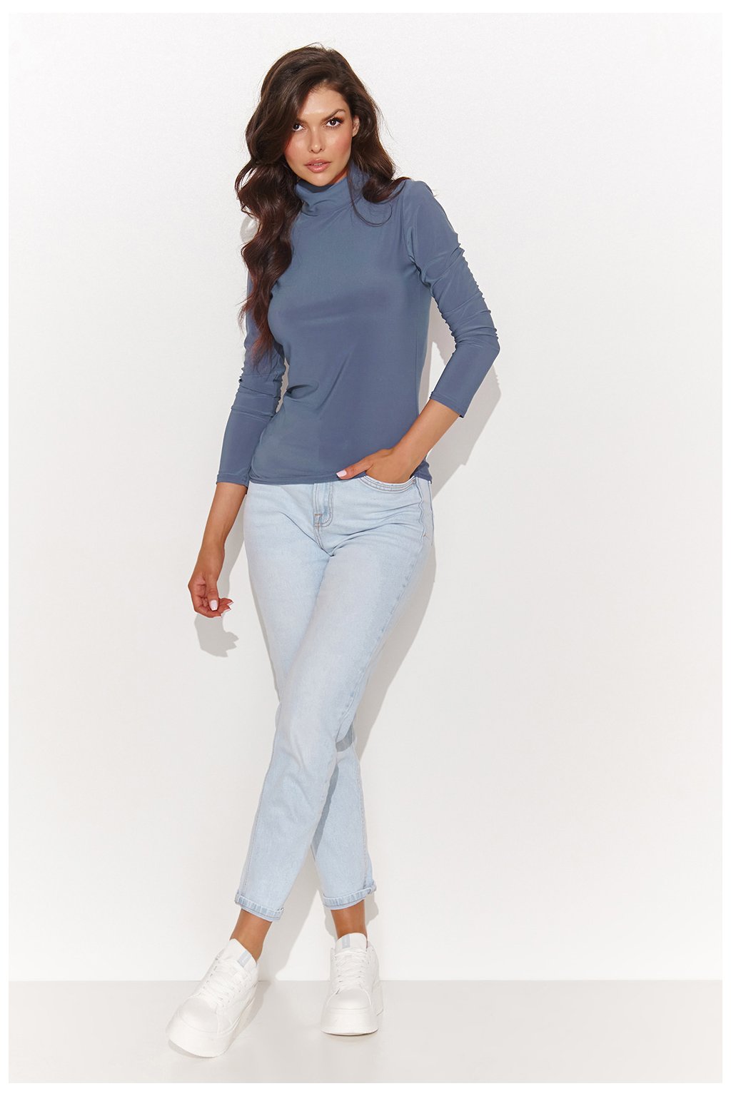 Funkční dámská halenka z elastické neprůhledné tkaniny je klasikou mezi halenkami. Výstřih v podobě praktického roláku v kombinaci s dlouhými rukávy vás zahalí v chladnějších dnech. Pozlacená destička v horní části zad mezitím dodává jemnou eleganci. Díky svému jednoduchému tvaru je ideální pro ležérní stylizaci, kterou můžete nosit jak do kanceláře, tak do města. Dámský rolák se skvěle hodí jak ke kalhotám na míru, tak ke kalhotám střihu mom fit. Tato halenka kombinuje funkčnost s elegancí a vytváří tak úspěšný recept na vzhled.