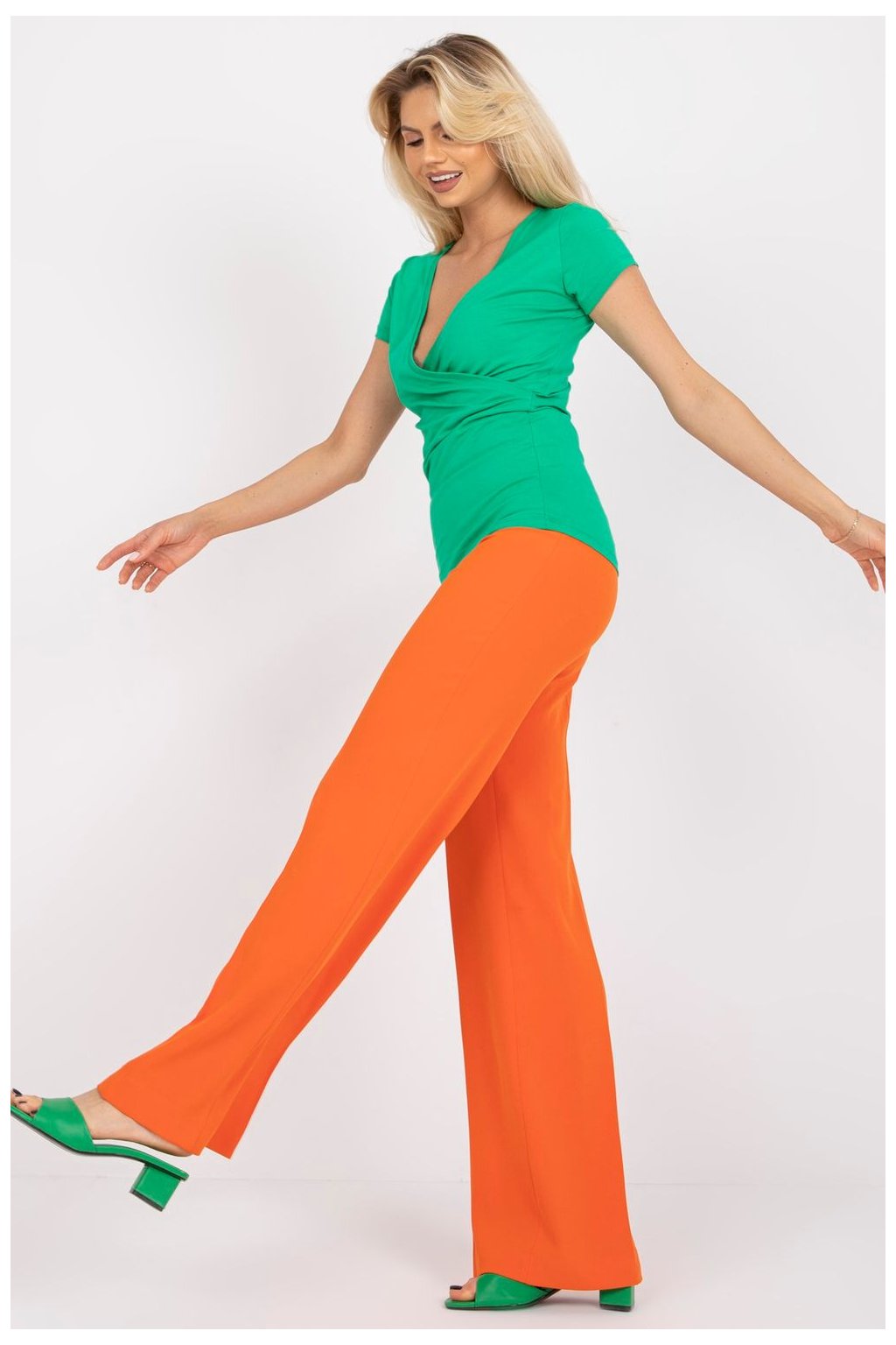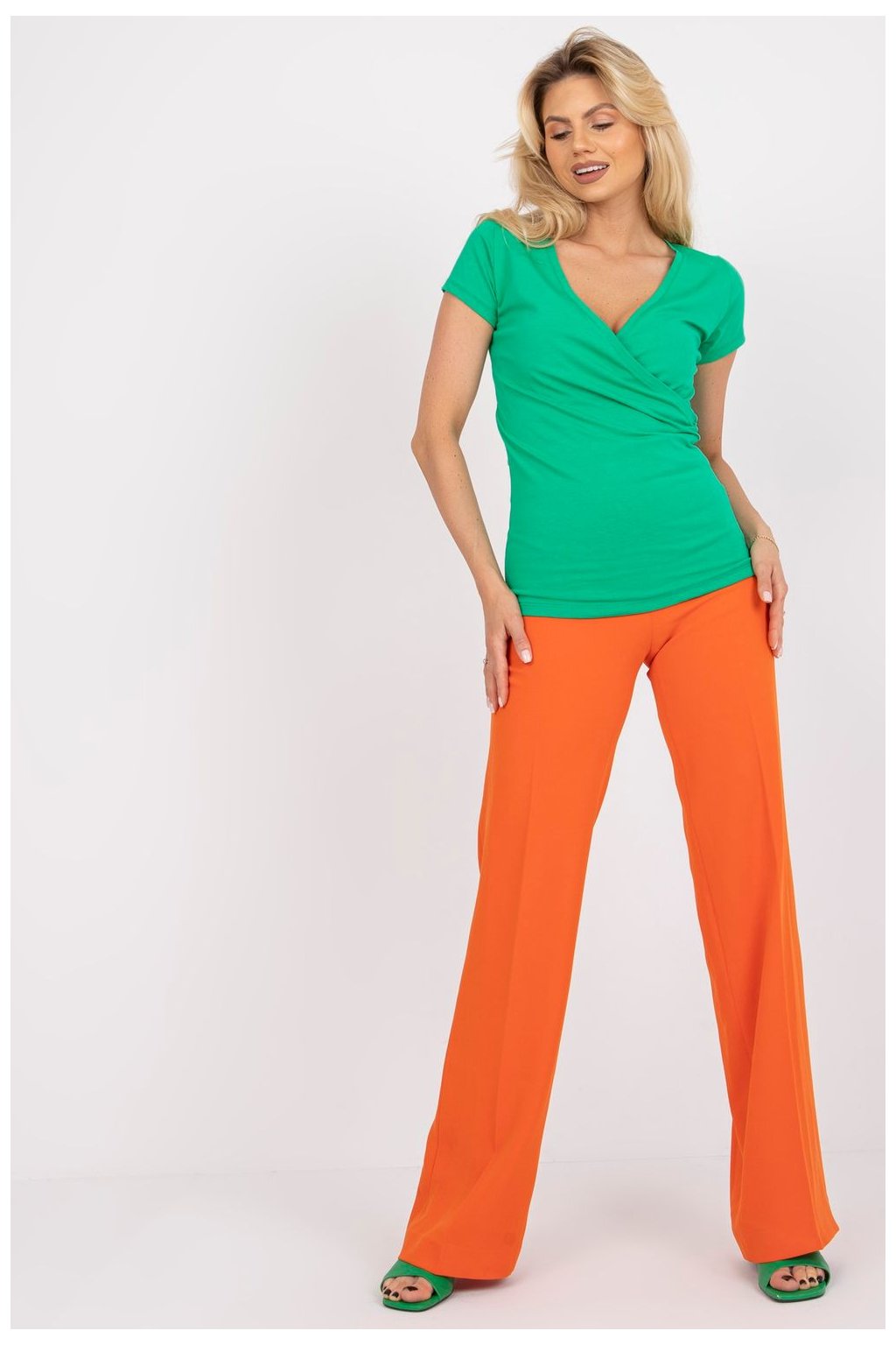 Přiléhavá halenka s krátkými rukávy a obálkovým výstřihem. Návrh ideální pro mnoho příležitostí.