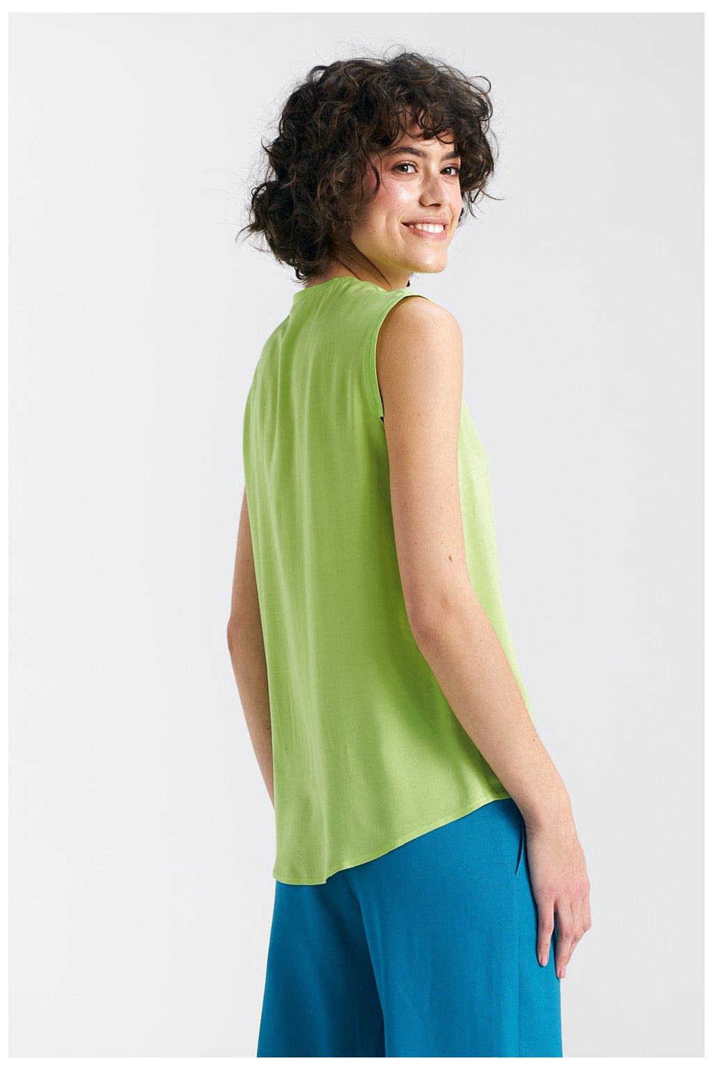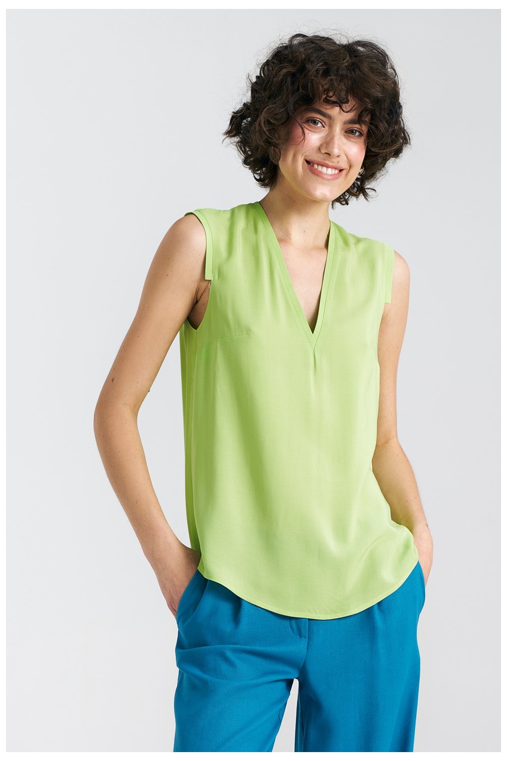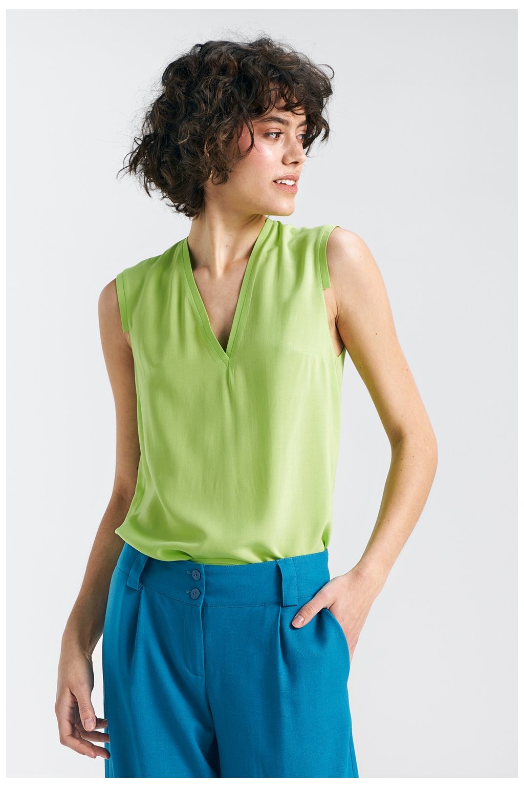 Halenka pravidelného střihu zaujme svou jednoduchostí a elegancí. Je vyrobena z příjemné viskózové tkaniny pro pohodlí a volnost pohybu. Její hluboký a zároveň decentní výstřih ve tvaru písmene V dodává celkovému vzhledu sofistikovaný nádech. Top bez rukávů je ideální volbou pro teplé dny a dodá každému outfitu lehkost a svěžest. Mimořádně ženské a stylové zdobení ramen a výstřihu v podobě jemného řasení dodává halence jemný půvab a jedinečný charakter. Limetková barva, známá také jako cyber lime, dodává halence jedinečný a módní výraz. Je dokonalou volbou pro ty, kteří ocení jak klasiku, tak i nádech extravagance. Tato halenka, zastrčená přes hlavu, bude dokonalým doplňkem vašeho šatníku a dodá jedinečný styl každému ženskému outfitu.