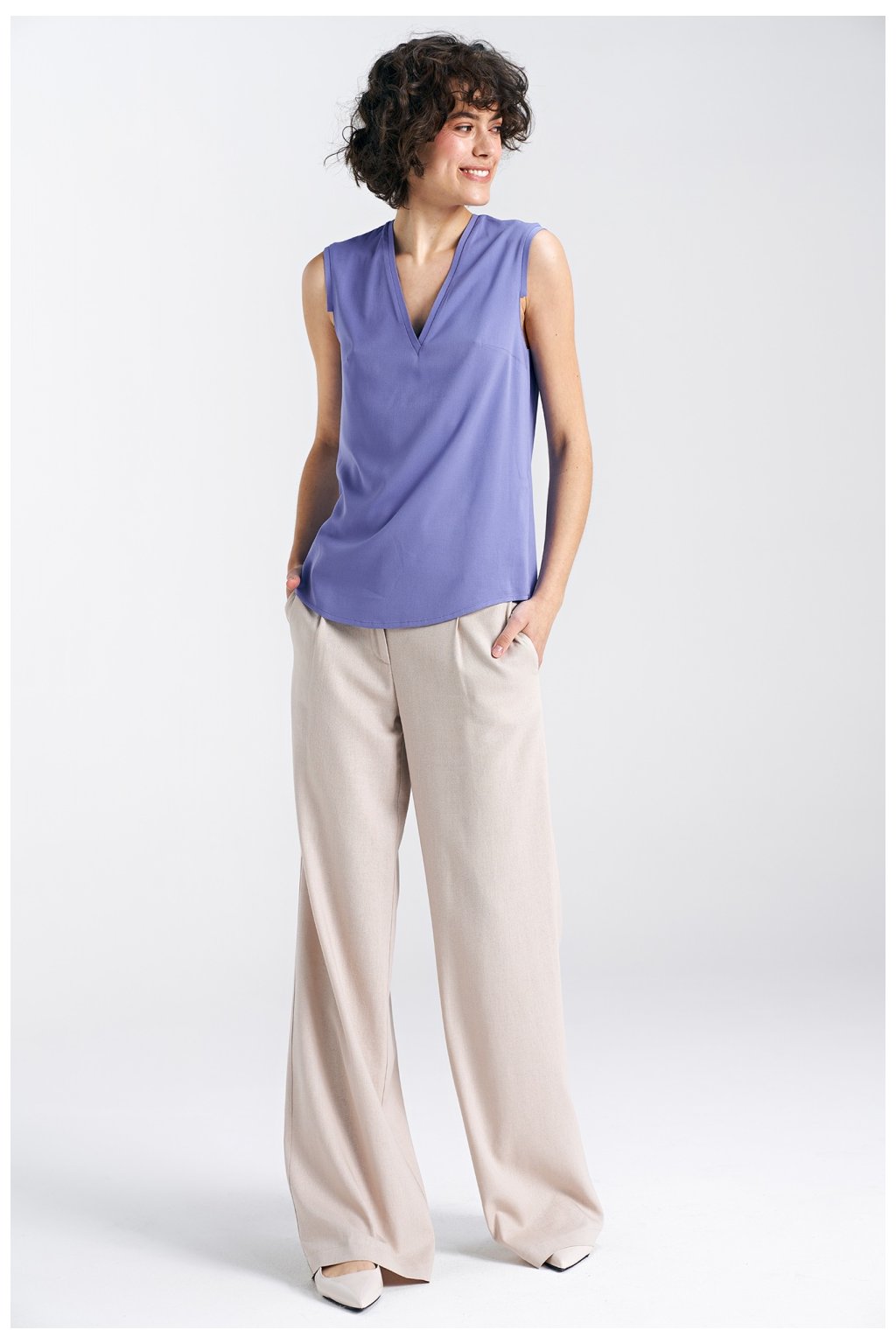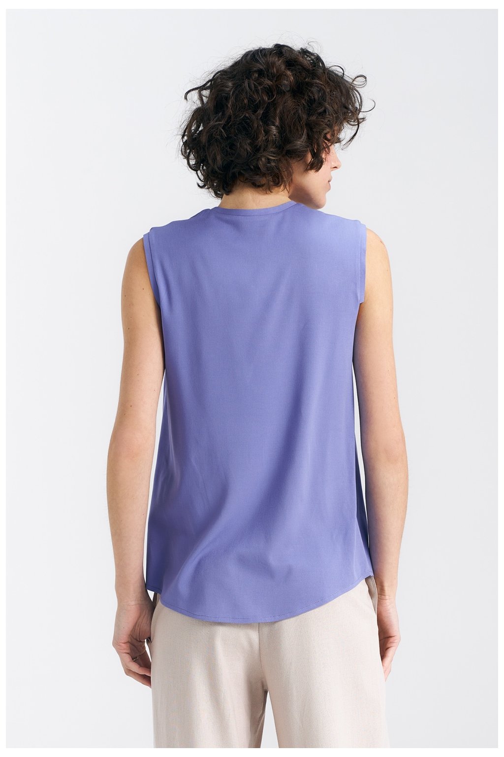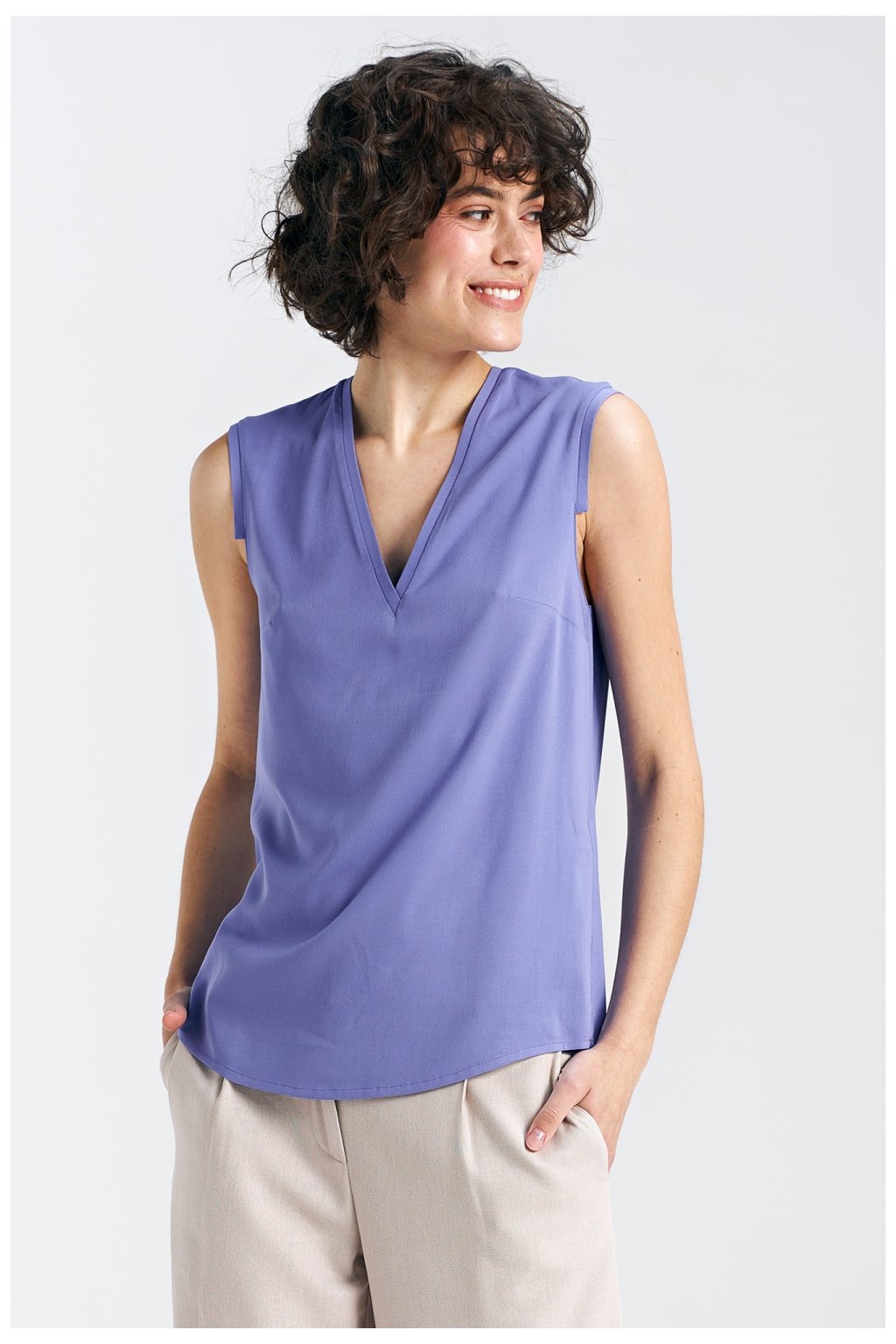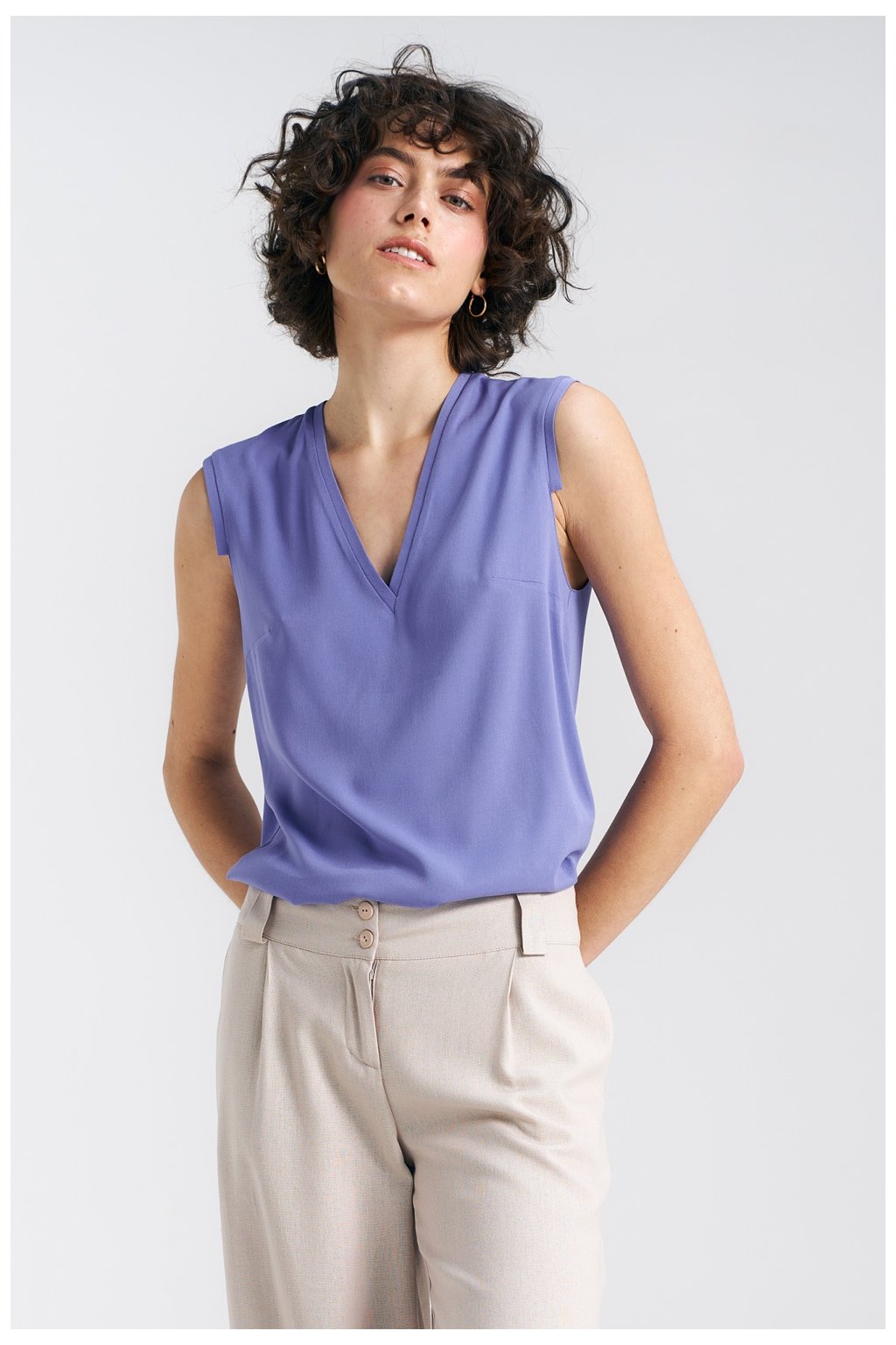 Halenka pravidelného střihu zaujme svou jednoduchostí a elegancí. Je vyrobena z příjemného viskózového materiálu pro pohodlí a volnost pohybu. Její hluboký a zároveň decentní výstřih ve tvaru písmene V dodává celkovému vzhledu sofistikovaný nádech. Top bez rukávů je ideální volbou pro teplé dny a dodá každému outfitu lehkost a svěžest. Mimořádně ženské a stylové zakončení ramen a výstřihu v podobě jemného řasení dodává halence jemný půvab a jedinečný charakter. Je dokonalou volbou pro ty, kteří ocení jak klasiku, tak i nádech extravagance. Tato halenka, zastrčená přes hlavu, bude dokonalým doplňkem vašeho šatníku a dodá jedinečný styl každému ženskému outfitu.