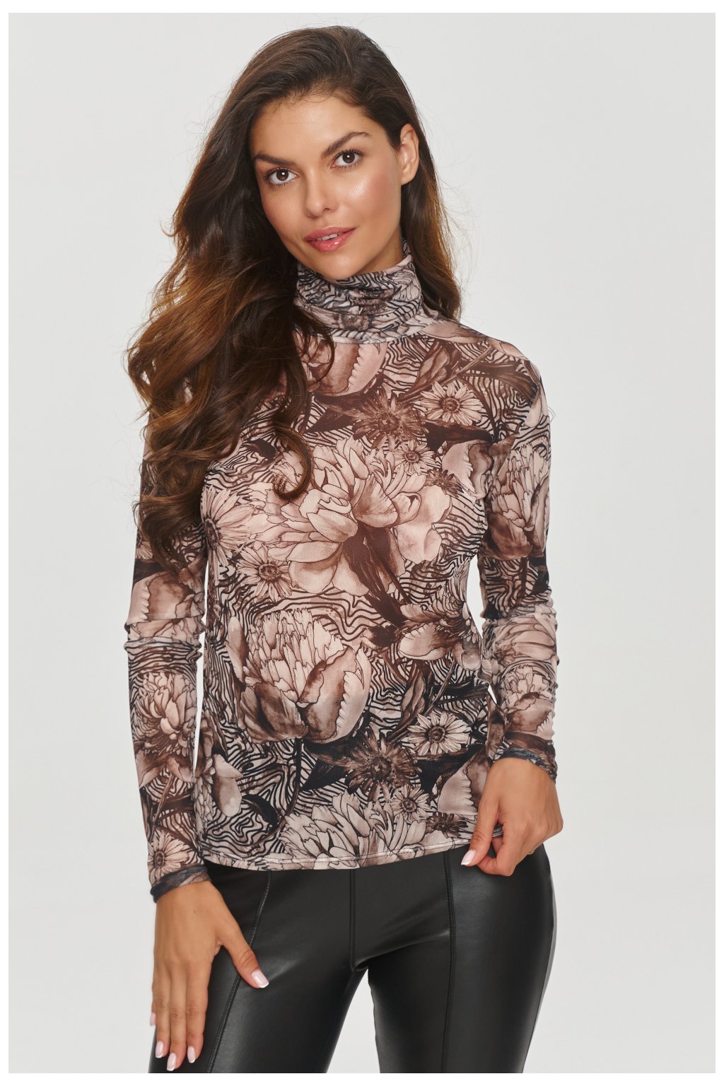 Tisková halenka je výrazný a módní návrh, ideální pro ženy, které rády nosí originální vzory a odvážné stylizace. Model má přizpůsobivý střih, který zdůrazní siluetu, ale díky elastickému materiálu je také pohodlný při nošení. Vyrobená z tenkého, průhledného materiálu, který jí dodává lehkost a subtilní eleganci. Díky poloprůhlednosti získává halenka moderní a smyslný charakter. Jejím charakteristickým prvkem je vysoký, růžkovaný golfový límec, který jí dodává eleganci a lehkost. Celý model je pokryt dynamickým vzorem, který spojuje originalitu s rafinovaností, vytvářející záhadný a moderní efekt. Kombinace halenky s černými koženými kalhotami vytváří odvážný rockový vzhled, což dává celkovému vzhledu výrazný charakter. Halenka je ideální pro večerní výstupy nebo pro více volné, ale stylové příležitosti. Vzor a materiál ji určitě přitáhnou pozornost a zdůrazní unikátní styl. Model je k dispozici v několika barevných variantách od zvířecích po abstraktní a květinové vzory.