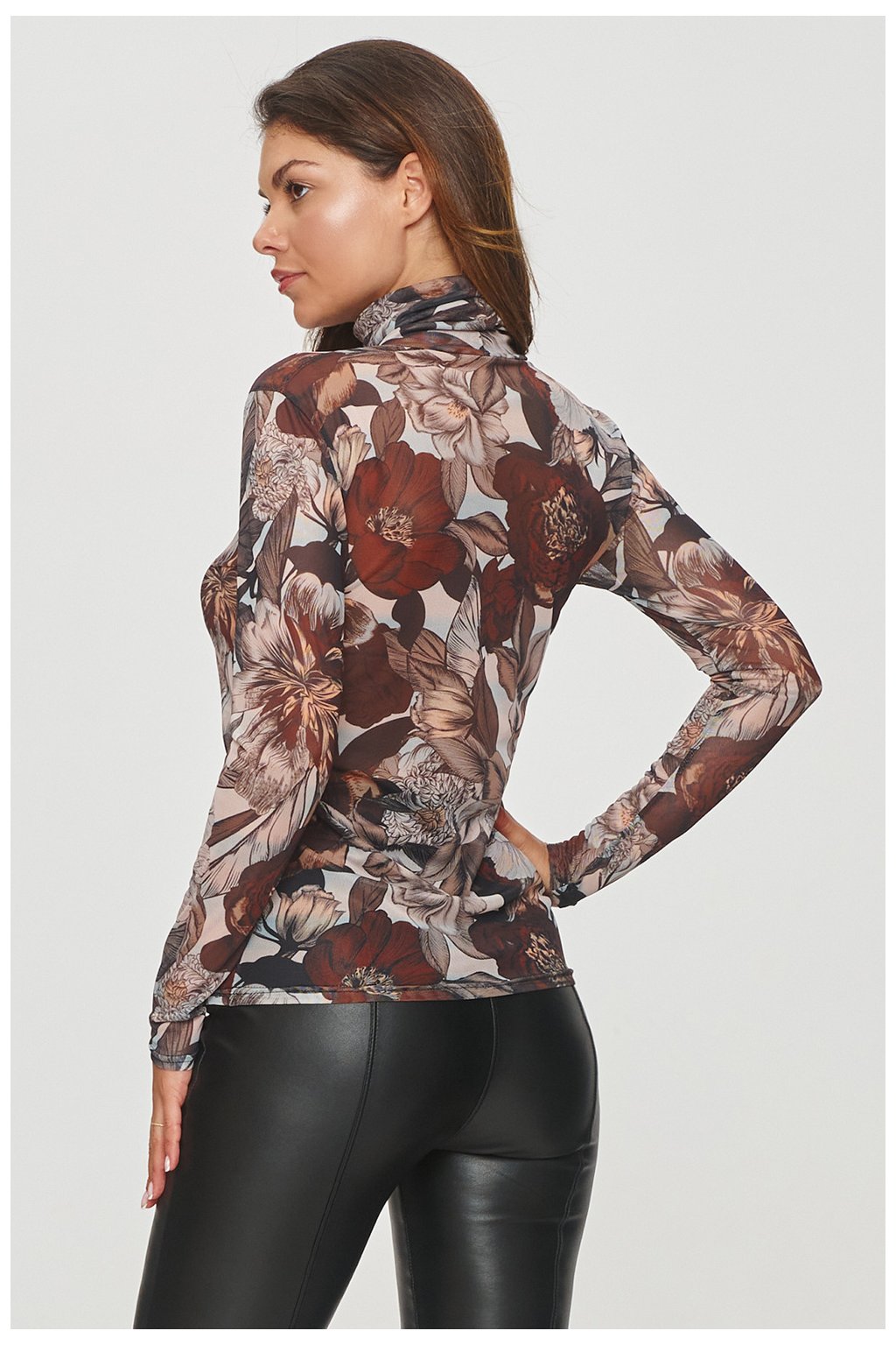 Tisková halenka je výrazný a módní návrh, ideální pro ženy, které milují originální vzory a odvážné stylizace. Model má přizpůsobený střih, který zdůrazňuje siluetu, ale díky elastickému materiálu je také pohodlný při nošení. Vyrobená z tenkého, průhledného materiálu, který jí dodává lehkosti a subtilní elegance. Díky poloprůhlednosti získává halenka moderní, smyslný charakter. Charakteristickým prvkem je vysoký, růžkovaný golfový límec, který jí dodává eleganci a lehkost. Celý model je pokryt dynamickým vzorem, který spojuje originalitu s rafinovaností vytvářející zajímavý, moderní efekt. Kombinace halenky s černými koženými kalhotami vytváří odvážný, rockový vzhled a dodává celkovému vzhledu výrazný charakter. Halenka je ideální na večerní vycházky nebo na více neformální, ale stylové příležitosti. Vzor a materiál zajistí, že si určitě přitáhne pozornost a zdůrazní jedinečný styl. Model je k dispozici v několika barevných variantách od zvířecích po abstraktní a květinové vzory.