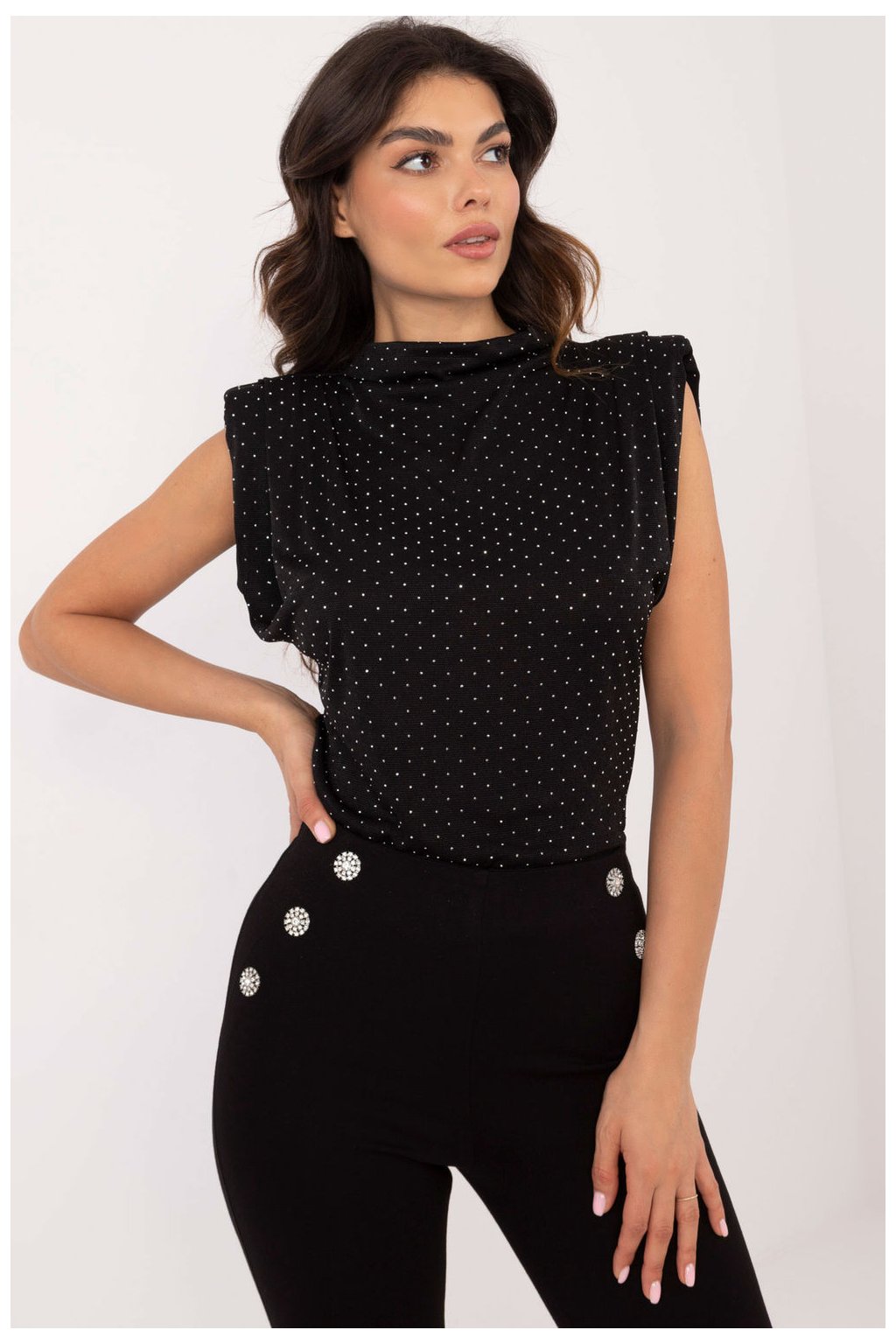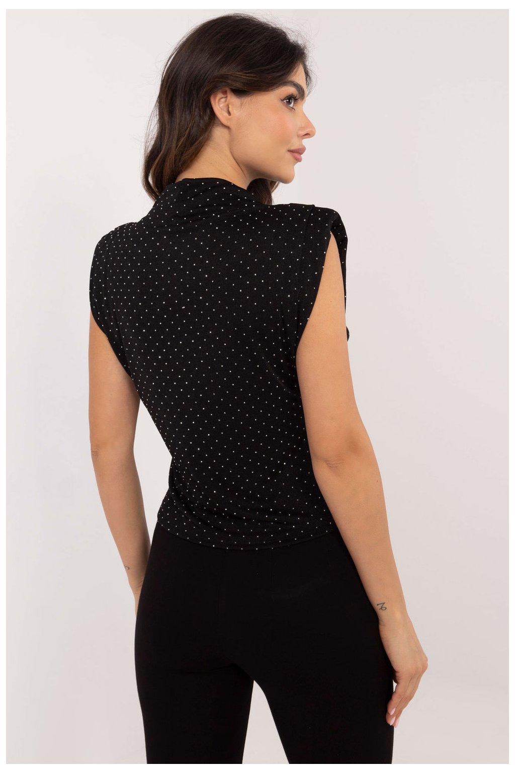 Elegantní blůzka ideální na formální příležitosti, do práce i na večírky. Vyrobená z vysoké kvality směsi polyesteru a elastanu, poskytuje pohodlí a skvělé přizpůsobení postavě. Má vestavěné ramenní polštářky, které jí dodávají strukturu a eleganci, jemně zdůrazňující ramena. Blůzka má standardní délku a bez rukávů, co jí dodává moderní a lehký charakter. Kulatý výstřih se harmonicky hodí k celku a ozdobné flitry rozmístěné po celém materiálu jí dodávají lesku a rafinovanosti. Je to dokonalá volba pro ženy, které si cení stylu a elegance.