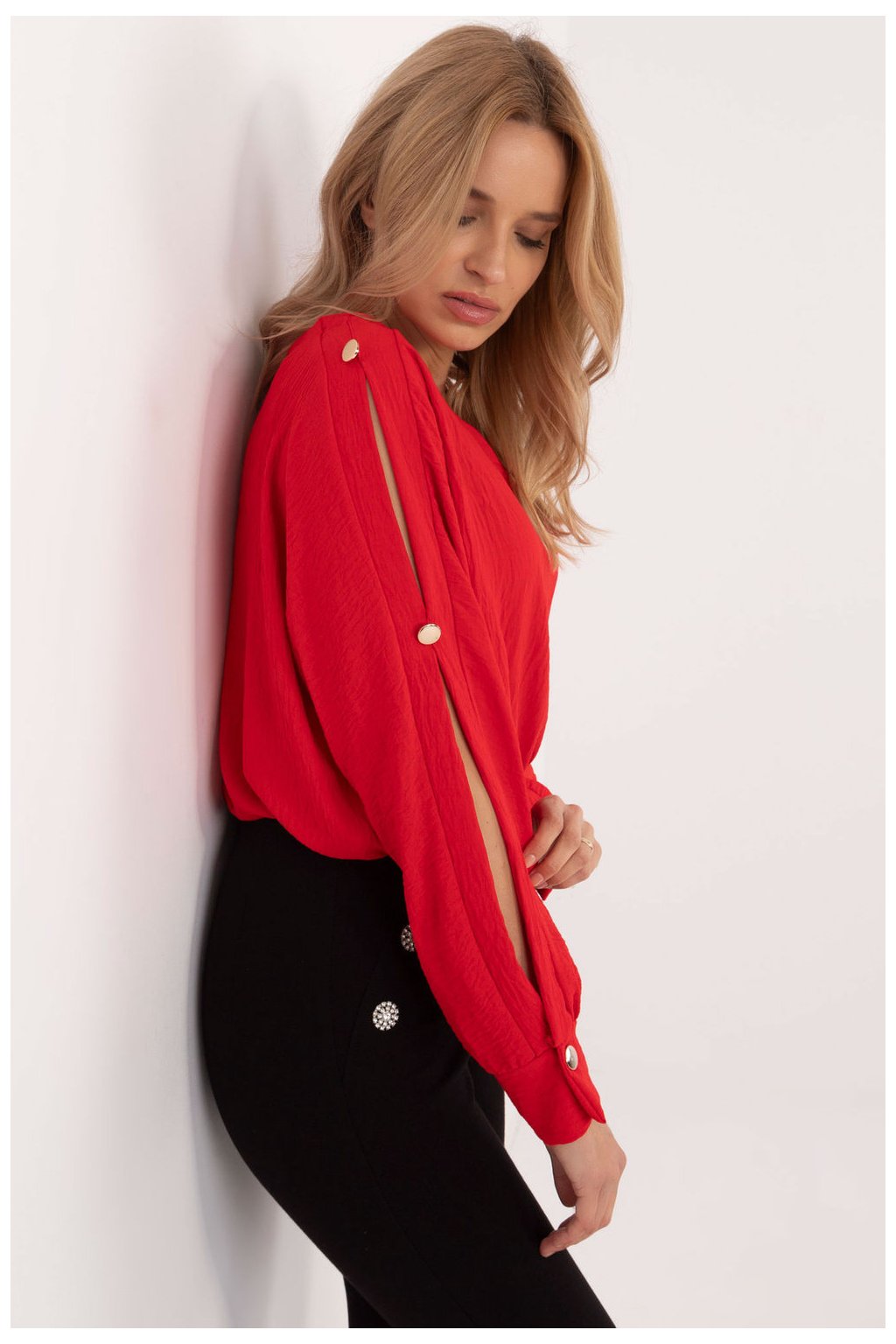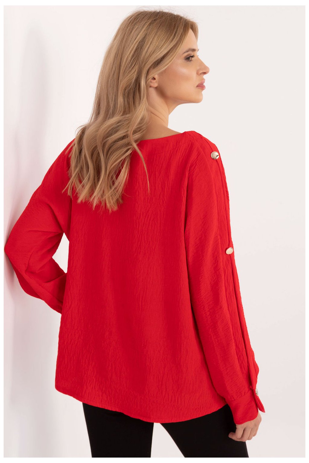 Elegantní klasická blůza, ideální na každodenní nošení, do práce a na formální události. Vyrobena z vysoce kvalitního materiálu kombinujícího polyester a elastan, co zajišťuje pohodlí a odolnost. Blůza má standardní délku a její lodní výstřih dodává subtilní eleganci. Dlouhé rukávy s rozparky a ozdobnými knoflíčky jsou módním akcentem, který tento model vyzdvihuje. Hladká tkanina dělá blůzu snadno kombinovatelnou a skvěle se hodí k různým kouskům šatníku. Ideální na mnoho příležitostí, poskytující klasický, ale moderní vzhled.