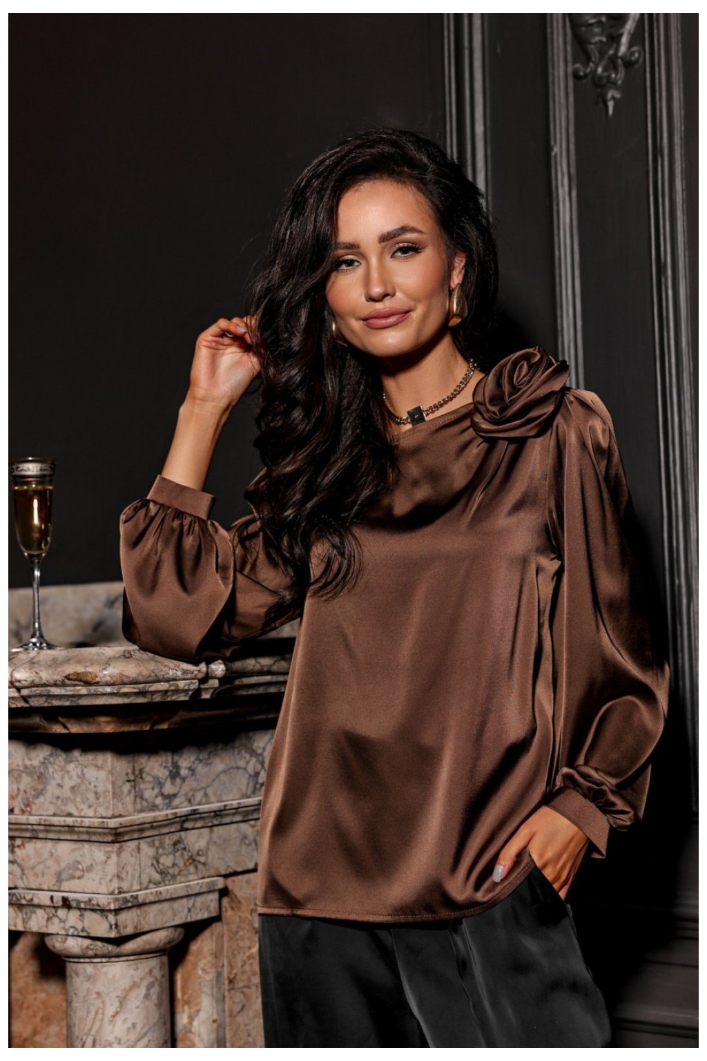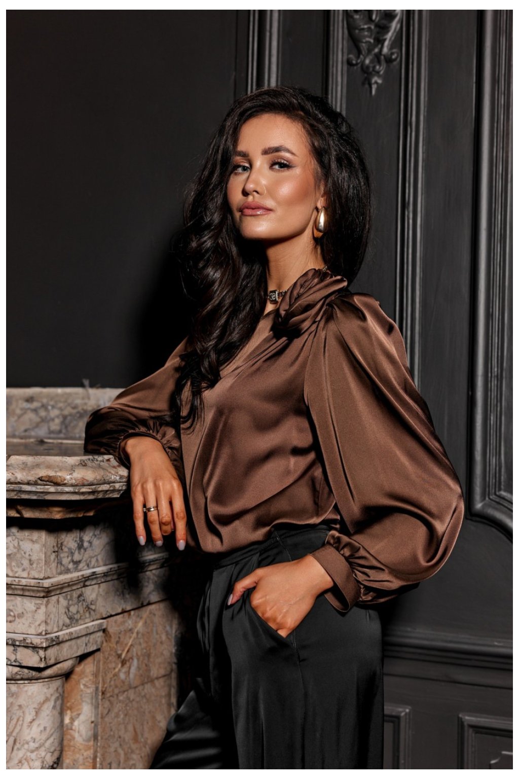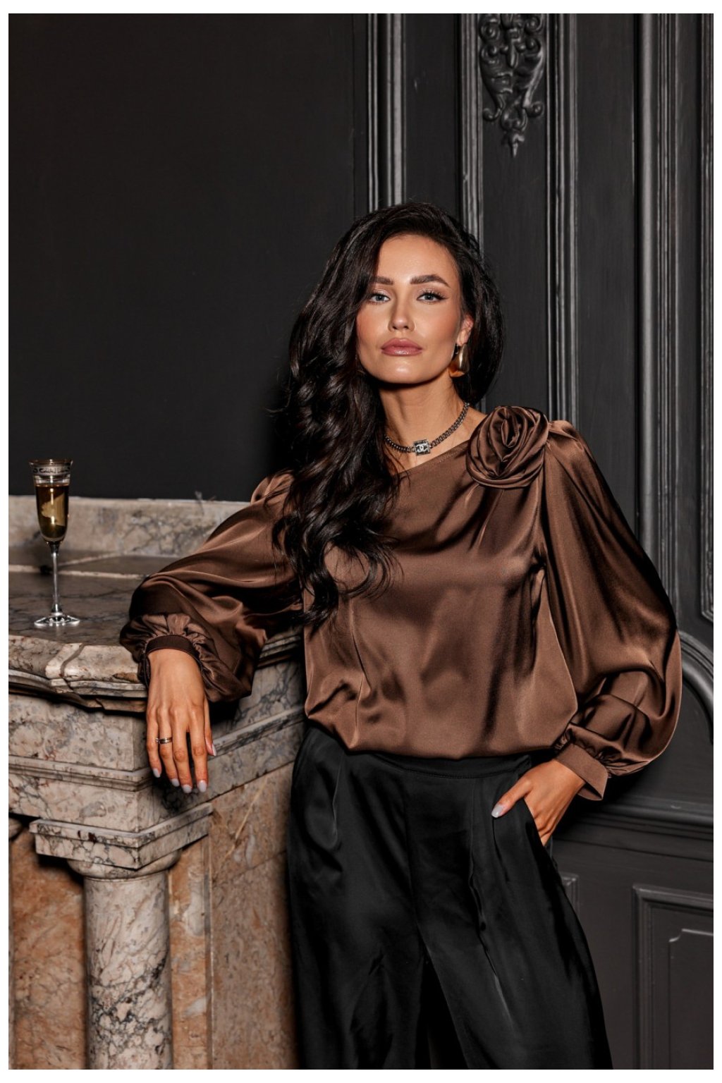 Blůza Evelyn je model vyrobený z saténové látky, která dodává stylizaci velmi elegantní a luxusní vzhled. Kulatý výstřih je zdobený efektní růží, která přidává nonšalanci a styl, zároveň však dělá z blůzy originální kousek. Široké, nafouklé rukávy délky 3/4 krásně zdůrazňují ramena a ženskou siluetu. Její volný střih zaručuje pohodlí pohybu a nošení. Blůza Evelyn se skvěle hodí do elegantních a slavnostních stylizací. Můžete ji zkombinovat s dlouhými saténovými kalhotami, úzkou midi sukní a sako s jednoduchým střihem a dlouhými kozačkami nad kolena, abyste dosáhli velmi efektního stylu vhodného na vánoční večírky a elegantní oslavy. Produkt je vyroben a ušit v Polsku.