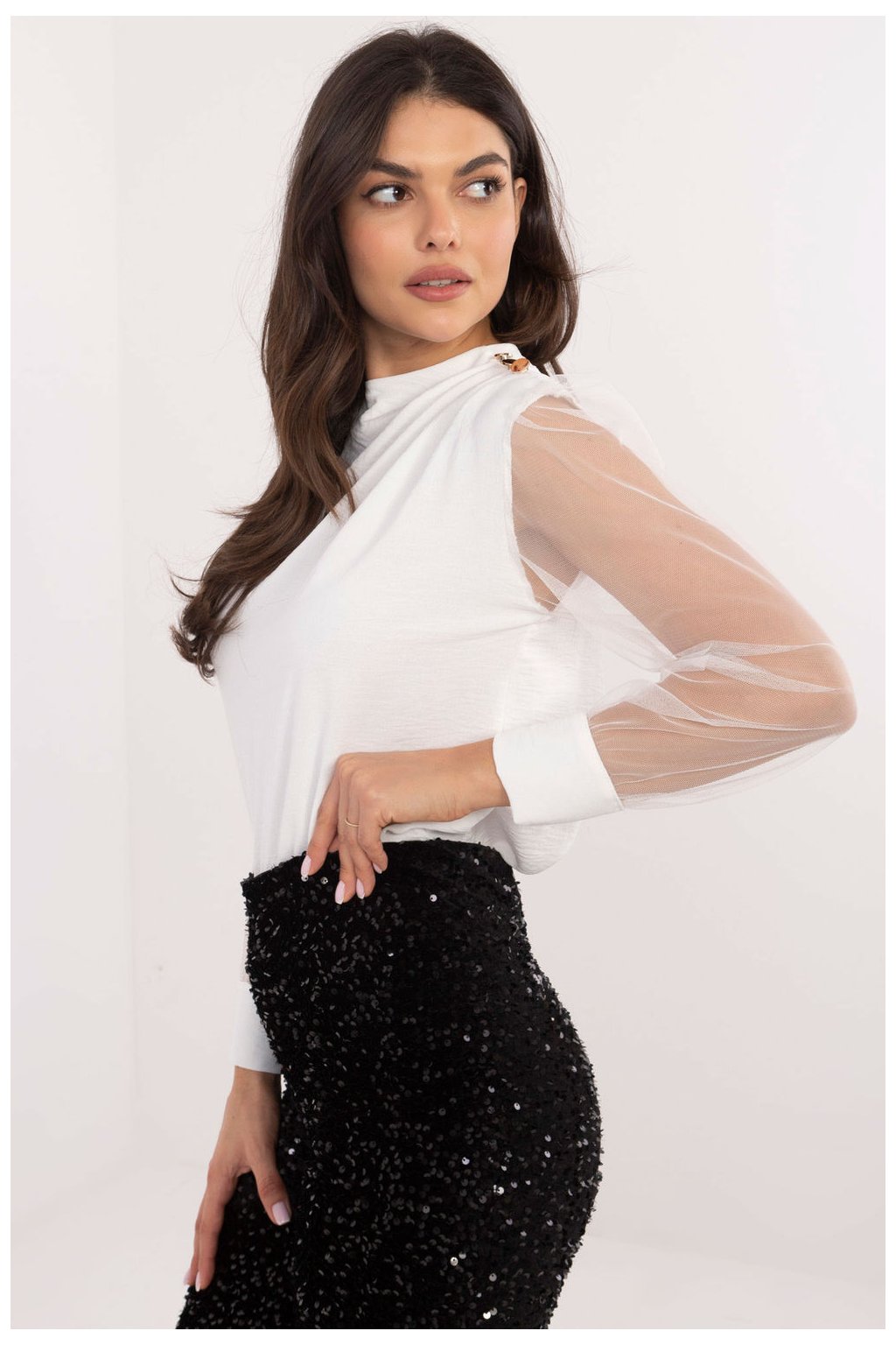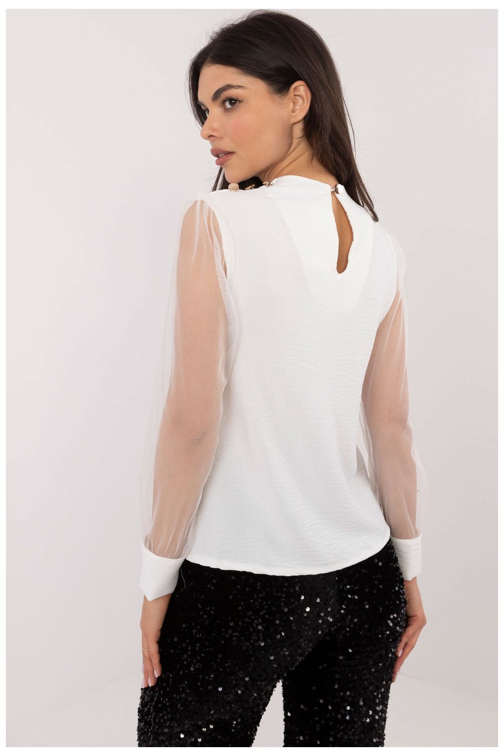 Elegantní blůza s jemným ženským stylem, ideální na slavnostní příležitosti i do práce. Vyrobena z hladké látky z polyesteru a elastanu, která poskytuje pohodlí a jemně se přizpůsobuje postavě. Blůza má kulatý výstřih a její ozdobou jsou efektní dlouhé rukávy ze síťoviny, které dodávají lehkost a eleganci. Vypasované rukávy s ozdobnými záhyby na ramenou a jemnými knoflíčky dodávají celku výjimečný charakter. Standardní délka umožňuje, aby se blůza skvěle kombinovala jak s sukněmi, tak s kalhotami, vytvářející elegantní stylizace.
