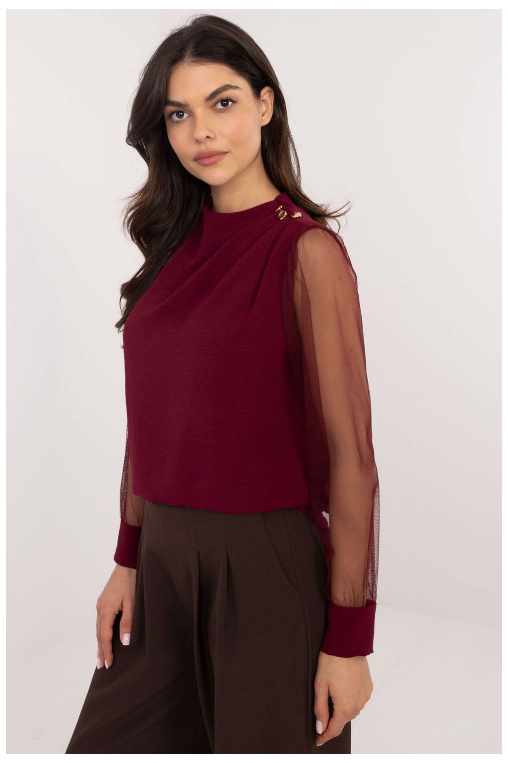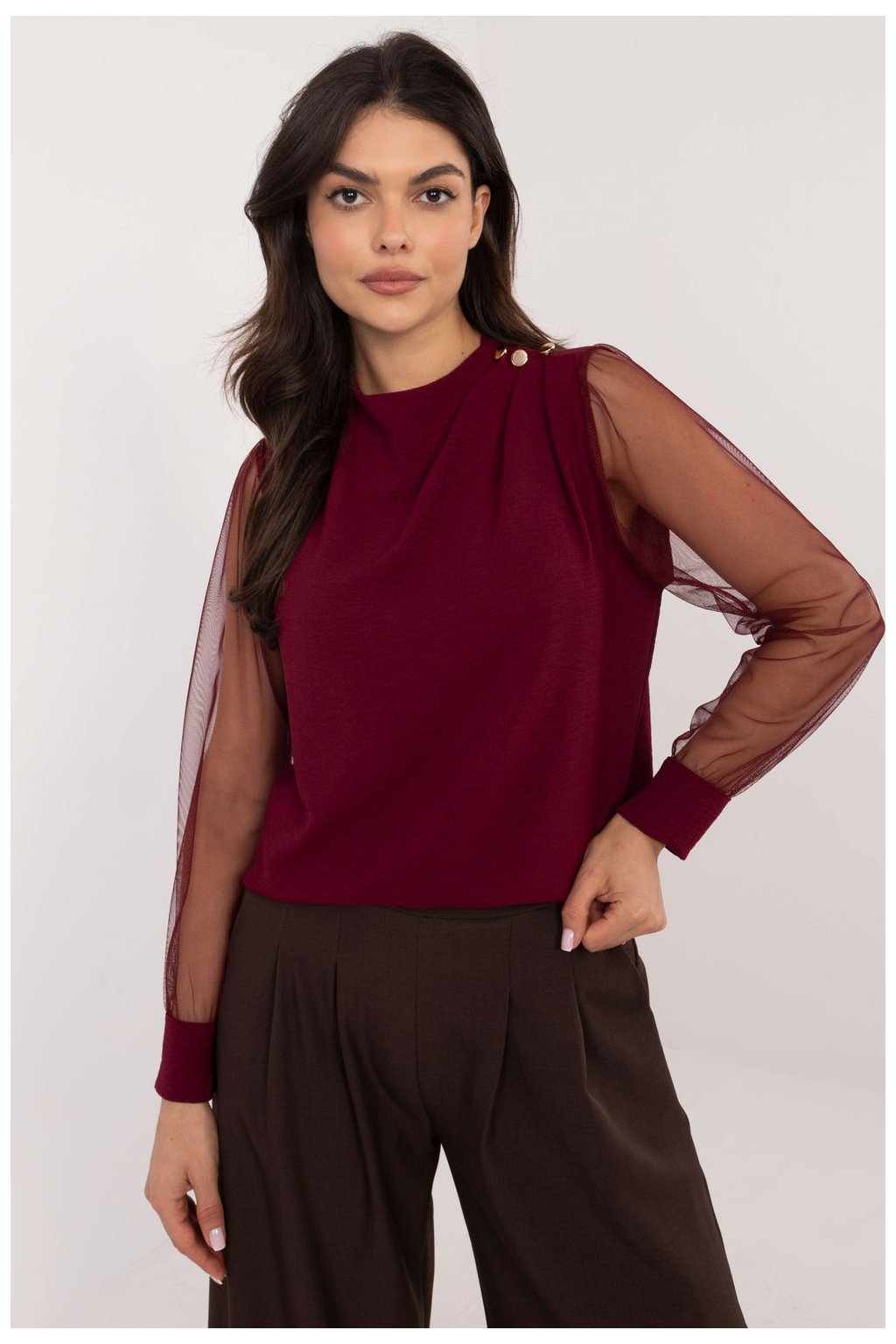 Elegantní halenka s jemným ženským stylem, ideální na formální události i do práce. Vyrobena z hladké látky z polyesteru a elastanu, která poskytuje pohodlí a jemně se přizpůsobuje postavě. Halenka má kulatý výstřih a její ozdobou jsou efektní dlouhé rukávy ze síťoviny, které dodávají lehkost a eleganci. Nafouklé rukávy s ozdobnými záhyby na ramenou a jemnými knoflíčky dávají celku výjimečný charakter. Standardní délka dělá halenku skvěle sladitelnou jak s sukněmi, tak s kalhoty, vytvářející elegantní outfit.