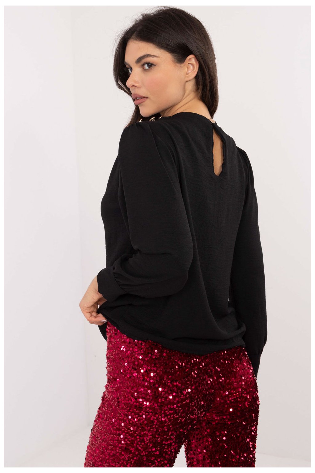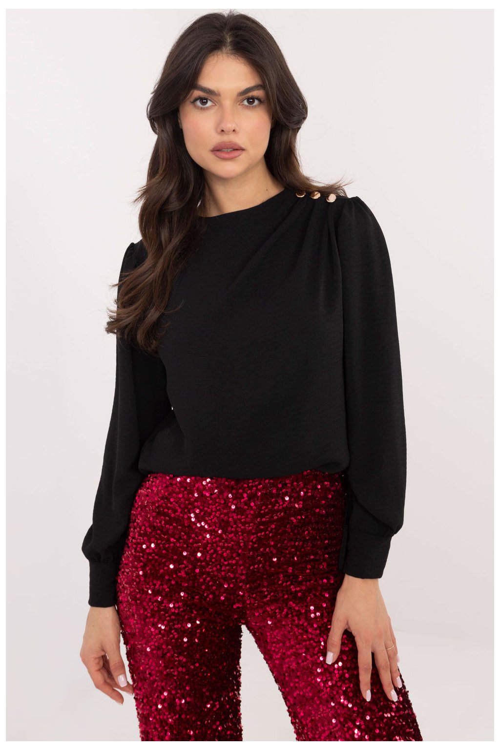 Elegantní blůzka s jemným ženským stylem, ideální na slavnostní příležitosti i do práce. Vyrobena z hladké látky směsi polyesteru a elastanu, která poskytuje pohodlí a jemně se přizpůsobuje postavě. Blůzka má kulatý výstřih a její ozdobou jsou efektní dlouhé rukávy, které dodávají eleganci. Vypasované rukávy s ozdobnými záhyby na ramenou a jemnými knoflíčky dodávají celku výjimečný charakter. Standardní délka umožňuje blůzku skvěle kombinovat jak s sukněmi, tak s kalhotami, vytvářející elegantní outfit.