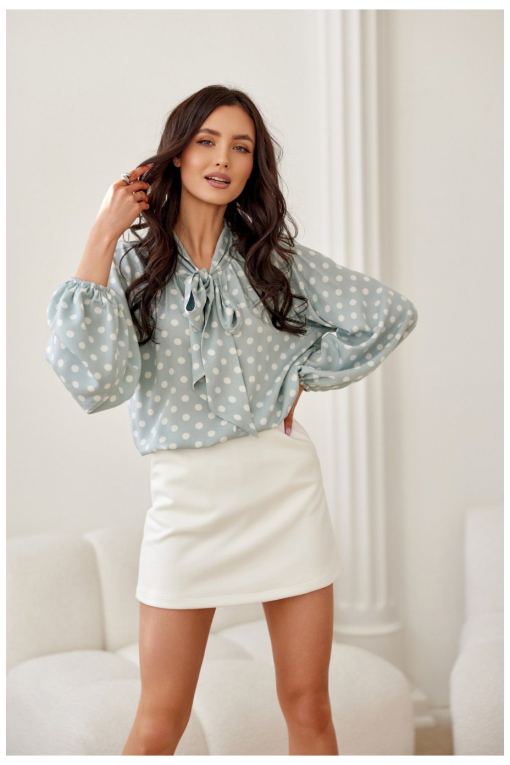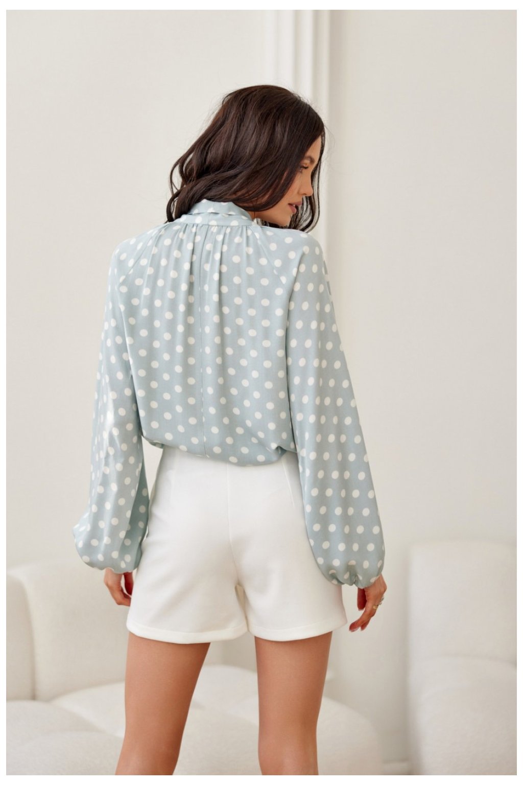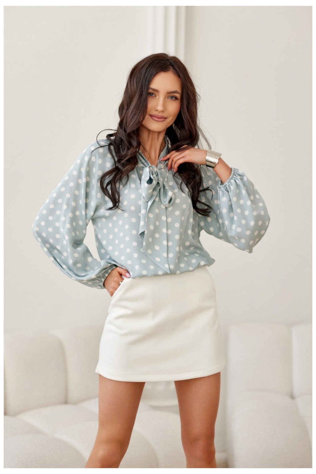 Halena s dlouhými nafouklými rukávy zakončenými elastickou gumičkou. Má ozdobné vázání u dekoltu.