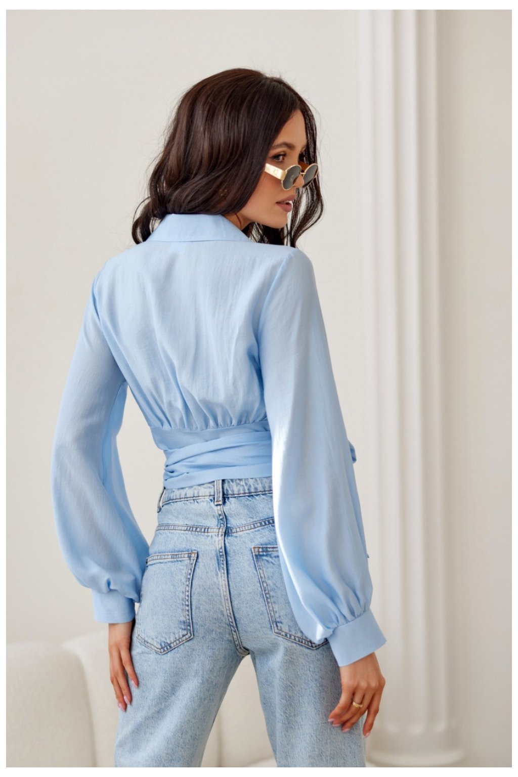 Krátký top s límečkem a skládaným výstřihem, se šněrováním v pase a dlouhými nadýchanými rukávy. Model s krátkou délkou.