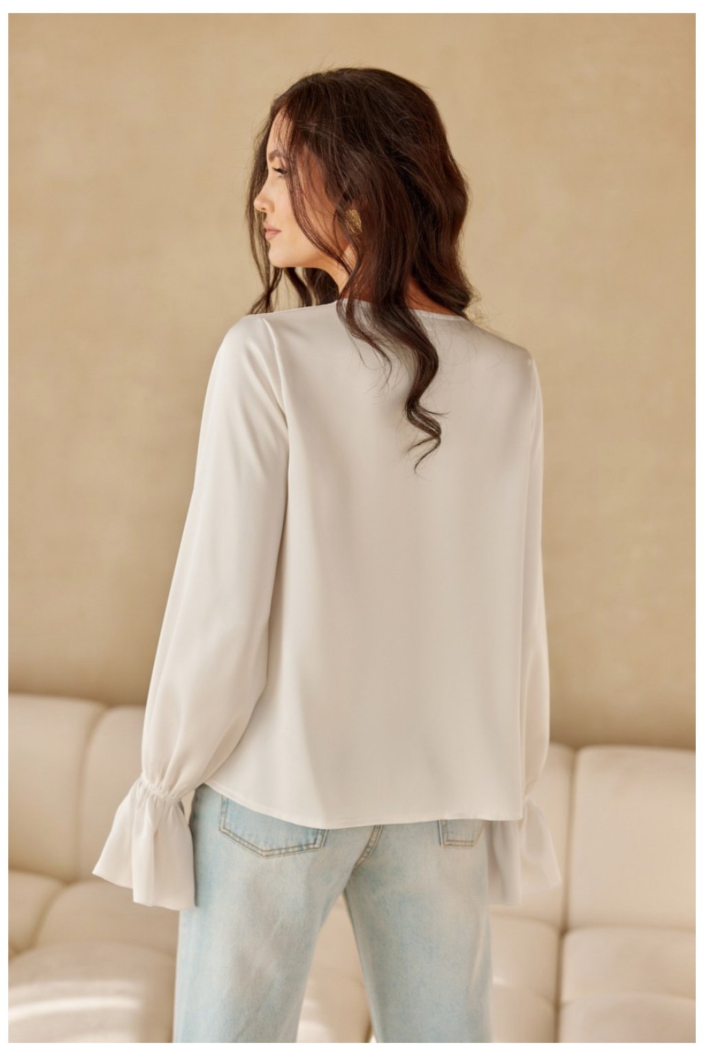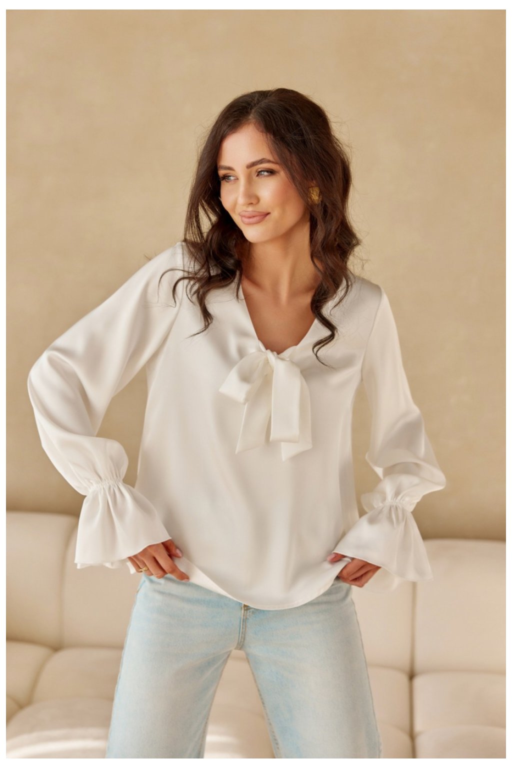 Halenní s dlouhými nafouklými rukávy ukončenými elastickou gumou. Má ozdobné vázání na výstřihu.