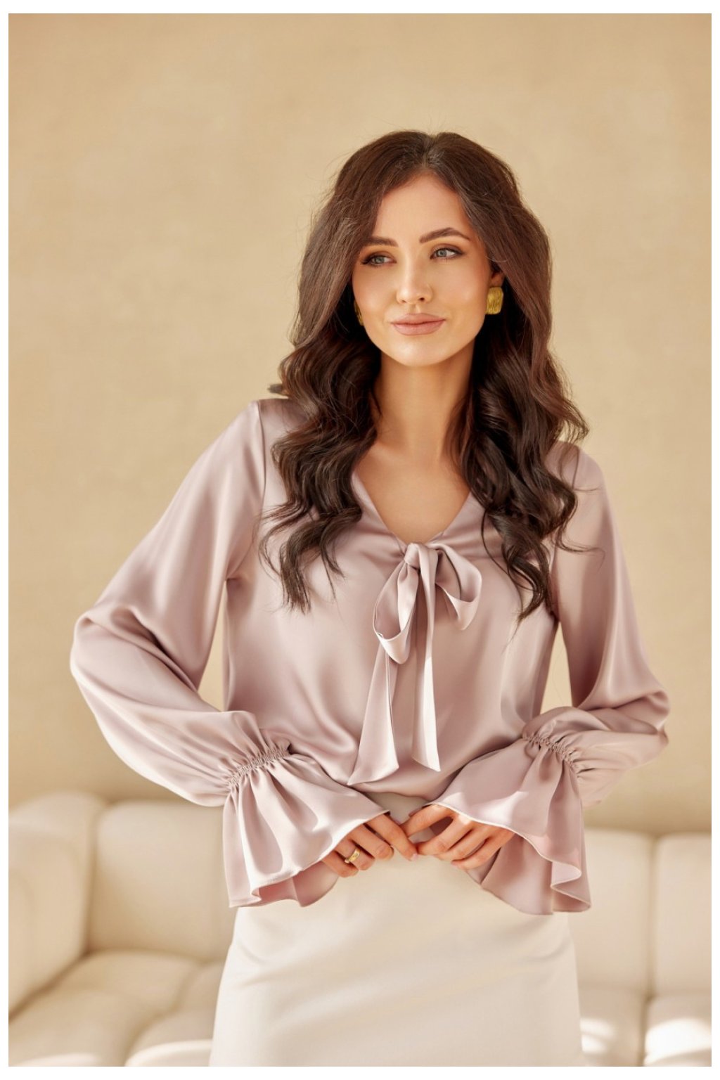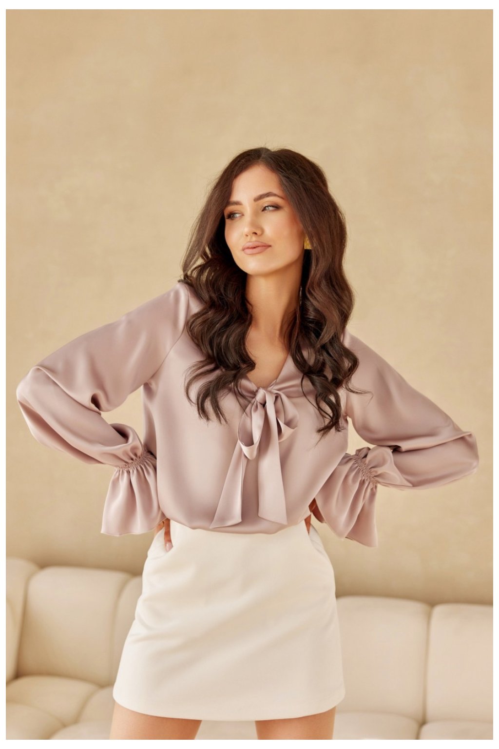 Halena s dlouhými nadýchanými rukávy zakončenými elastickou gumičkou. Má ozdobné vázání na výstřihu.