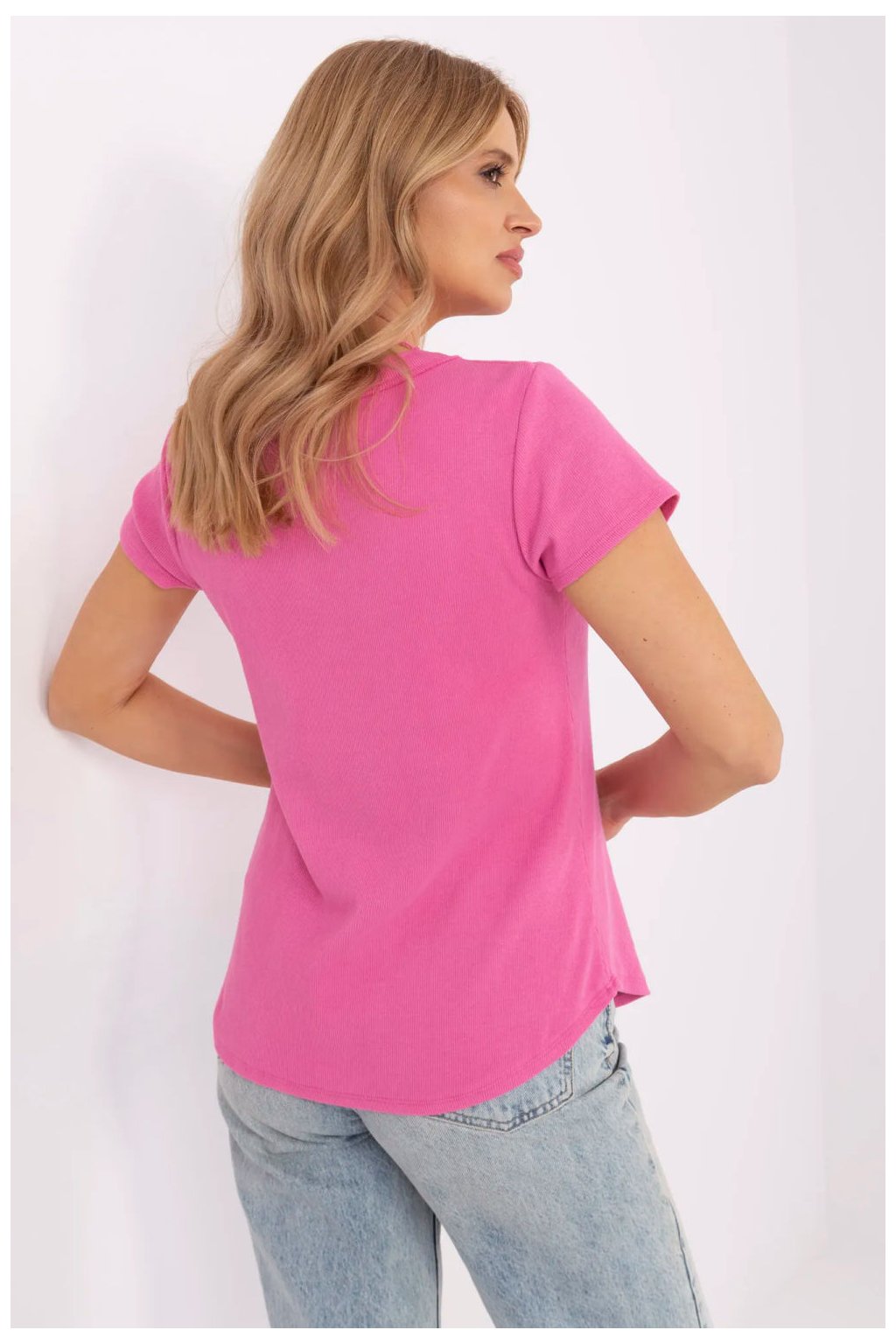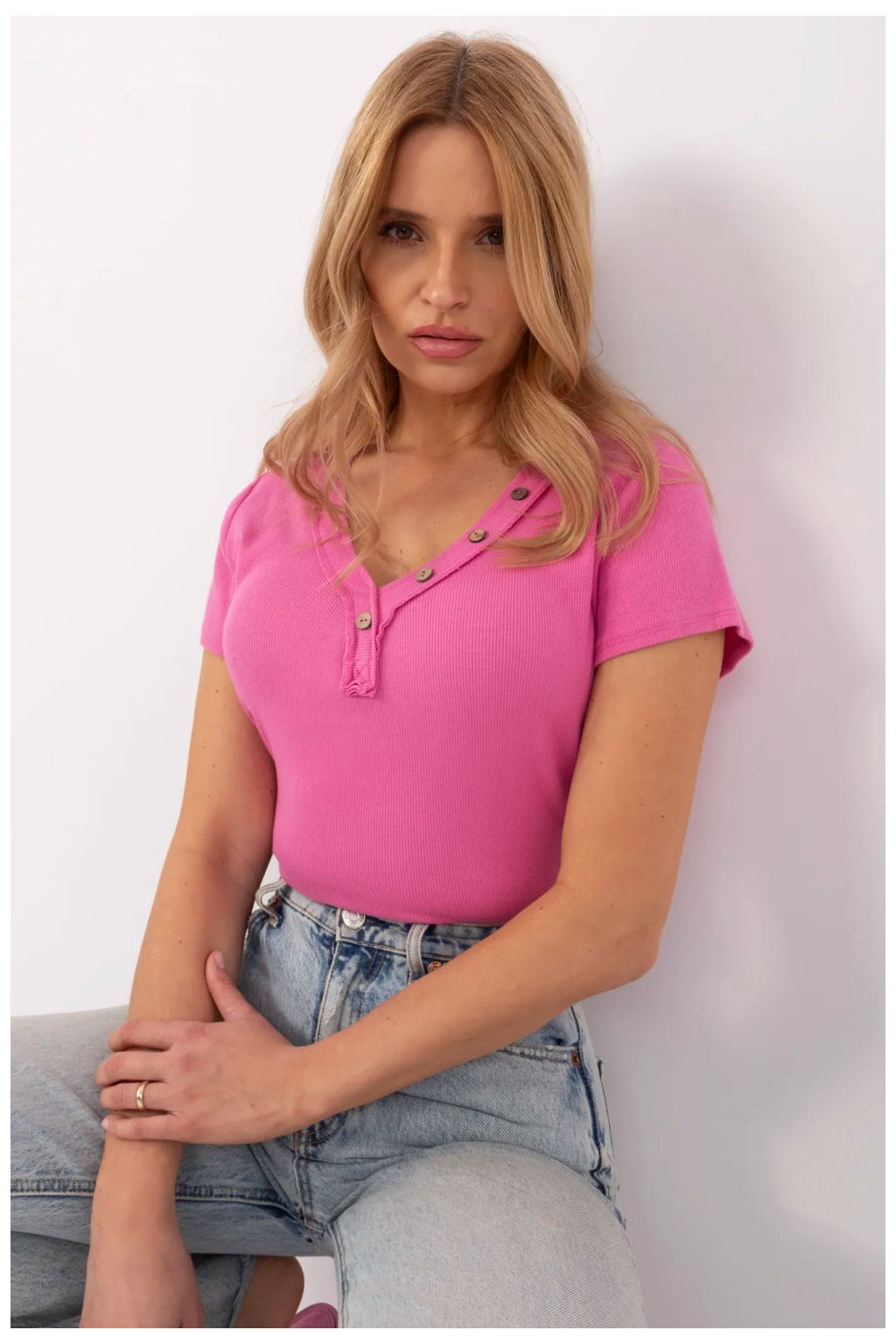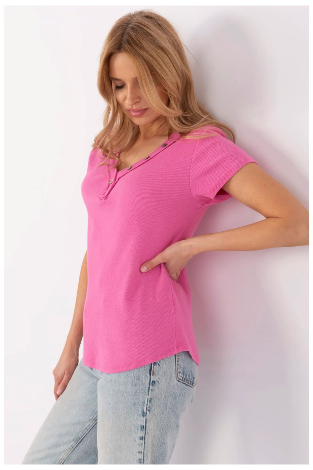 Přizpůsobený každodenní top v casual stylu, ideální na každý den i do práce. Vyrobený z vysoce kvalitní bavlny s přídavkem elastanu, co zajišťuje pohodlí nošení a lehkou pružnost. Hladký materiál s podélnou strukturou přidává jemnou texturu a ozdobné knoflíky jsou stylovým doplňkem. Top má standardní délku, krátké rukávy a ženský výstřih do V, který zdůrazňuje krk a dekolt. Skvěle se přizpůsobuje postavě, tvoří univerzální kus oblečení pro mnoho příležitostí.