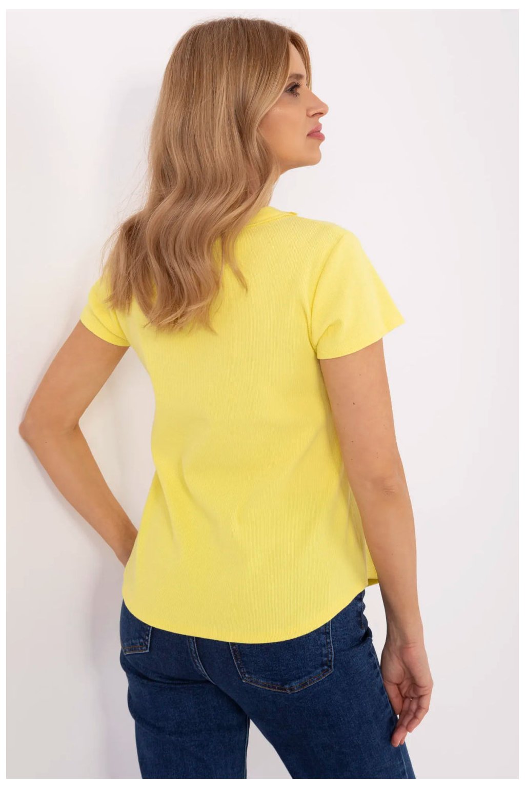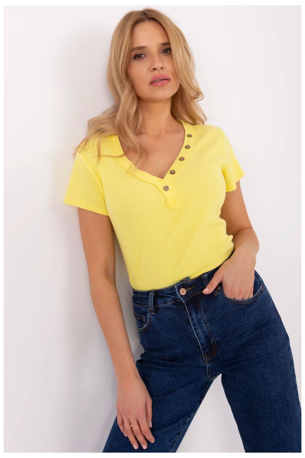 Přizpůsobený každodenní tričko v casual stylu, ideální na každý den i do práce. Vyrobené z vysoce kvalitní bavlny s přídavkem elastanu, co zajišťuje pohodlí nošení a lehkou pružnost. Hladký materiál s pruhovanou strukturou přidává jemnou texturu a ozdobné knoflíčky jsou stylovým akcentem. Tričko má standardní délku, krátké rukávy a ženský výstřih do V, který zdůrazňuje krk a dekolt. Skvěle padne ke siluetě, tvoří univerzální kousek oblečení na mnoho příležitostí.