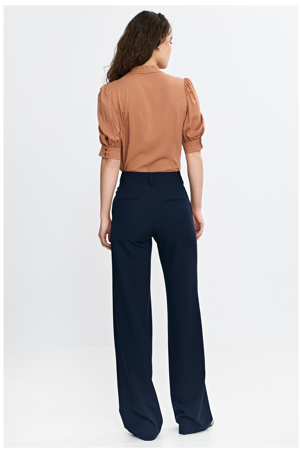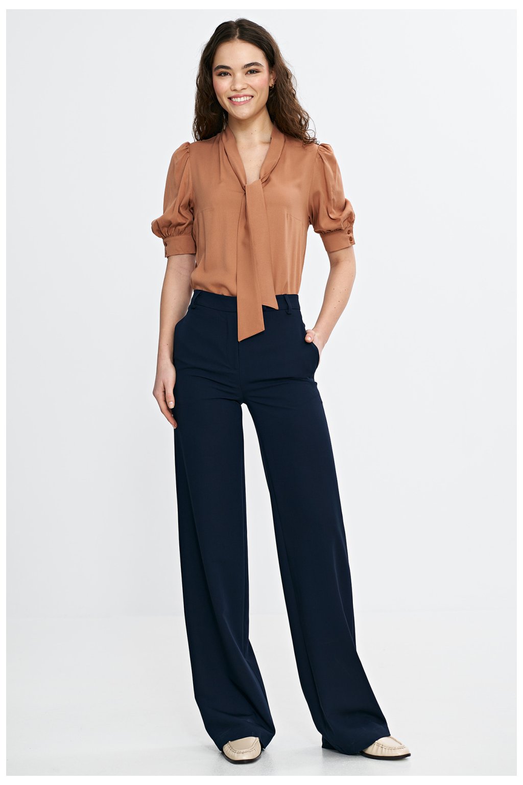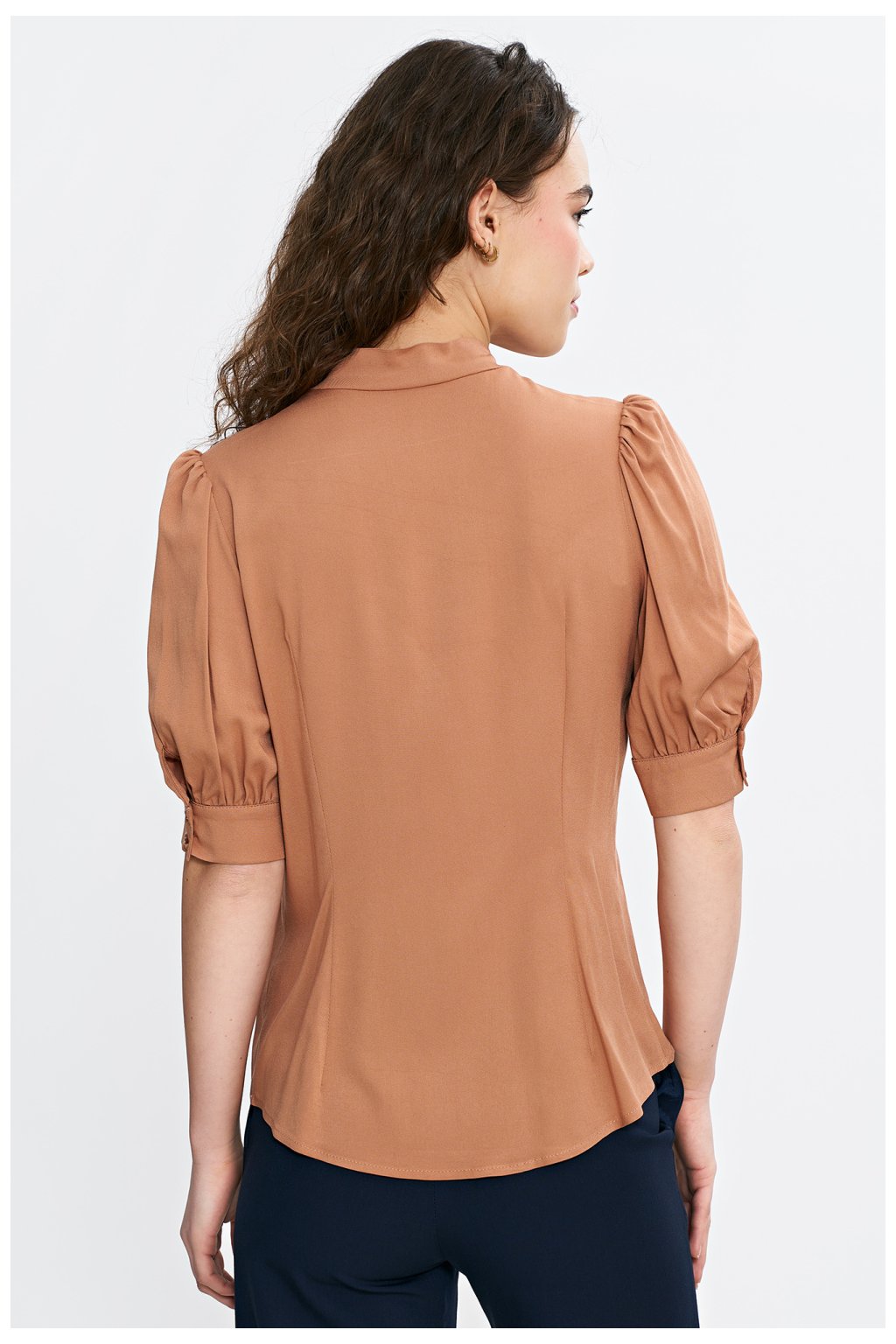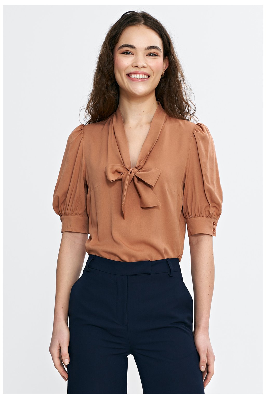 Elegantní blůza s pravidelným střihem, vyrobena z lehké a prodyšné viskózy. Výstřih ve tvaru písmene V s ozdobným vázáním dodává eleganci a jemně zdůrazňuje krk. Rukávy po loket s jemnými nafouklými detaily a manžetou dodávají celku ženský charakter. Model se nasazuje přes hlavu, ideální jak pro každodenní, tak pro elegantní styling.