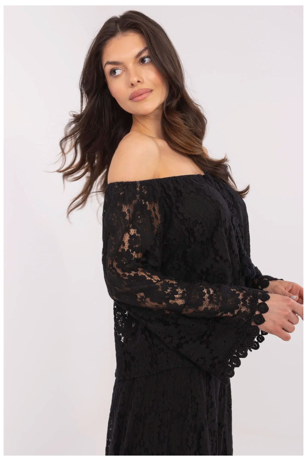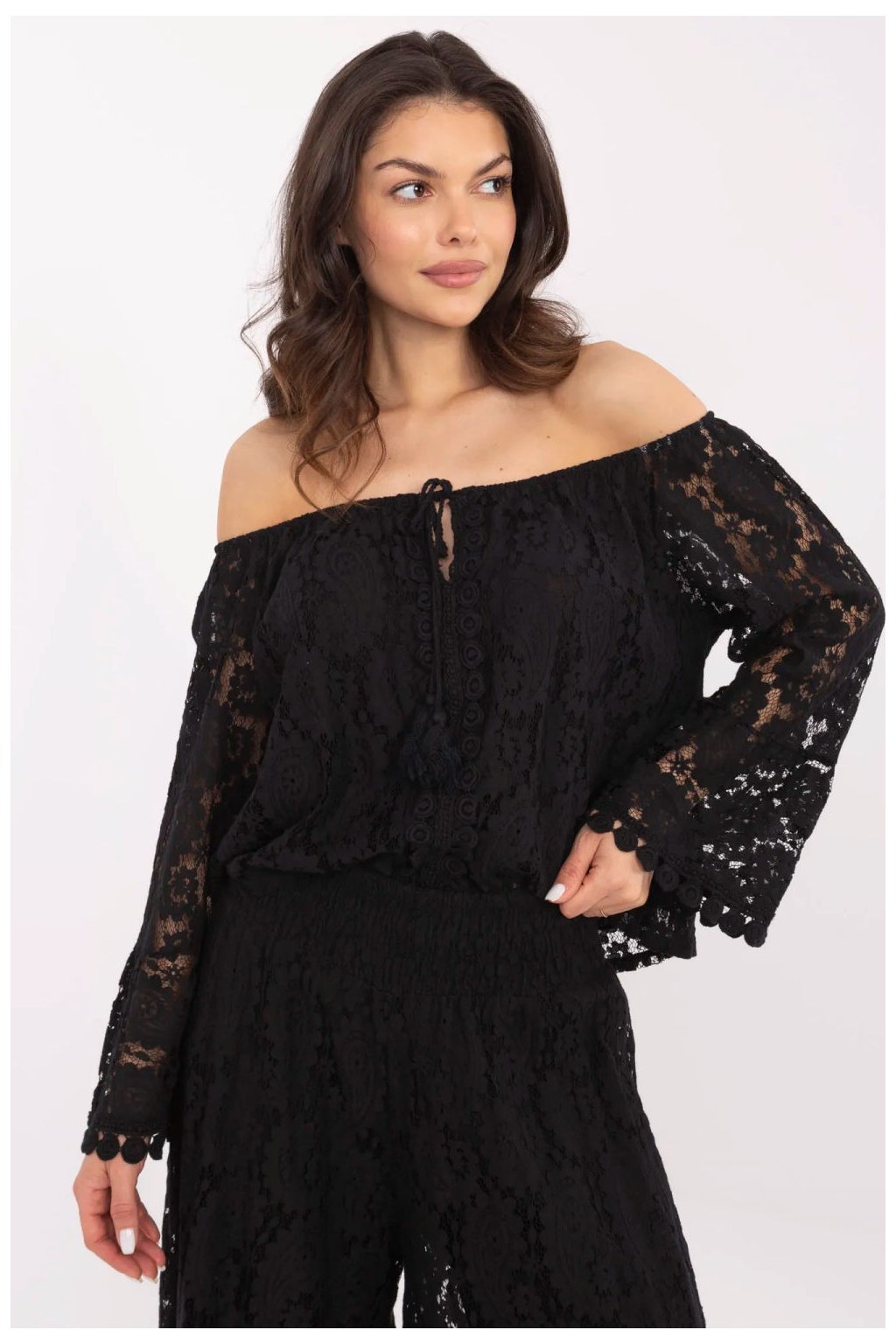 Elegantní blůza z krajkové krajky je ženskou a stylovou volbou pro mnoho příležitostí, od každodenního stylu po více formální výlety nebo večírky. Vyrobená z vysoce kvalitní směsi bavlny a nylonu s jemnou podšívkou poskytuje pohodlí a efektní dokončení. Krátká délka a španělský výstřih krásně zdůrazňují ramena, čímž celku dodávají smyslný charakter. Dlouhé rukávy z jemné krajky dodávají lehkost a šněrování vpředu zdůrazňuje pas a vnesuje do outfity romantický akcent. Blůza skvěle ladí jak s elegantními kalhotami, tak s sukní ideální na schůzky, do práce nebo večerní výlety. Jedná se o kombinaci elegance a moderního stylu, která vždy udělá dojem.