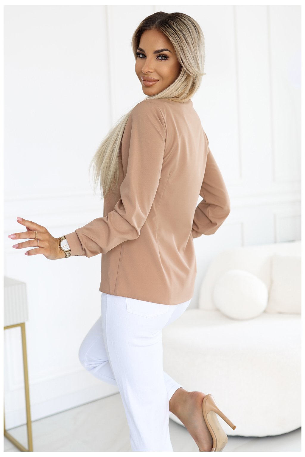 Elegantní podniková blůza v odstínu mocha mousse je must-have v šatníku každé stylové ženy. Klasický střih s dlouhým rukávem, širokými manžetami a efektním vázáním pod krkem ve formě mašle zaručuje, že se blůza skvěle hodí jak do kanceláře, tak i na formální setkání. Vyrobená z vysoce kvalitního, příjemného na dotek materiálu se dobře přizpůsobuje postavě, poskytujíc pohodlí po celý den. Střízlivá barva mocha mousse krásně ladí s bílou, černou a dalšími klasickými barvami, nabízí mnoho možností stylizace.